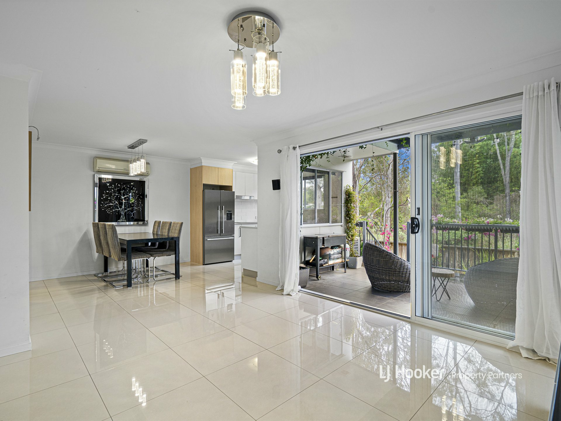 Air-conditioned for all-season comfort, the combined social space sparkles with overhead lighting in abundance - a quartet of glass-encased feature lights make a statement over the dining table space, while a chic cluster of the same light, this time tiered for a statement effect, provides a stunning focal point in the centre of the adjacent lounge.