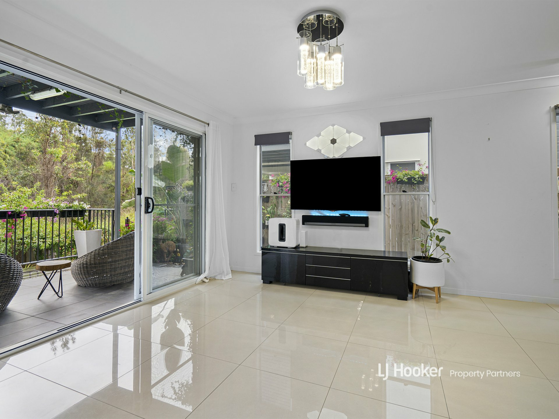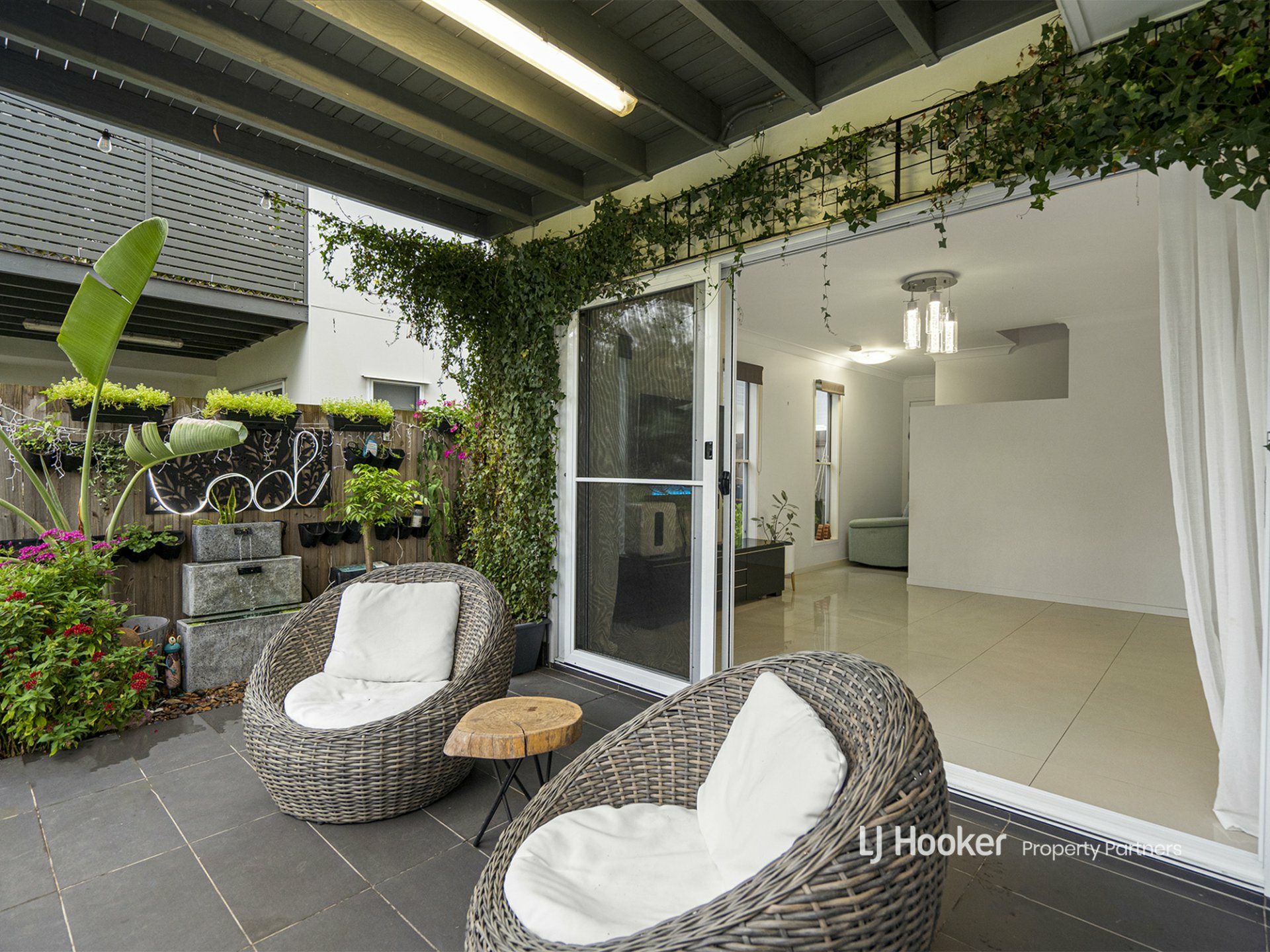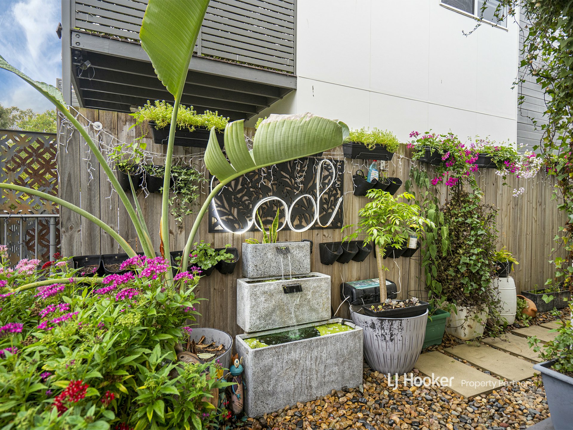 A big bank of glass sliders extends the living room onto a fantastic, paved patio area - powered for night-time entertaining and embraced by well-tended climbing plants. There's ample room out here for a BBQ station and either an outdoor dining table or some comfy loungers - maybe both! We also love the timber fencing and cascading water feature.