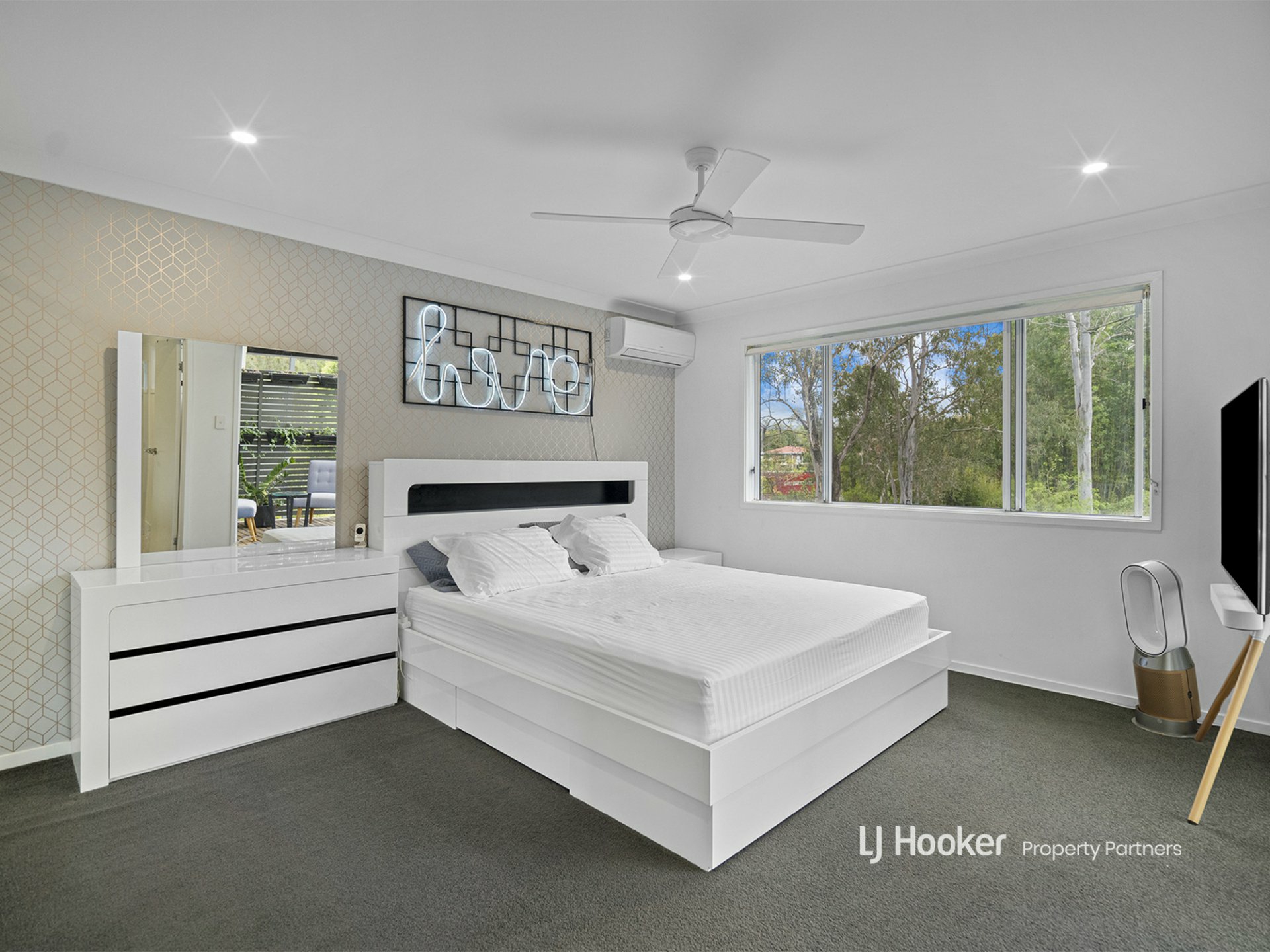 To the master and here's where it gets luxe. This mega-spacious room has a wallpapered feature wall that brings elegance to the space and an expansive bank of windows to capture uninterrupted bushland views. The ensuite offers a large glass-framed shower recess, another floating vanity, big mirror and sparkling chrome tapware.