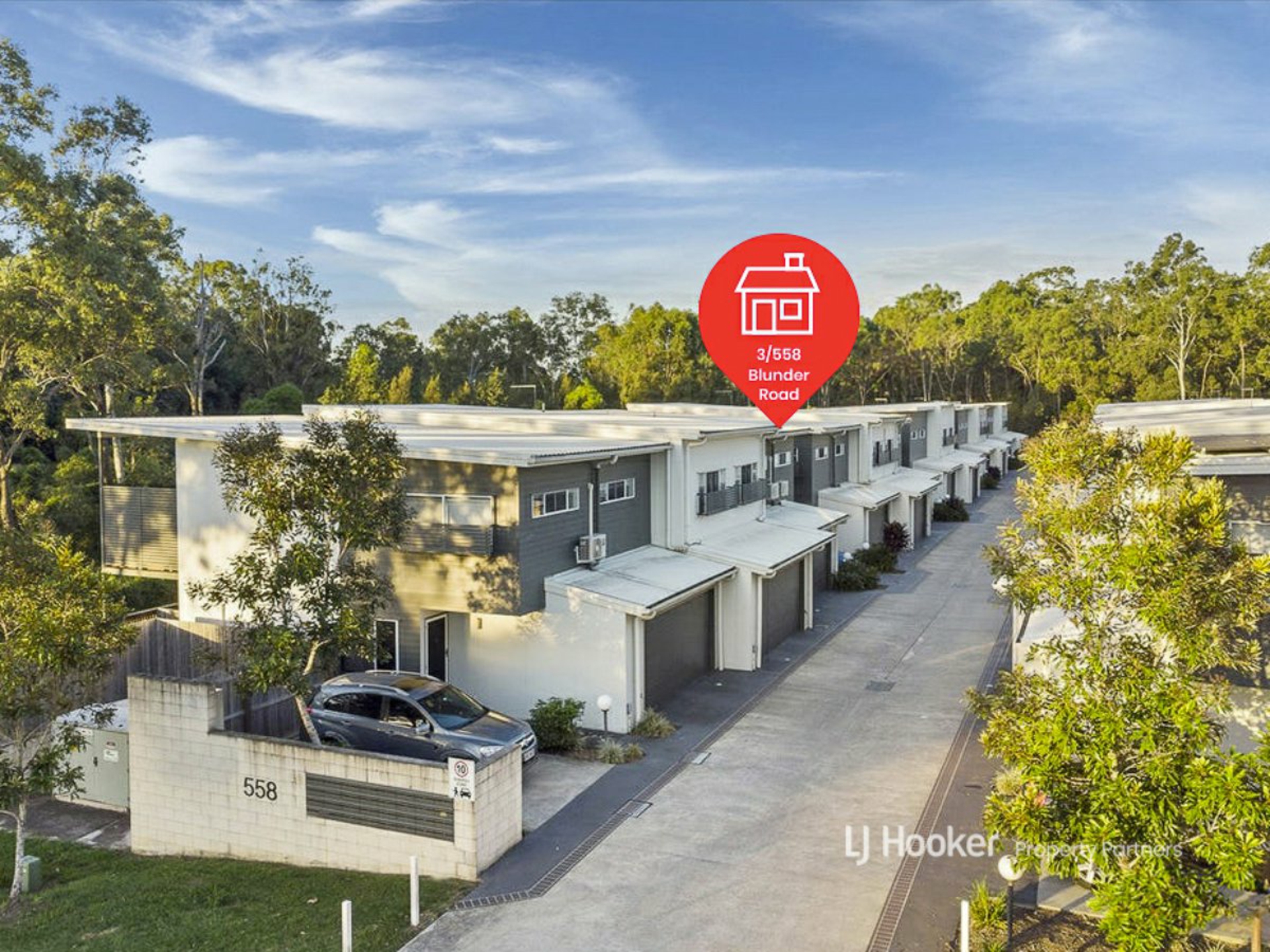 The verdant gardens and leafy rear views that come with backing onto bushland, elude you on arrival at this townhouse because, out front, the property is all sleek off-white render with contrasting grey-toned cladding across its two floors.