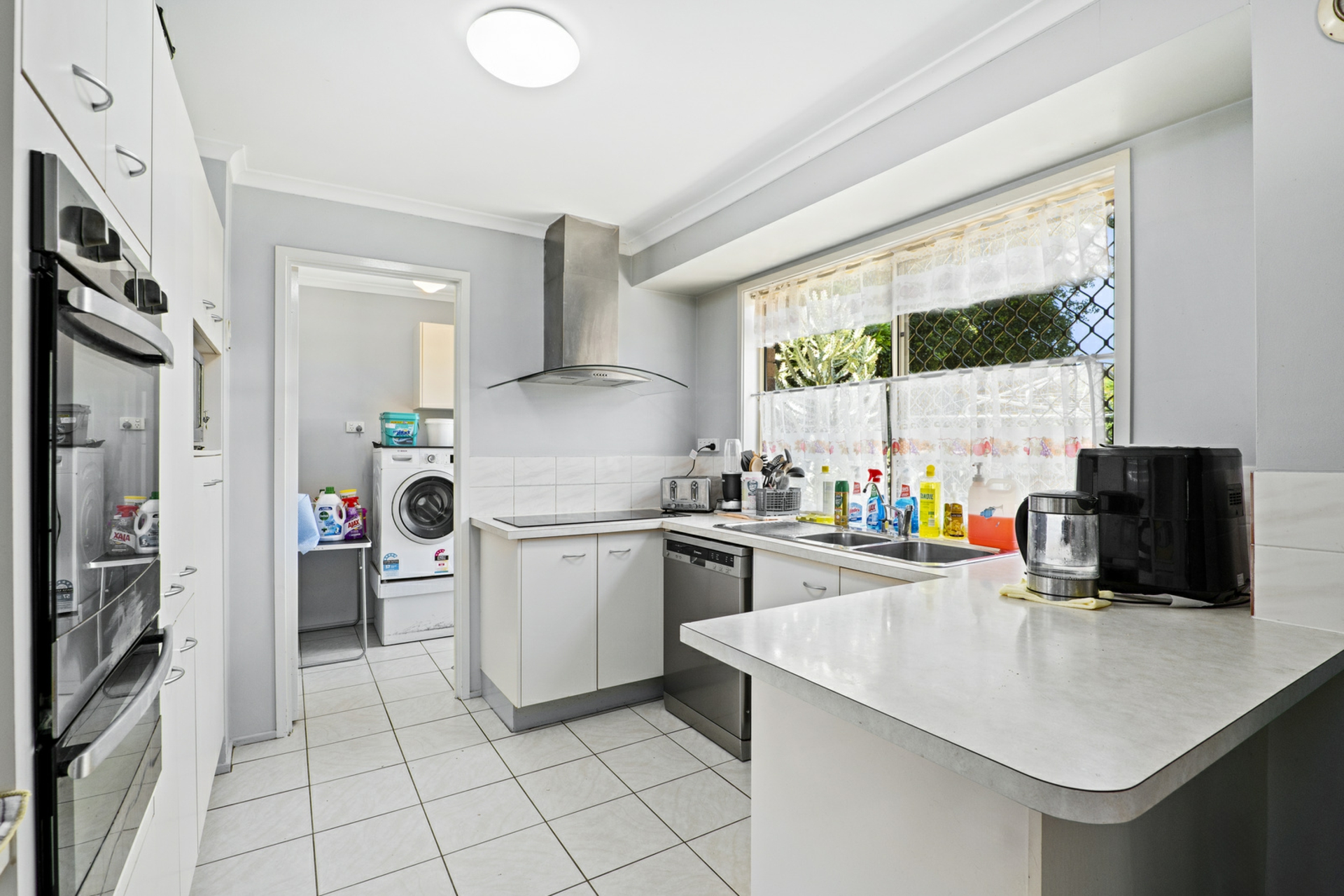 Functional Kitchen: Fitted with ample cabinetry, modern appliances, fitted dishwasher and a sleek rangehood, the kitchen offers a practical layout that connects to the laundry and outdoor area.
