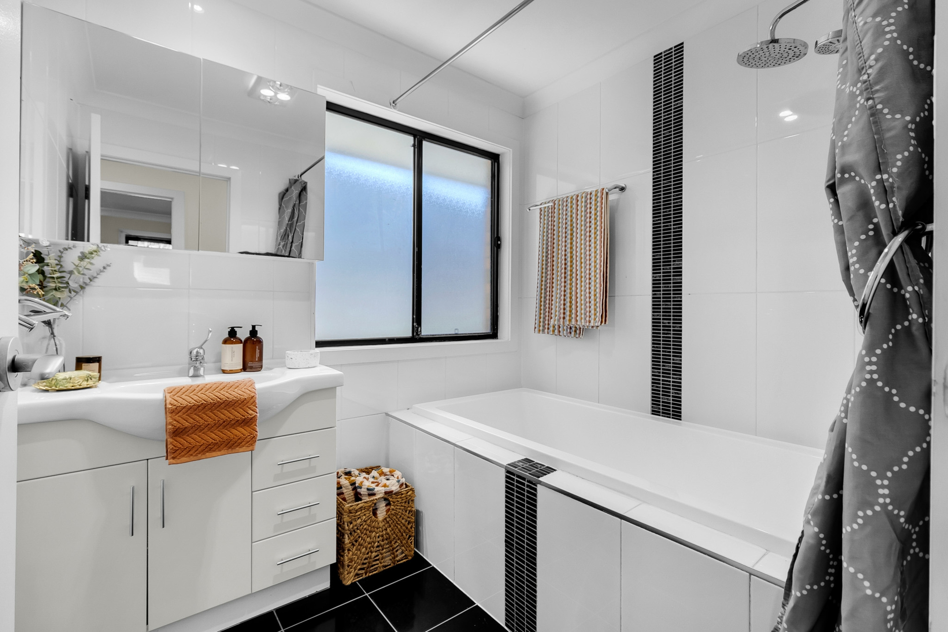 • Stylish, modern bathroom with floor-to-ceiling tiles and bath-over-shower