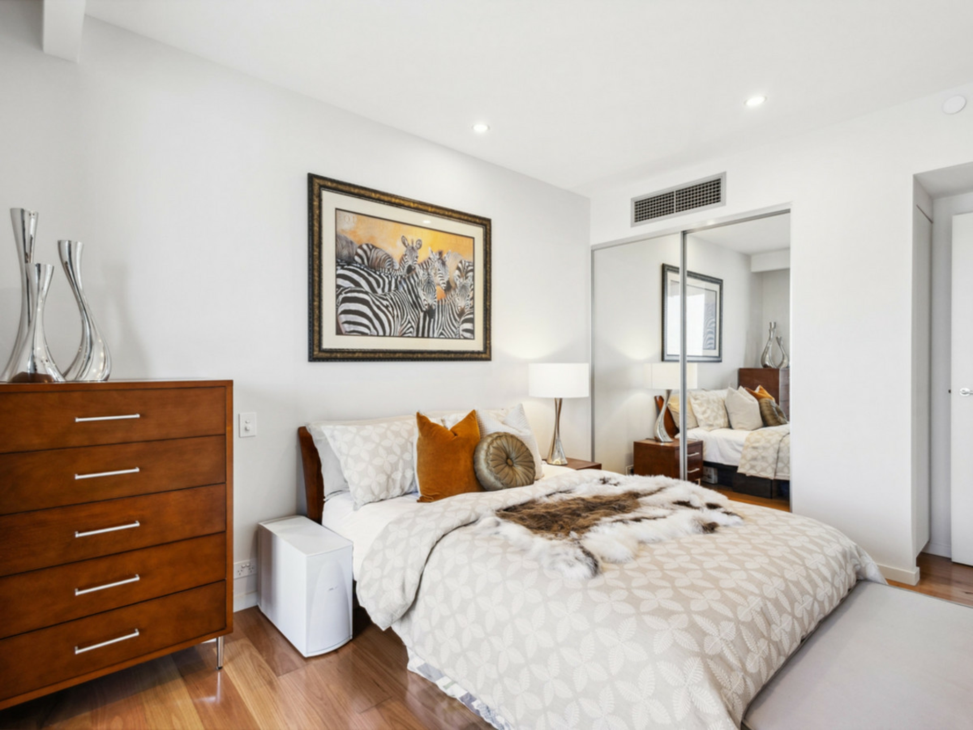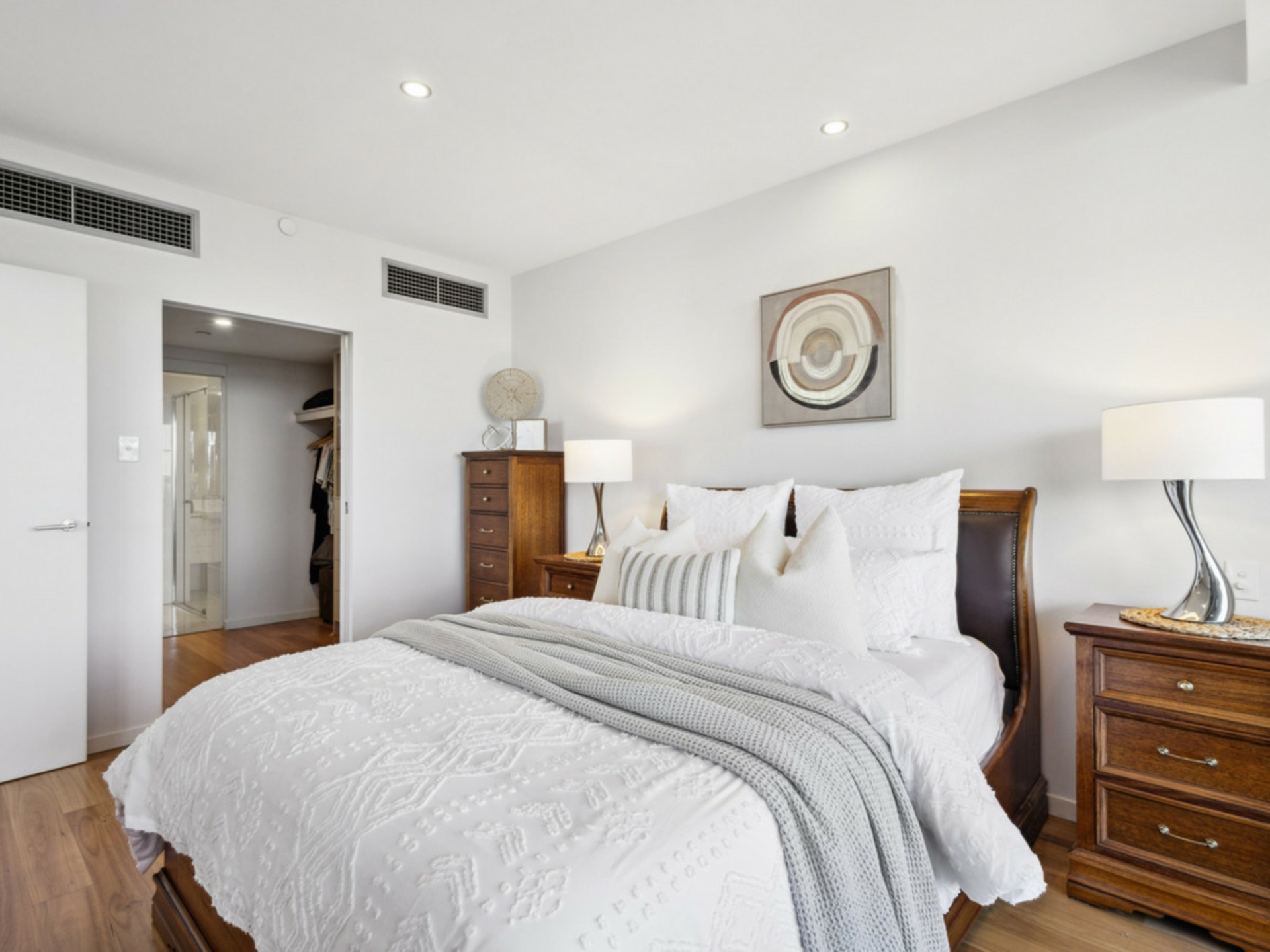 Master bedroom with walk through robes leading to the ensuite with double vanities