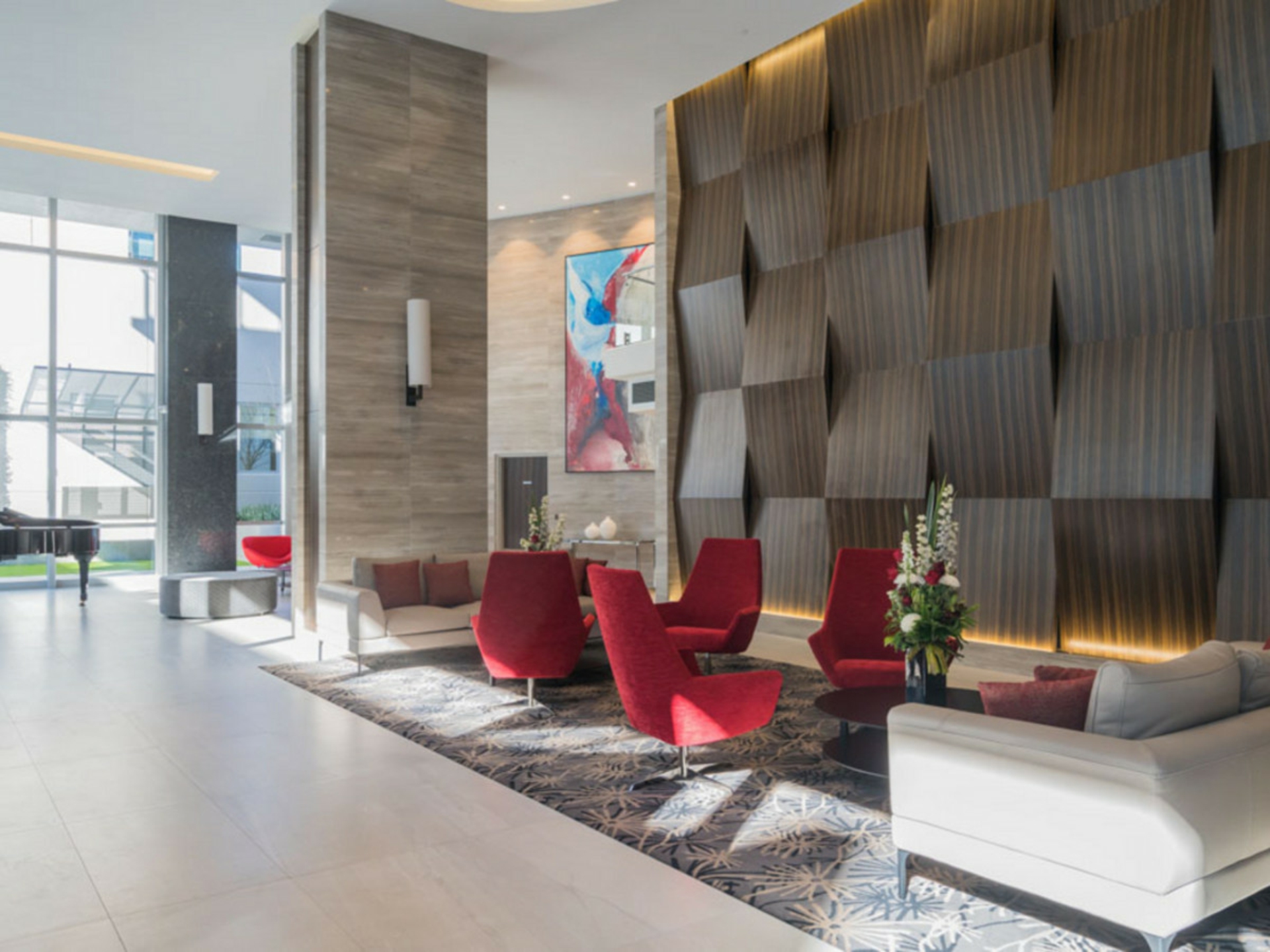 Impressive double height tower lobby with a piano that you can either play, or turn on and it plays itself with many of the saved tunes in its memory.