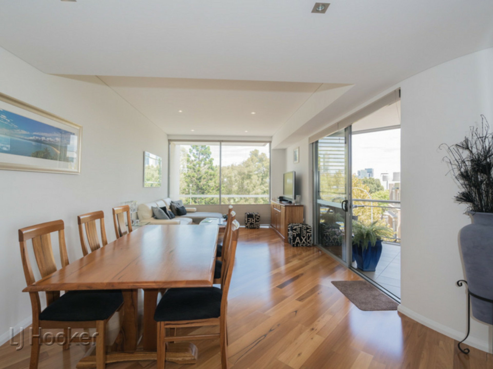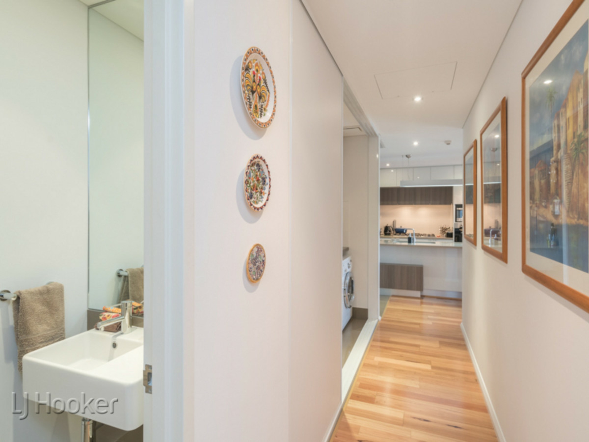 Entry into the apartment has a sea of finished timber flooring, a kitchen that splendidly overlooks a comfortable open-plan living and dining area whilst boasting sparkling stone bench tops, stylish light fittings, double sinks, a gas cooktop, integrated range-hood, oven and dishwasher appliances and sleek white cabinetry.