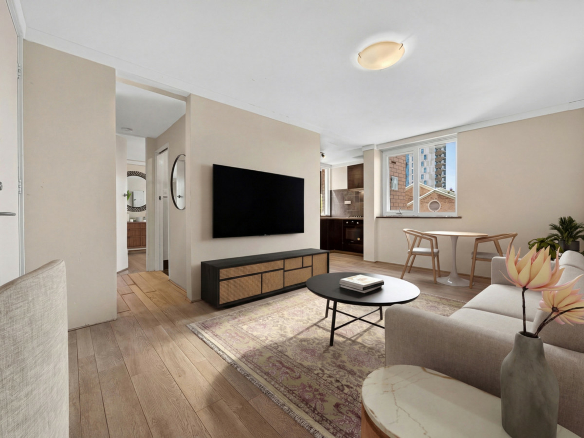 Inside, the apartment opens to a spacious living and dining area that feels welcoming and relaxed, with large windows inviting in natural light. The open layout provides plenty of flexibility for both everyday living and entertaining.