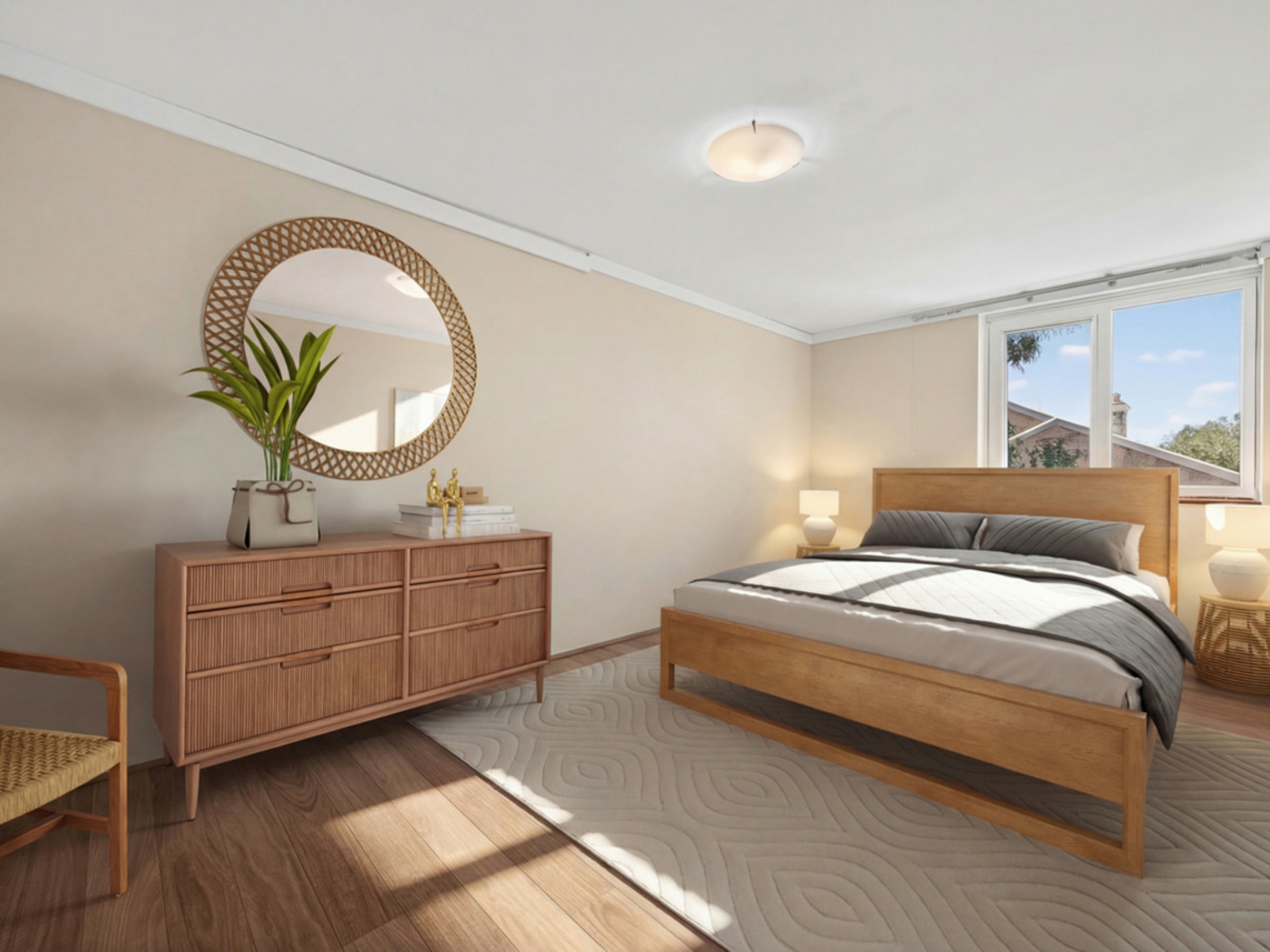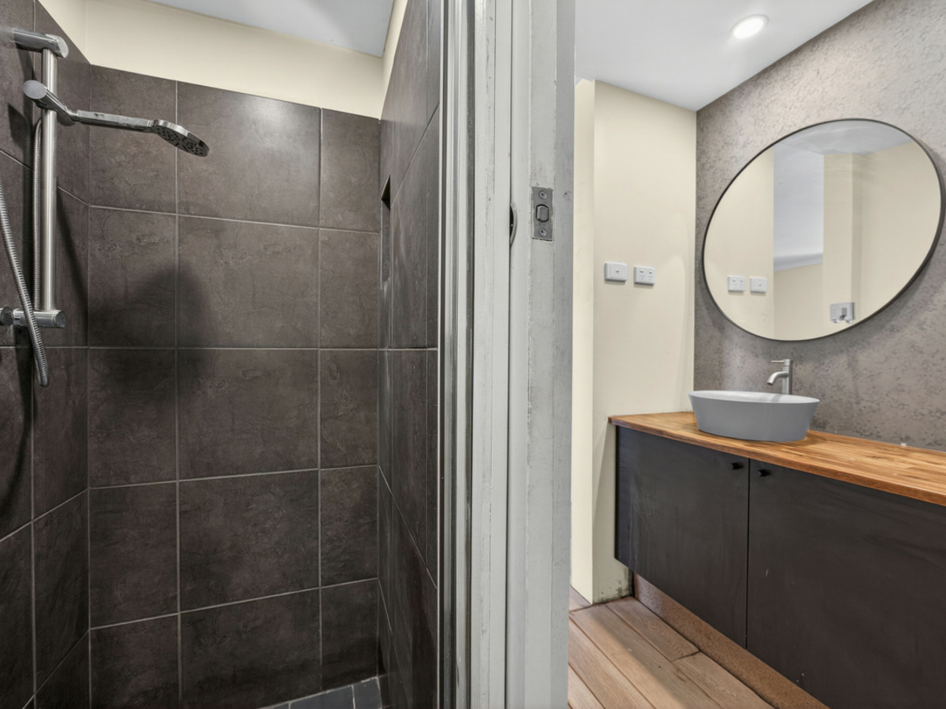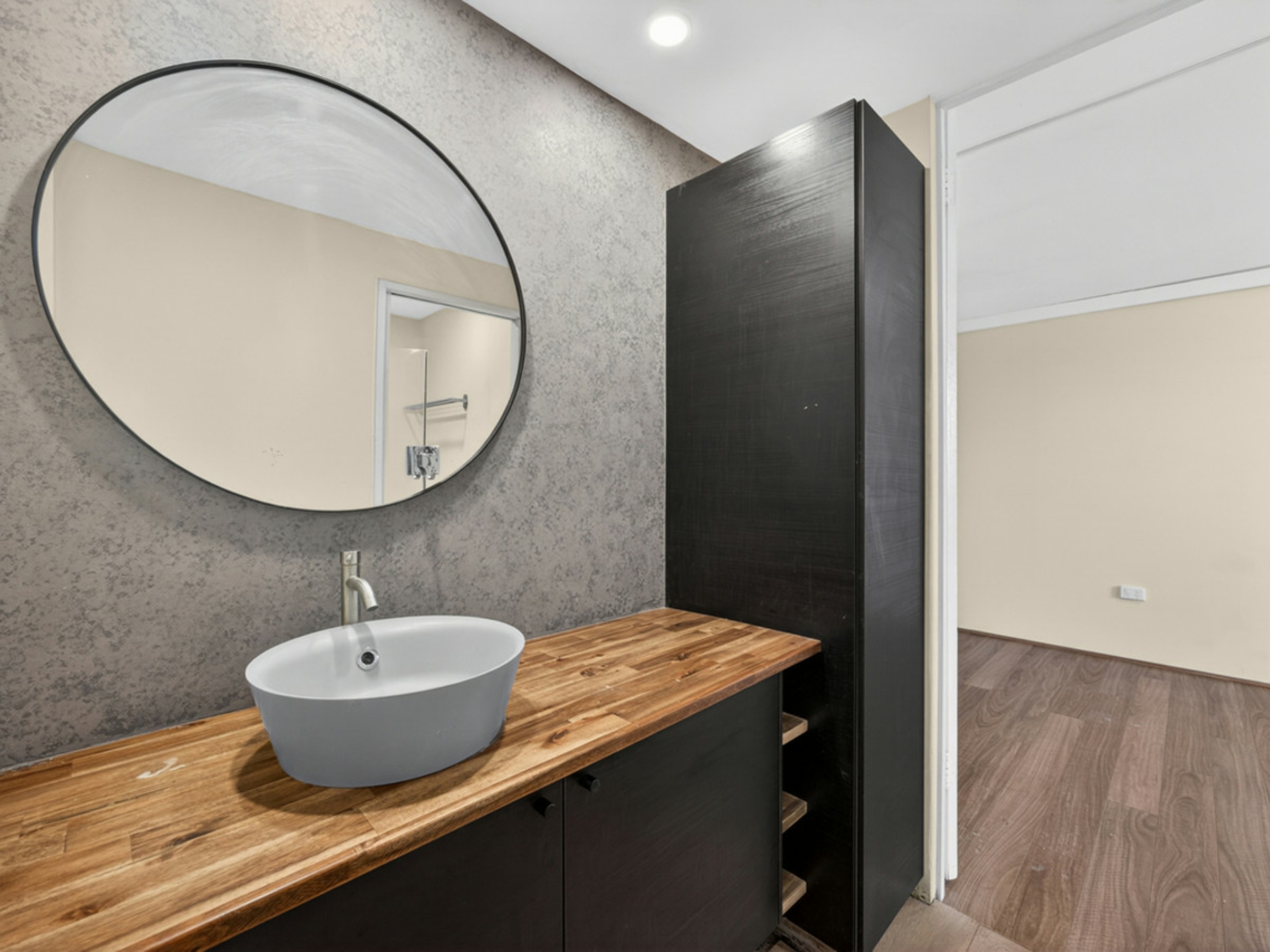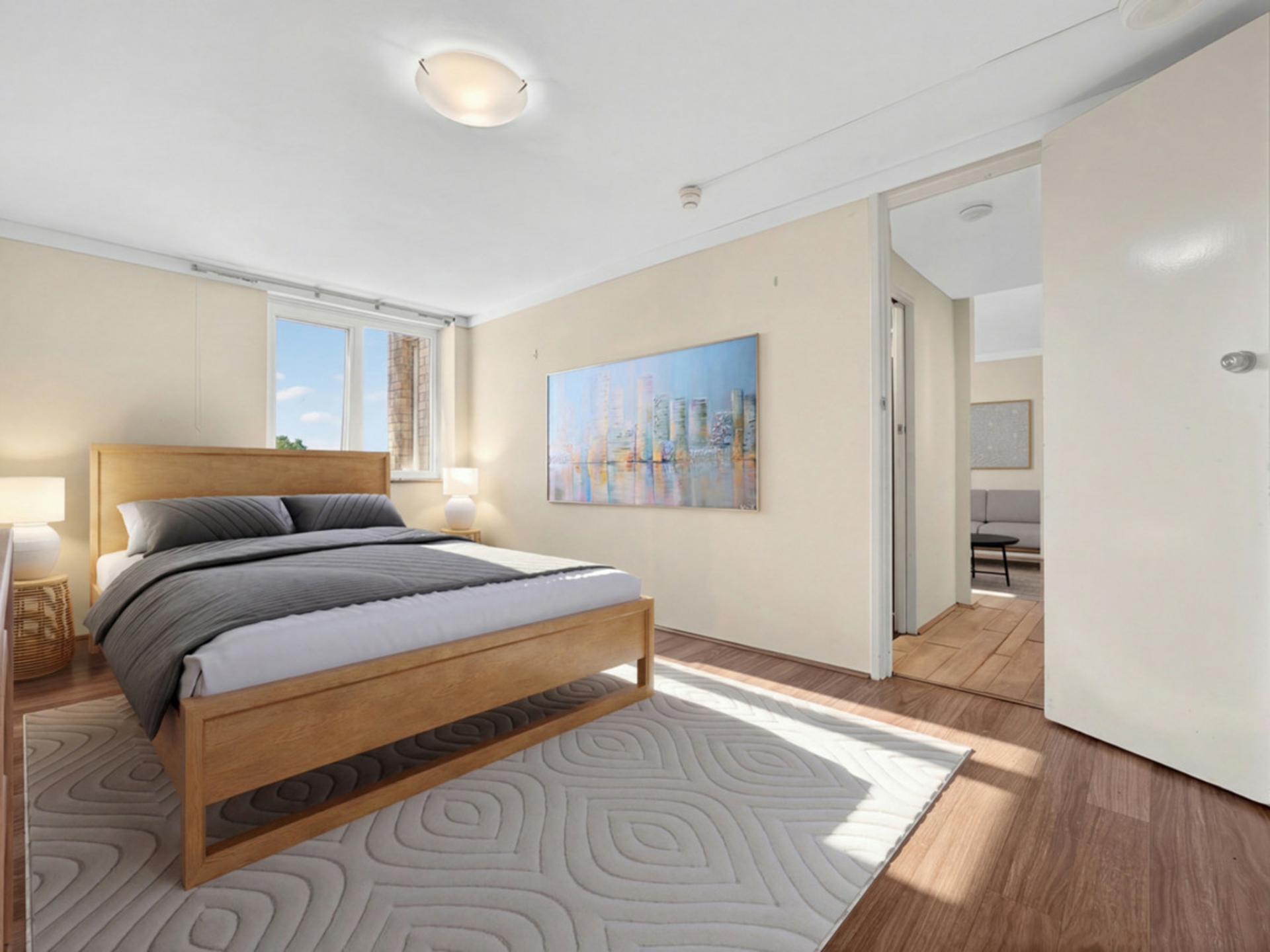 The bedroom is generously sized and filled with natural light, offering a comfortable retreat and easy access to the bathroom, through to the living areas. The bathroom has been finished with modern touches including sleek tiling, contemporary vanities and quality fittings that give the space a clean, updated feel.