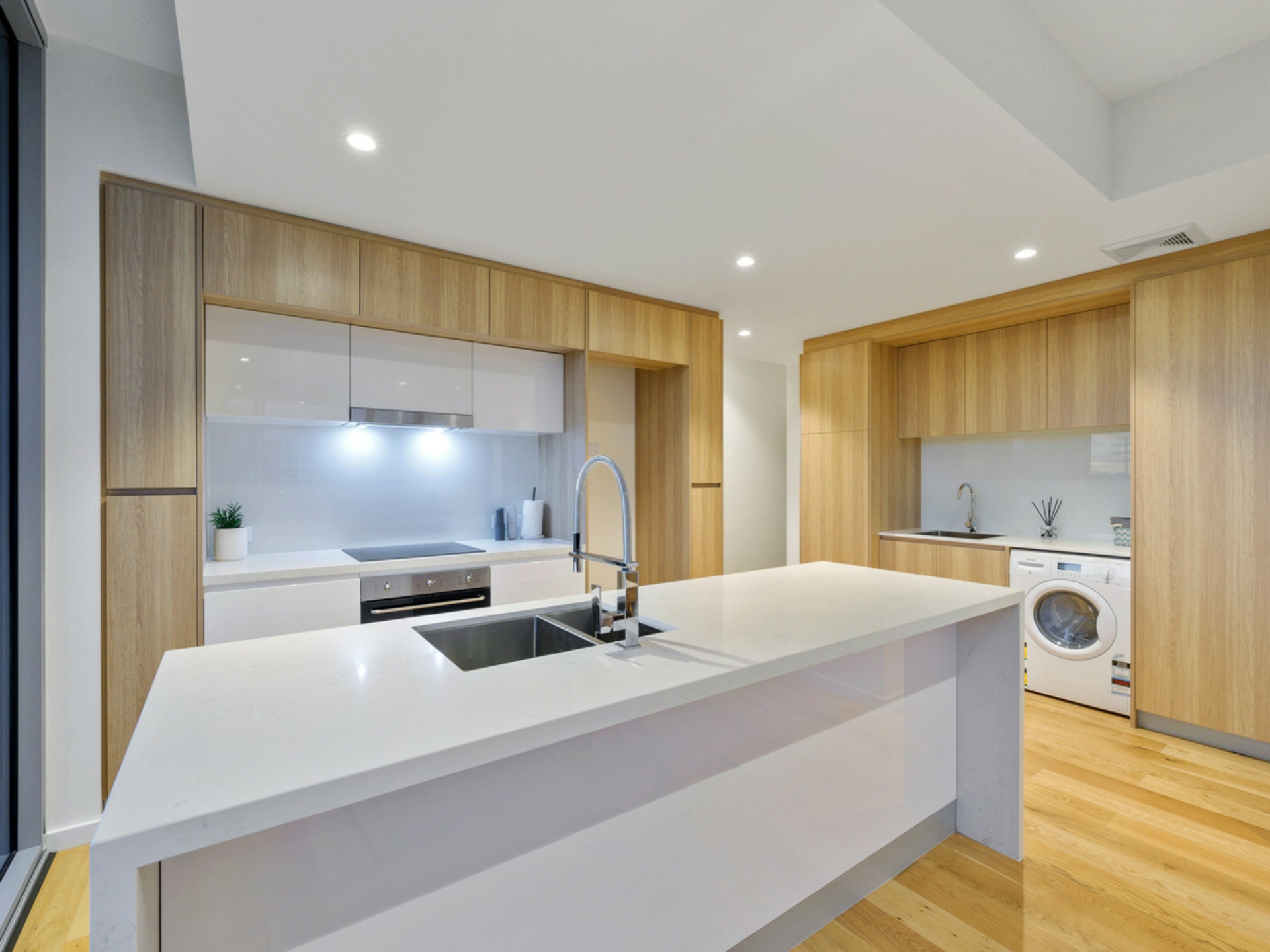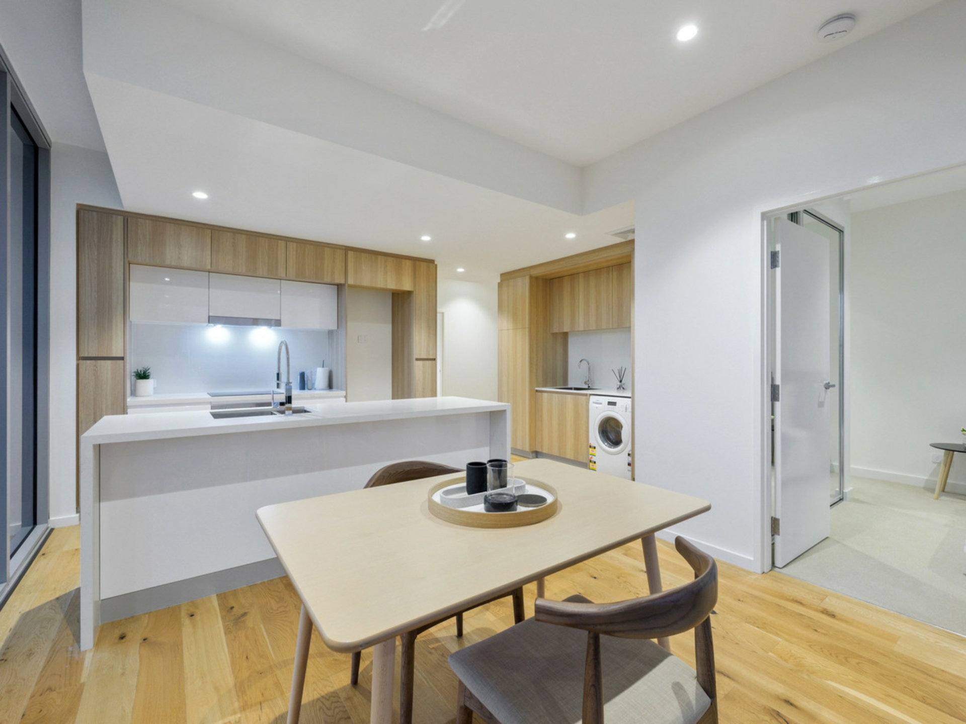 - Timber flooring to the open-plan living, dining and kitchen area