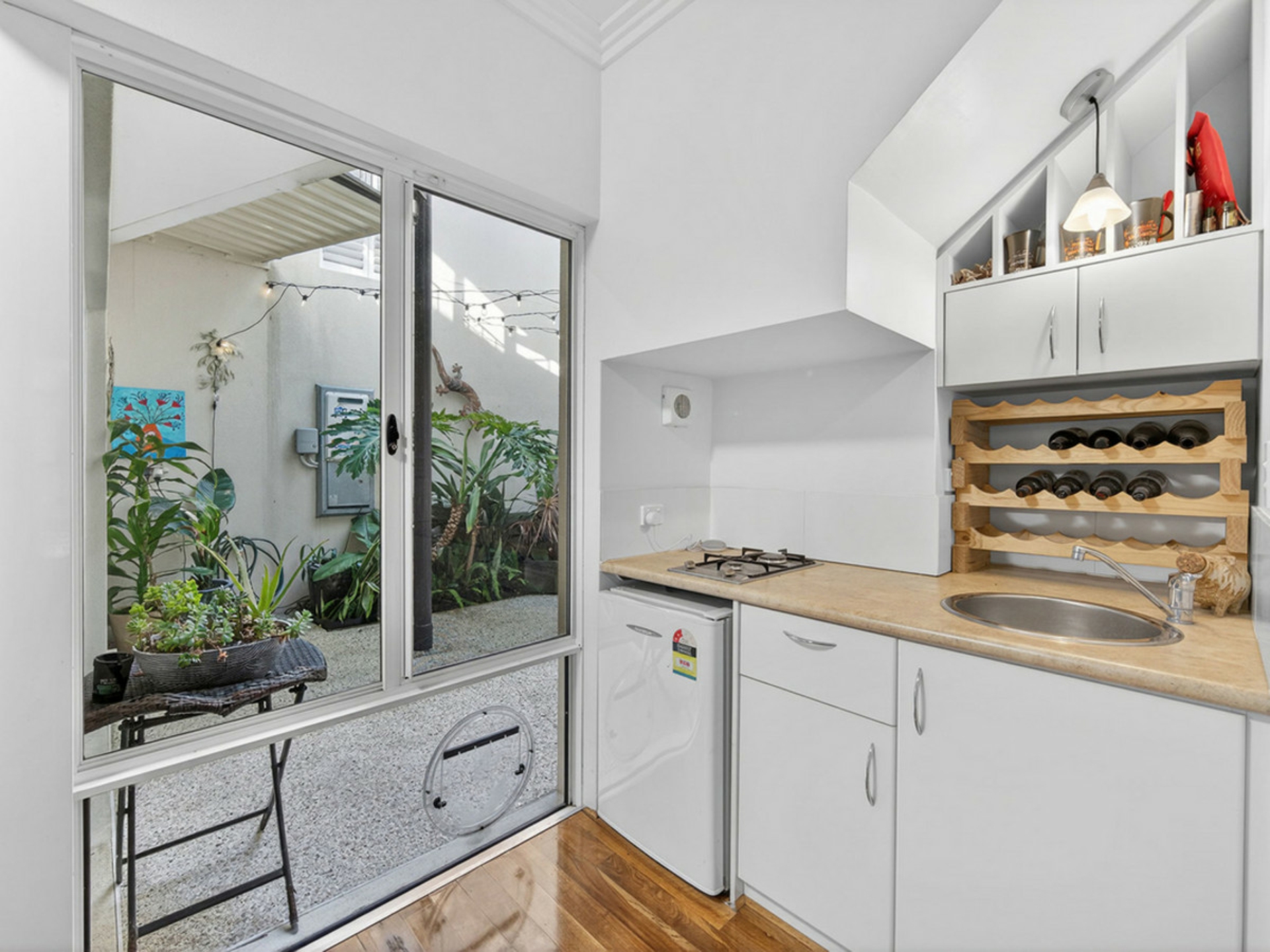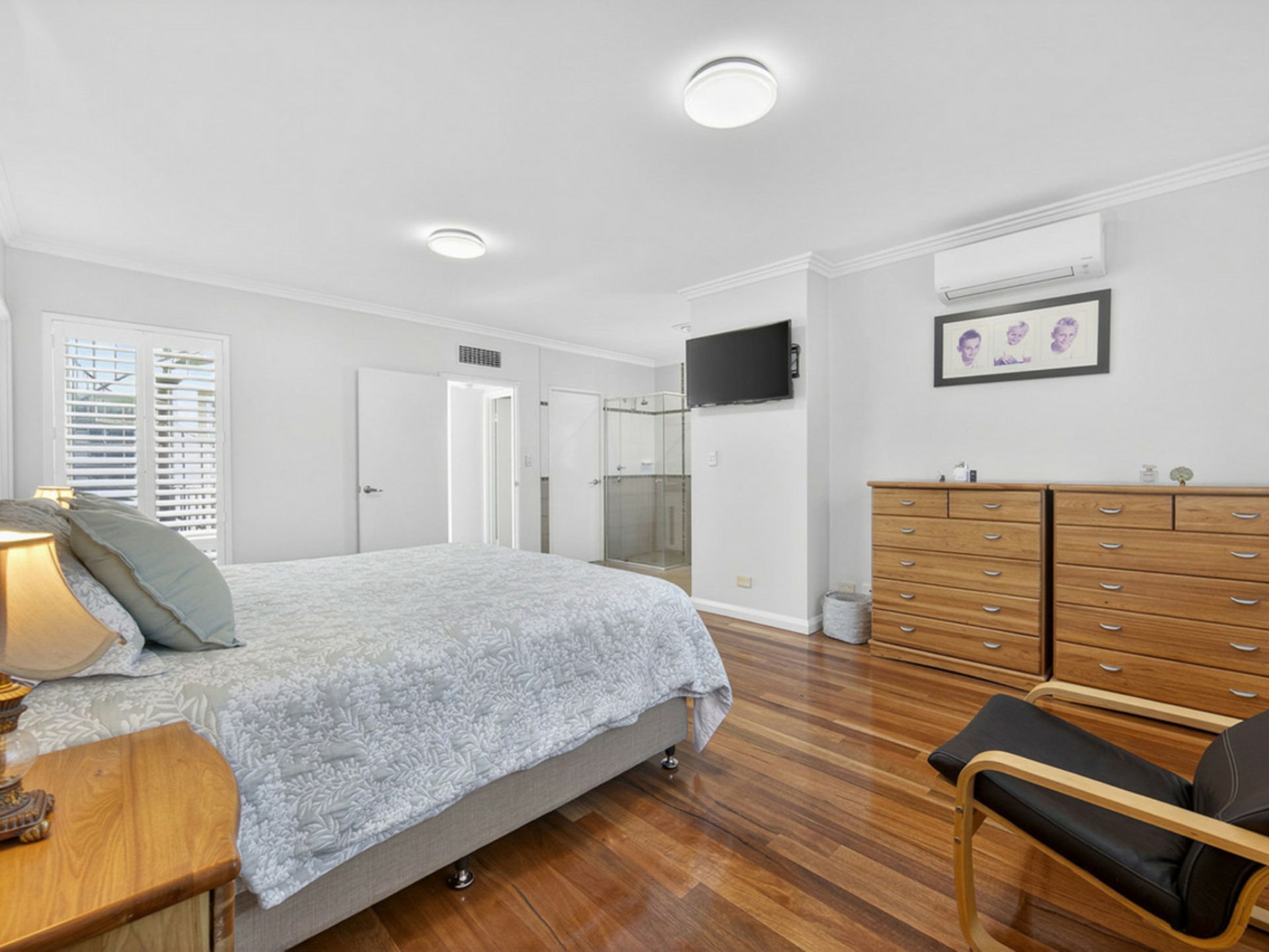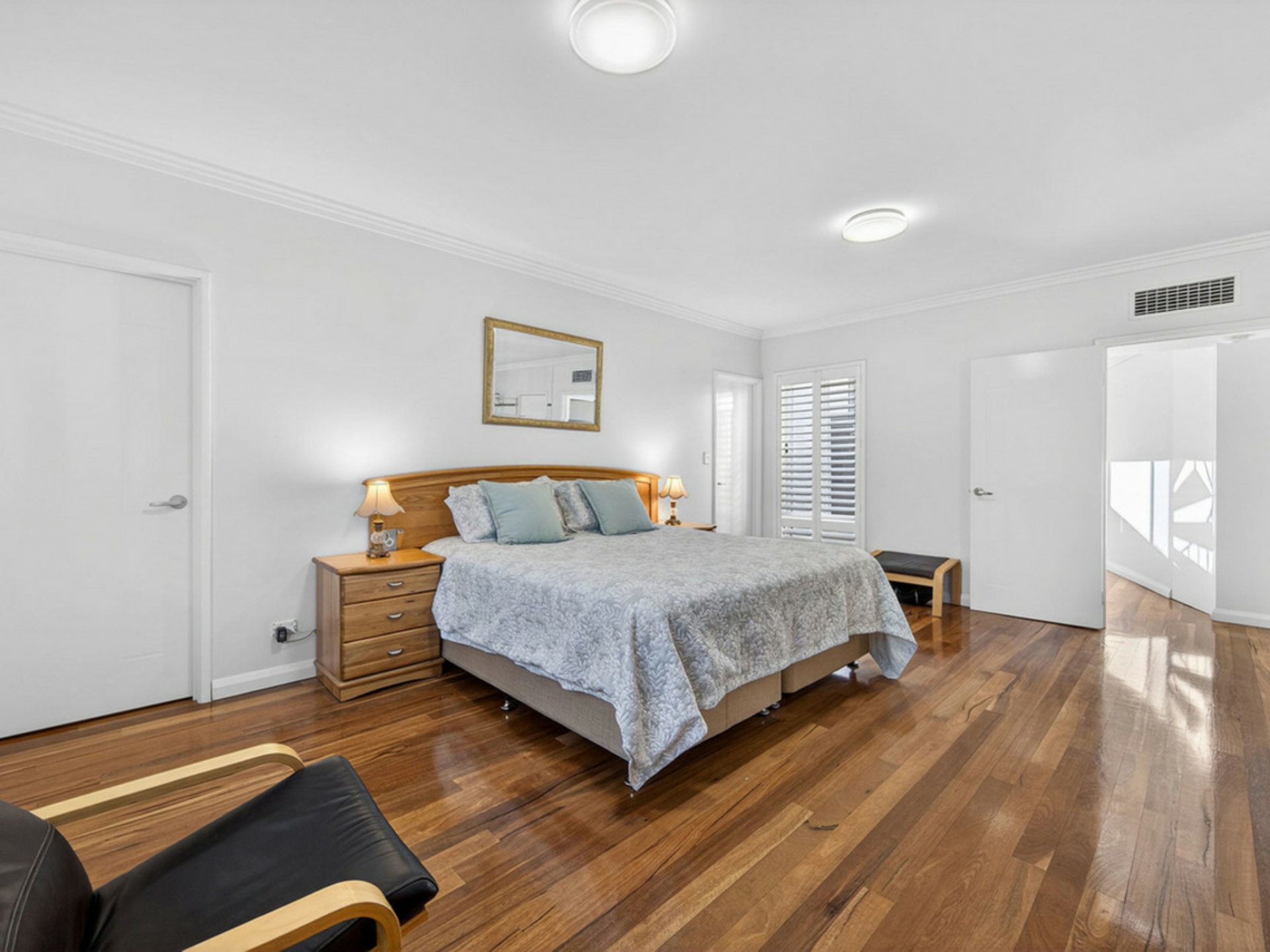 Upstairs, the first floor is anchored by a recently renovated kitchen that is both striking and highly functional. Stone benchtops and stone splashbacks are paired with a statement island featuring waterfall edges, creating a central hub for gathering. A dedicated coffee station, walk-in pantry and an impressive suite of quality appliances by Miele, Neff and Fisher & Paykel elevate the space, while warm Marri floorboards add richness and character. Bifold doors open seamlessly to a Juliette balcony, allowing fresh air and natural light to flow through the living area and enhancing the connection between indoors and out.