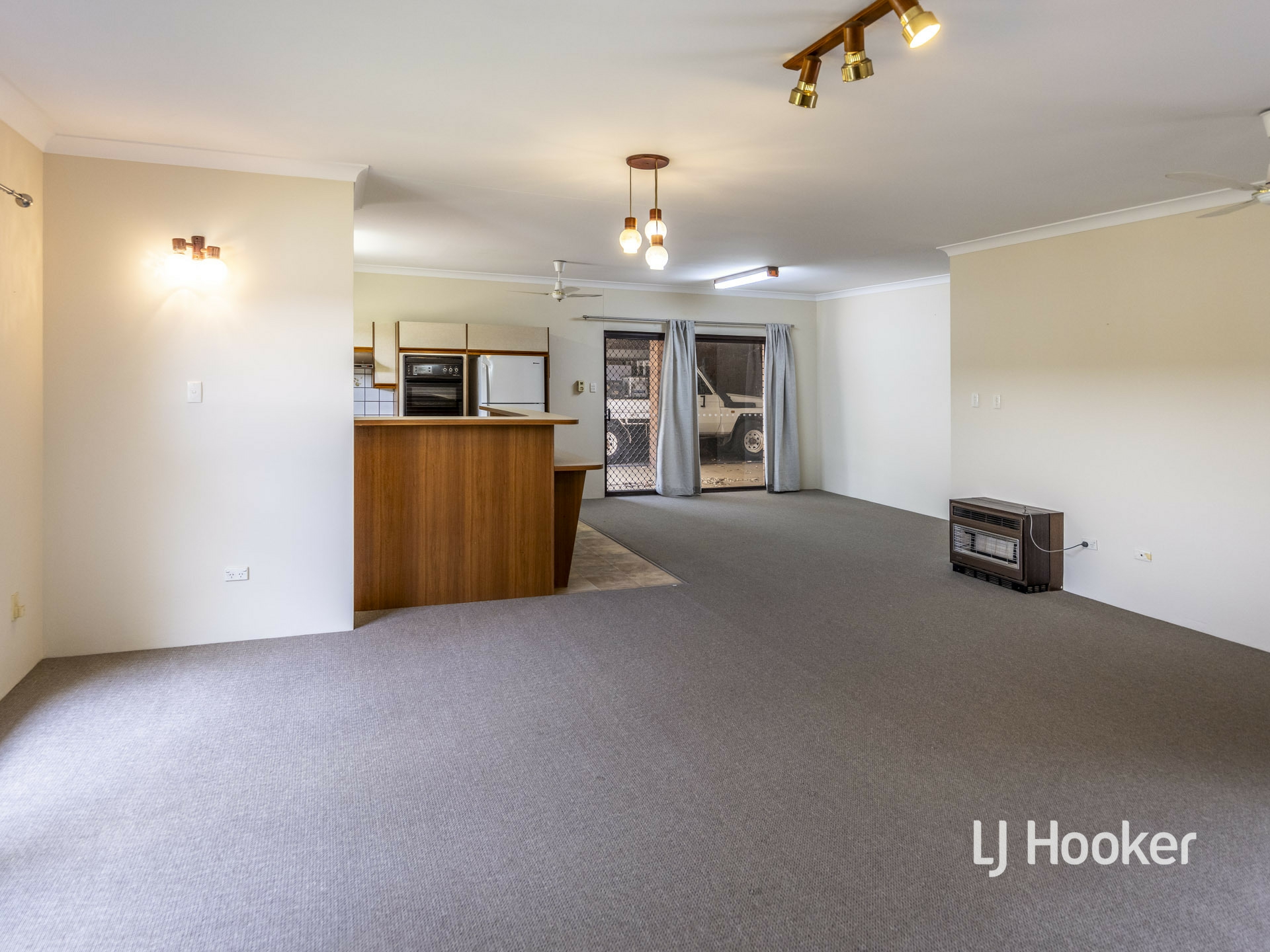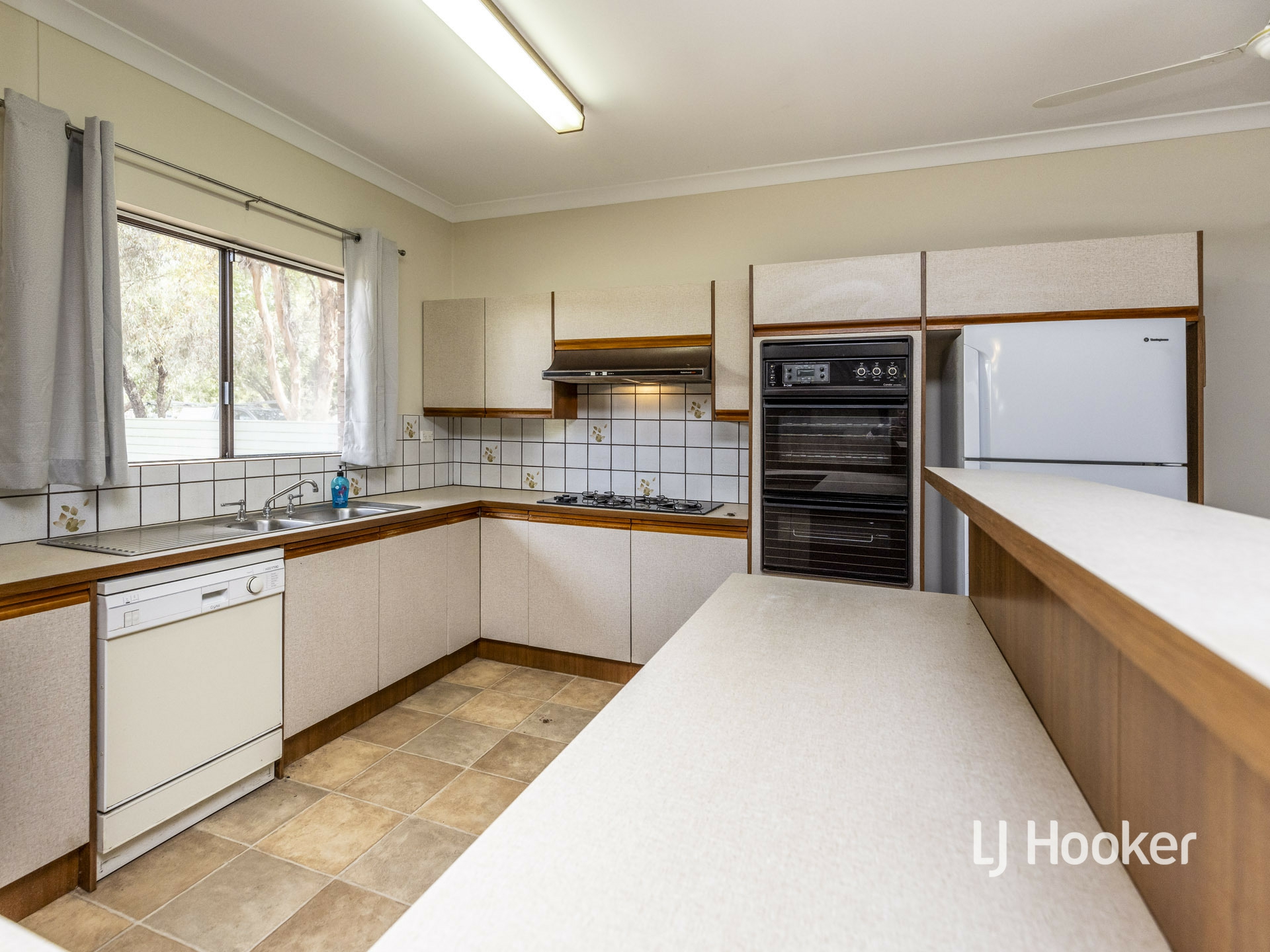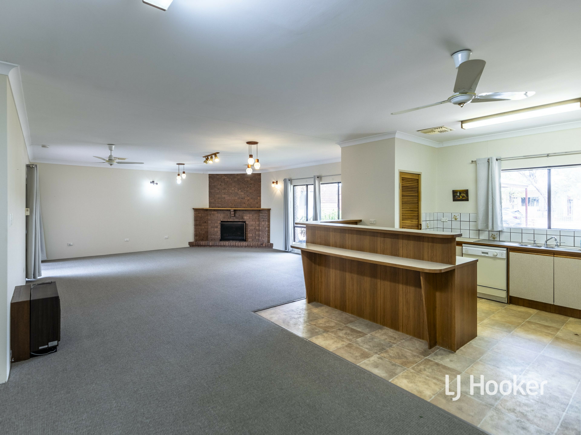 The large, open plan living area includes a spacious lounge with bricked in open fireplace, designated dining and country style gas kitchen with wall oven, grill and rangehood. The kitchen also features a walk-in pantry, dishwasher, and entertainer breakfast bar.