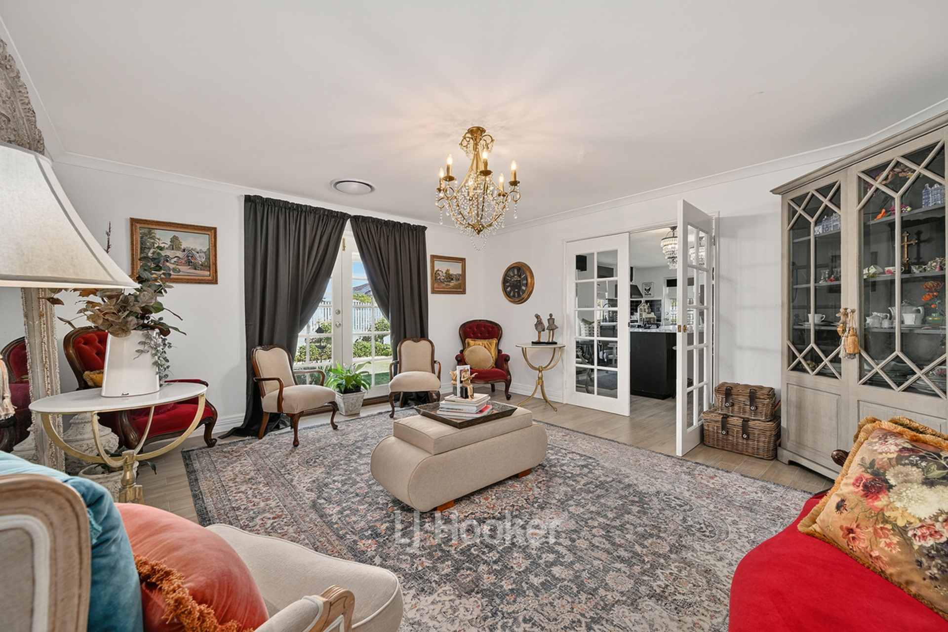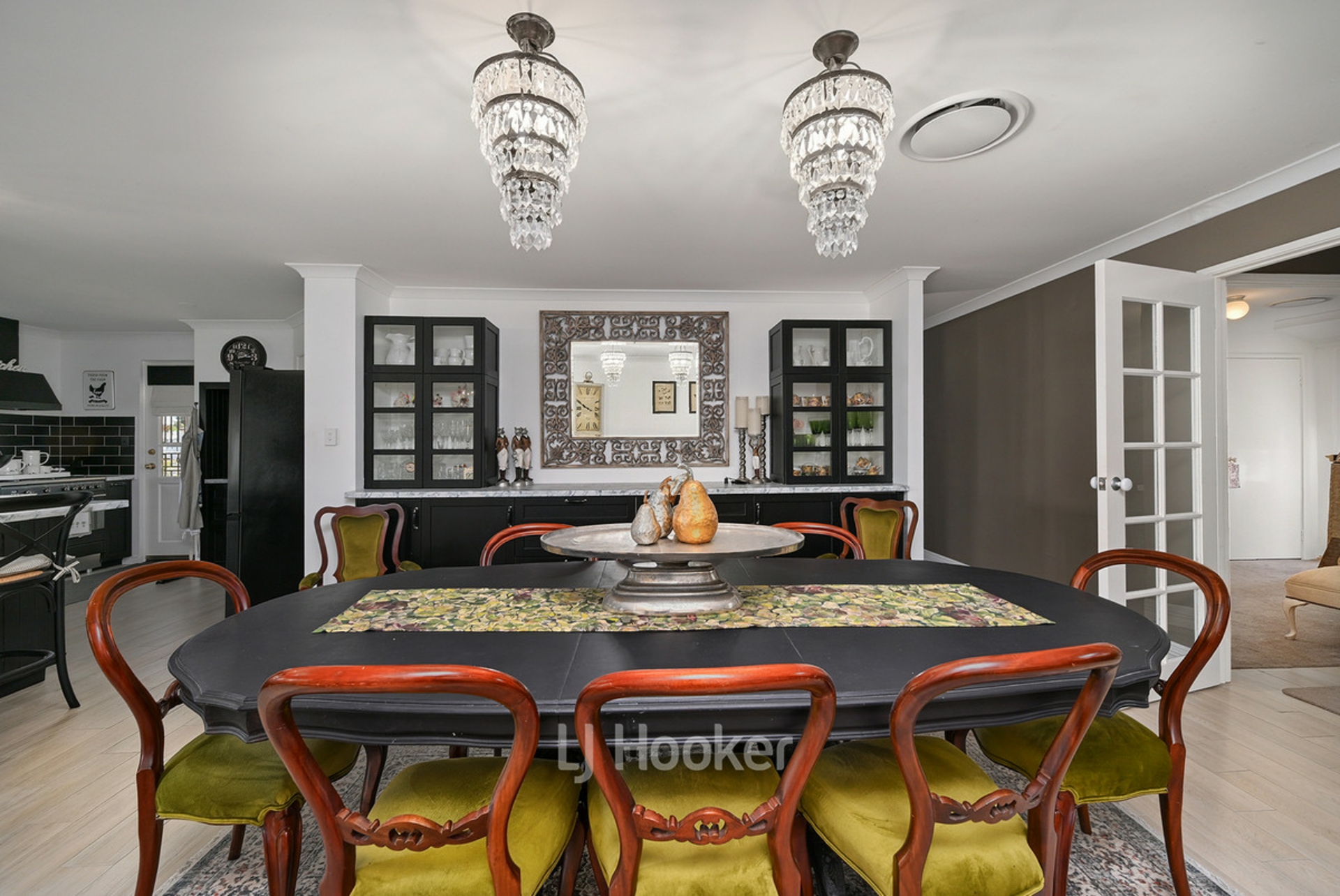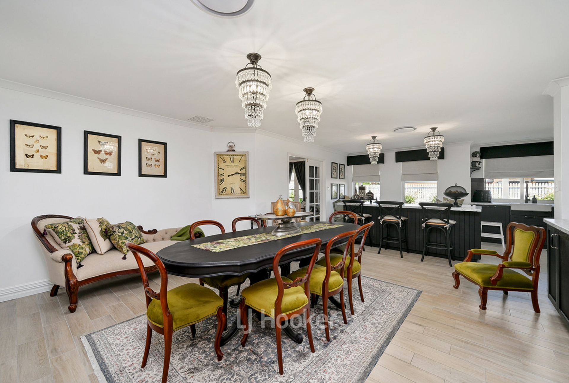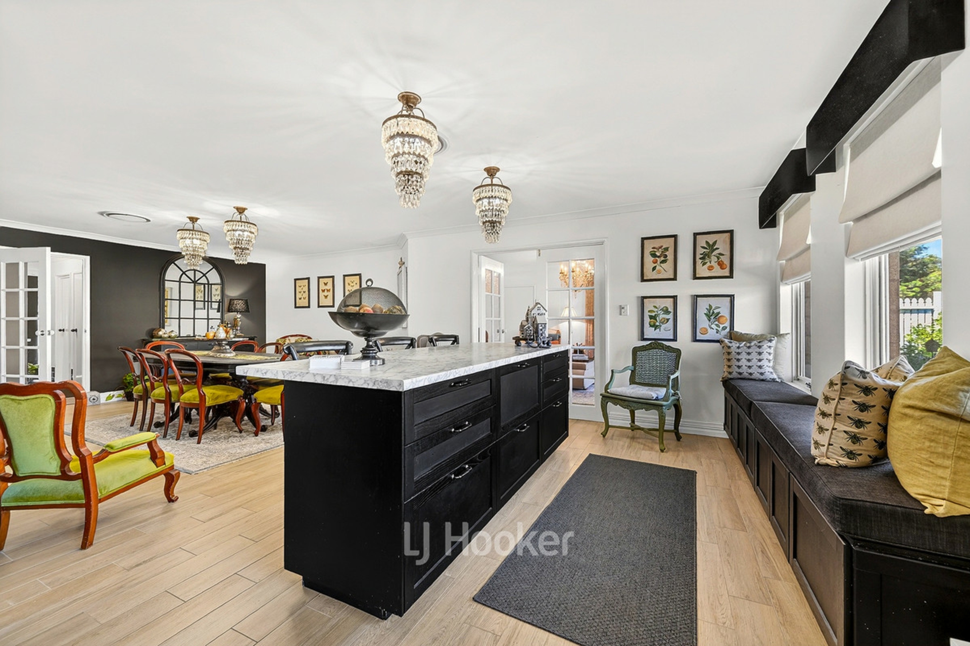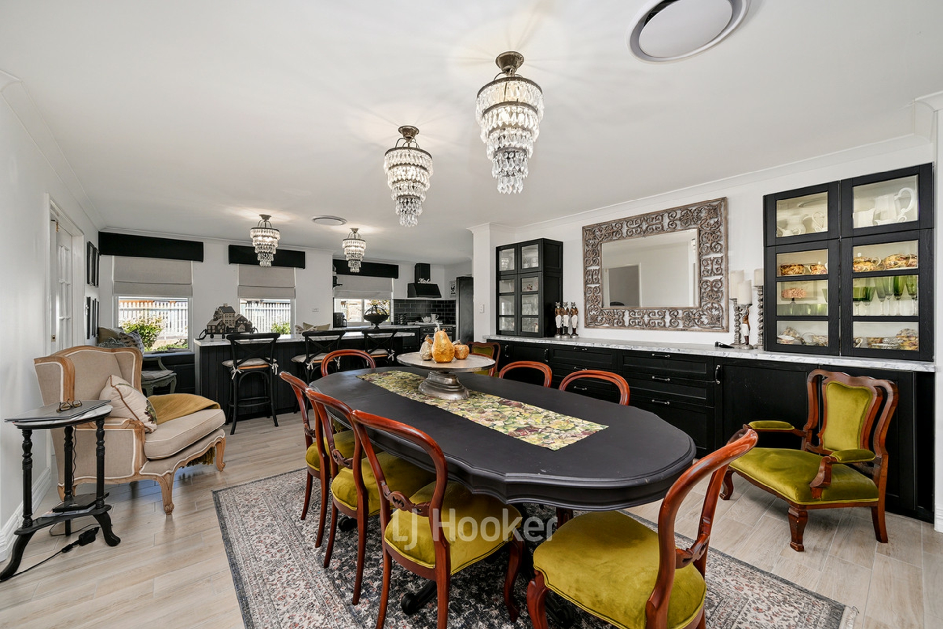 Designed with family living and entertaining in mind, the home features multiple living areas and a spacious layout that flows effortlessly throughout. At the heart of the home, the stunning kitchen showcases striking black cabinetry, a farmhouse sink and a large island bench, overlooking the main living and dining areas where built-in cabinetry and seating add both character and functionality. The wide wraparound veranda provides the perfect place to relax and enjoy the peaceful surroundings.