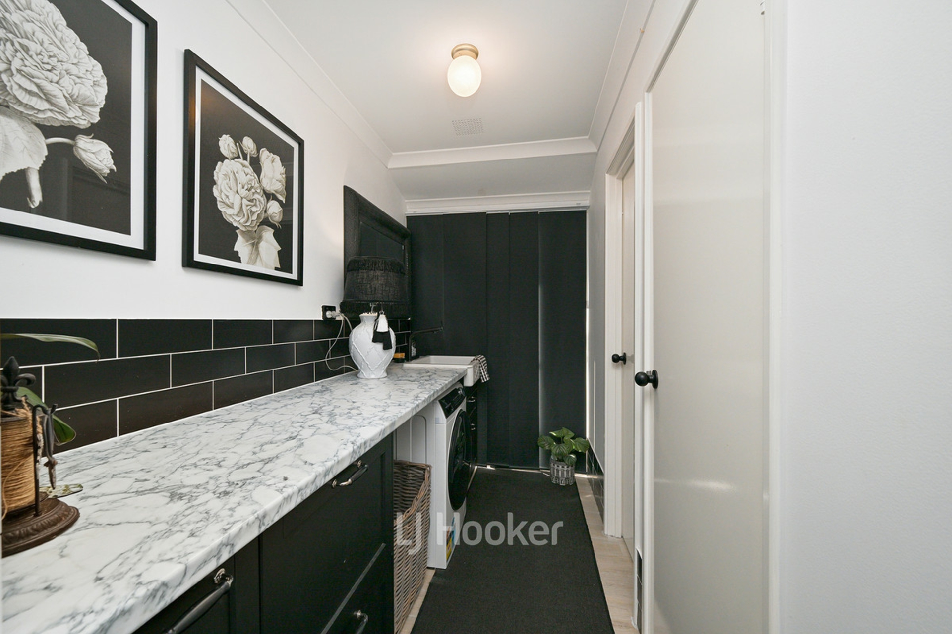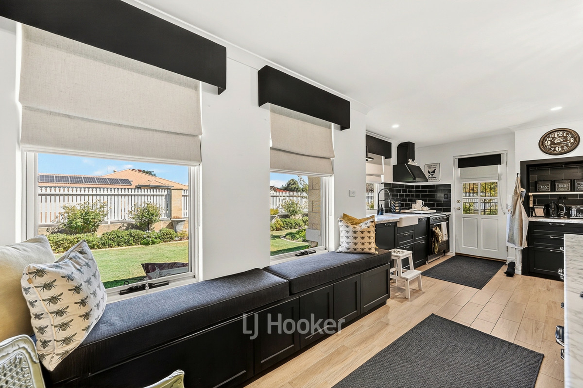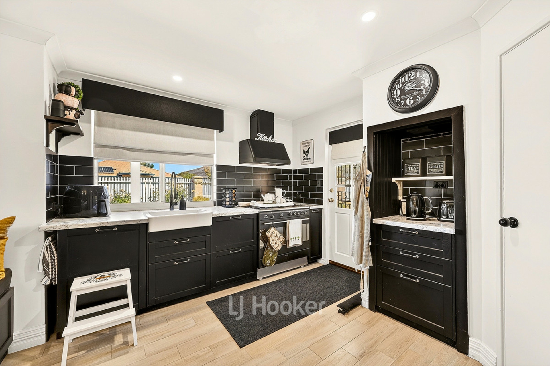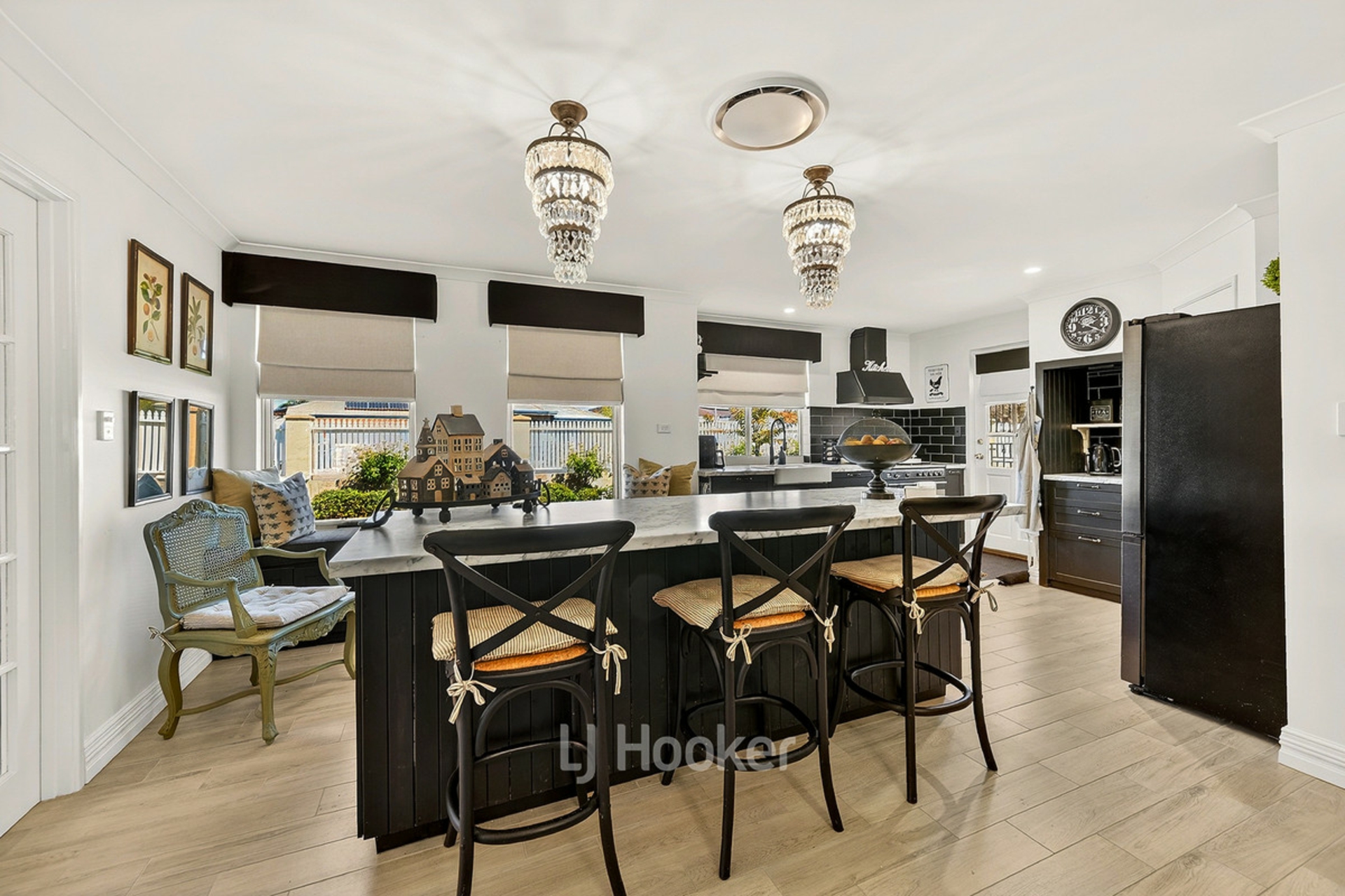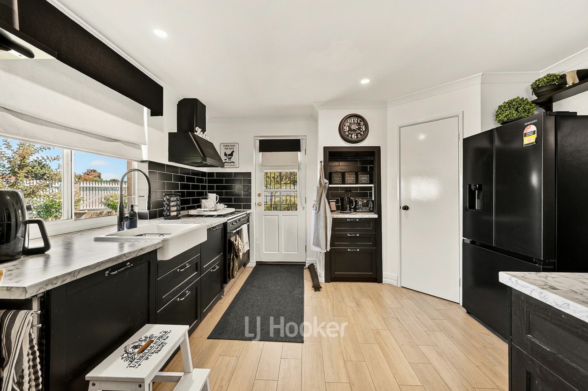 - Spacious kitchen with black cabinetry, farmhouse sink and island bench