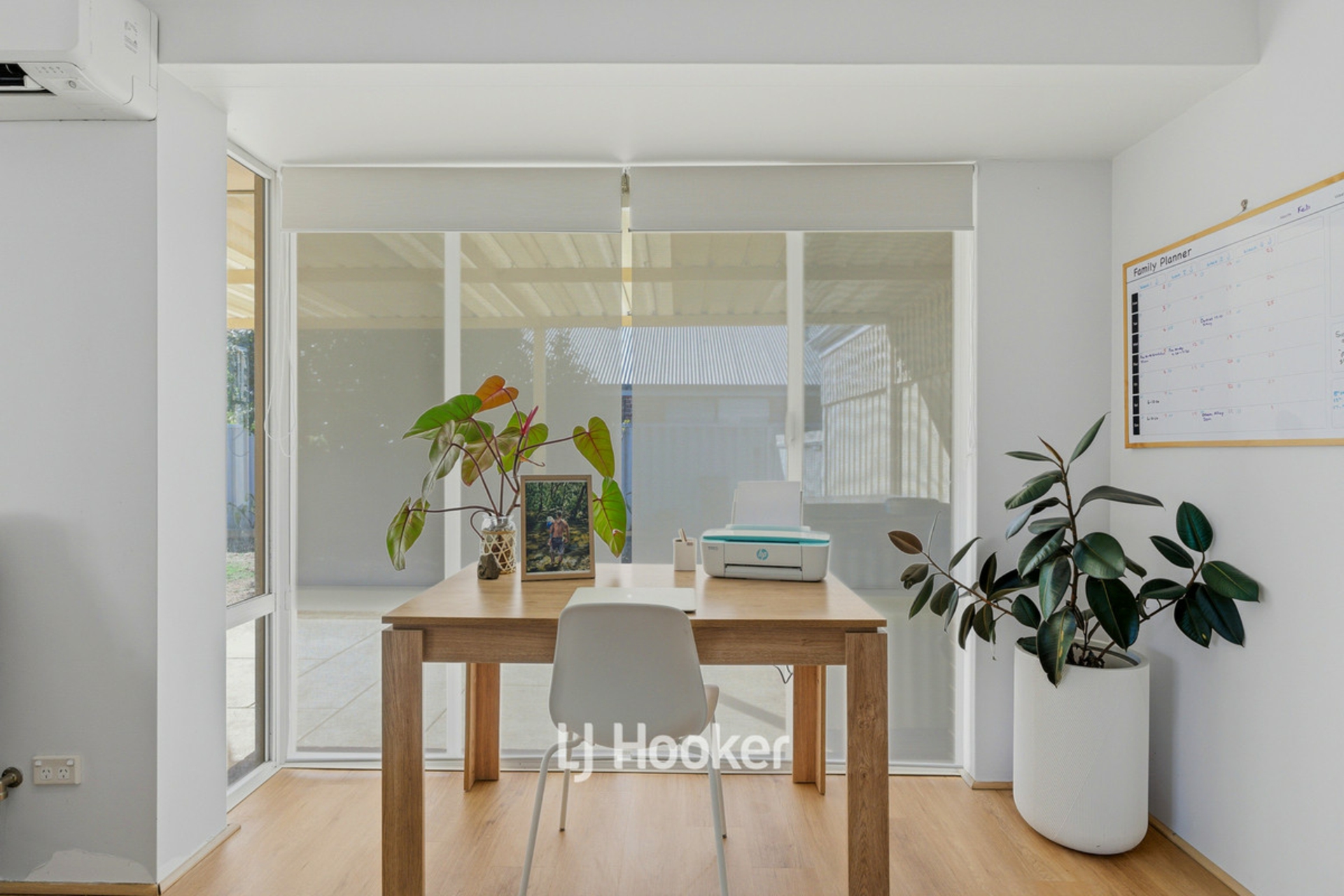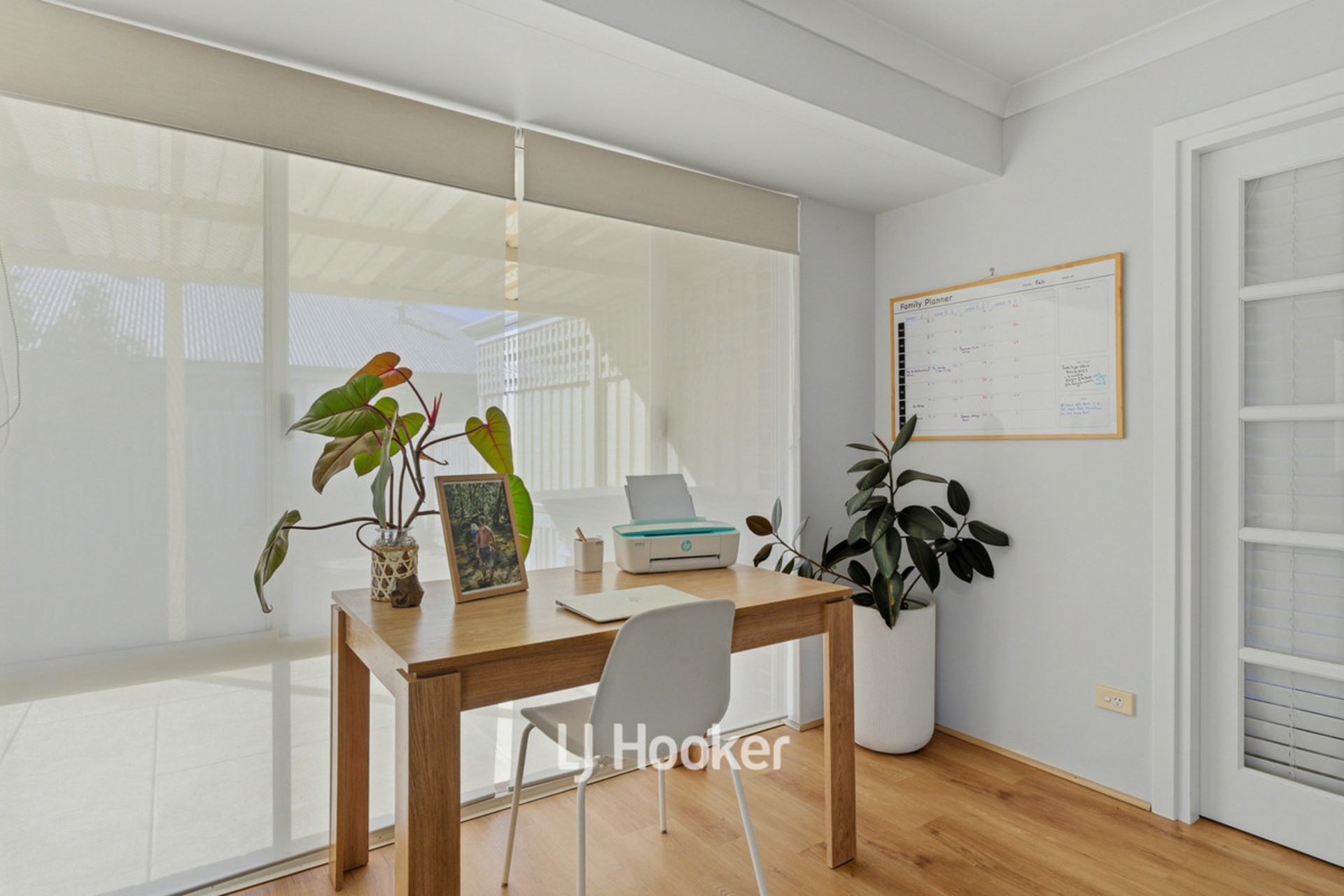 The open-plan living areas provide a welcoming space for the family to gather, this space also has a handy study nook which adds extra functionality, while a separate theatre room provides flexibility ideal as a second living area or even a potential fourth bedroom. The kitchen is situated in the central part of the home, with updated appliances, it is perfectly suited for preparing family meals.