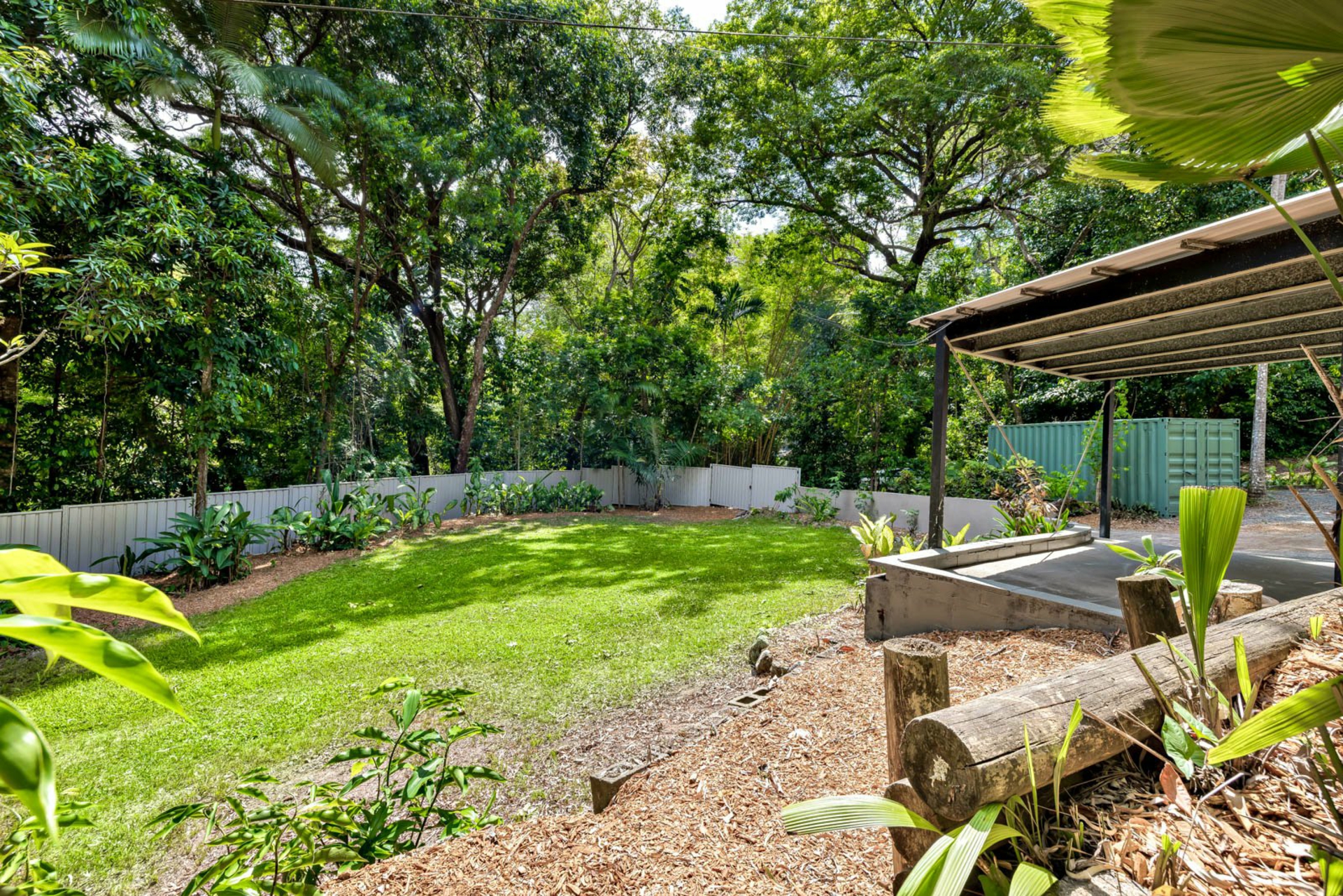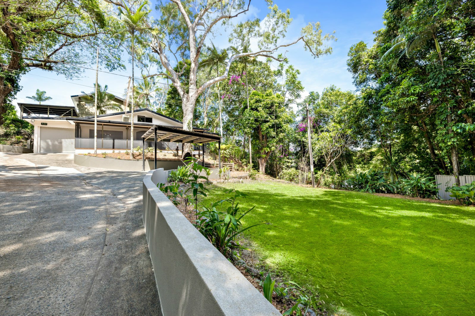 Car accommodation includes an electric garage with internal access and a separate carport. In addition to these, the property offers ample parking and storage options for a boat, camper van, or guests. The surrounding garden creates a private tropical retreat, with lush rainforest surrounds, a manicured lawn accessible by vehicle through double gates, and low-maintenance garden beds.