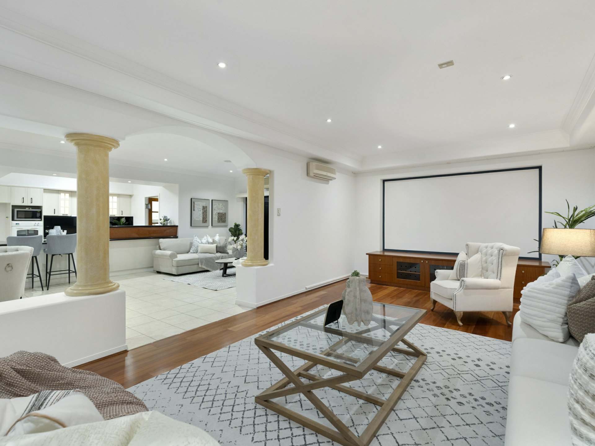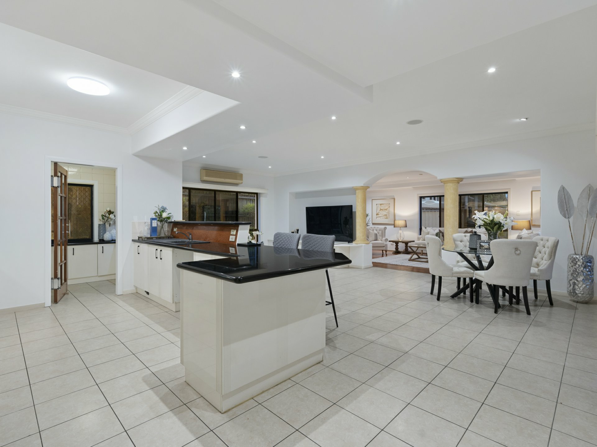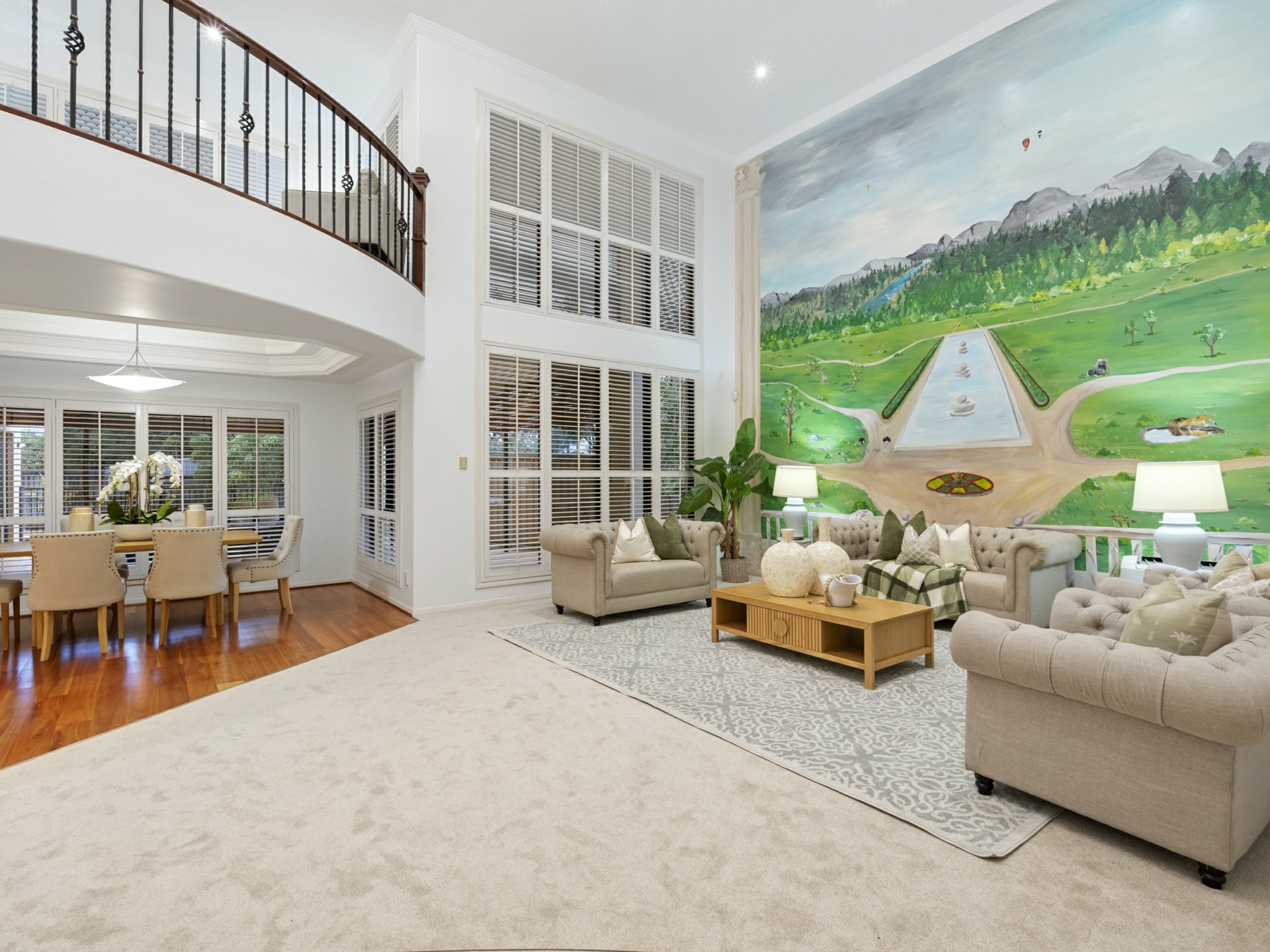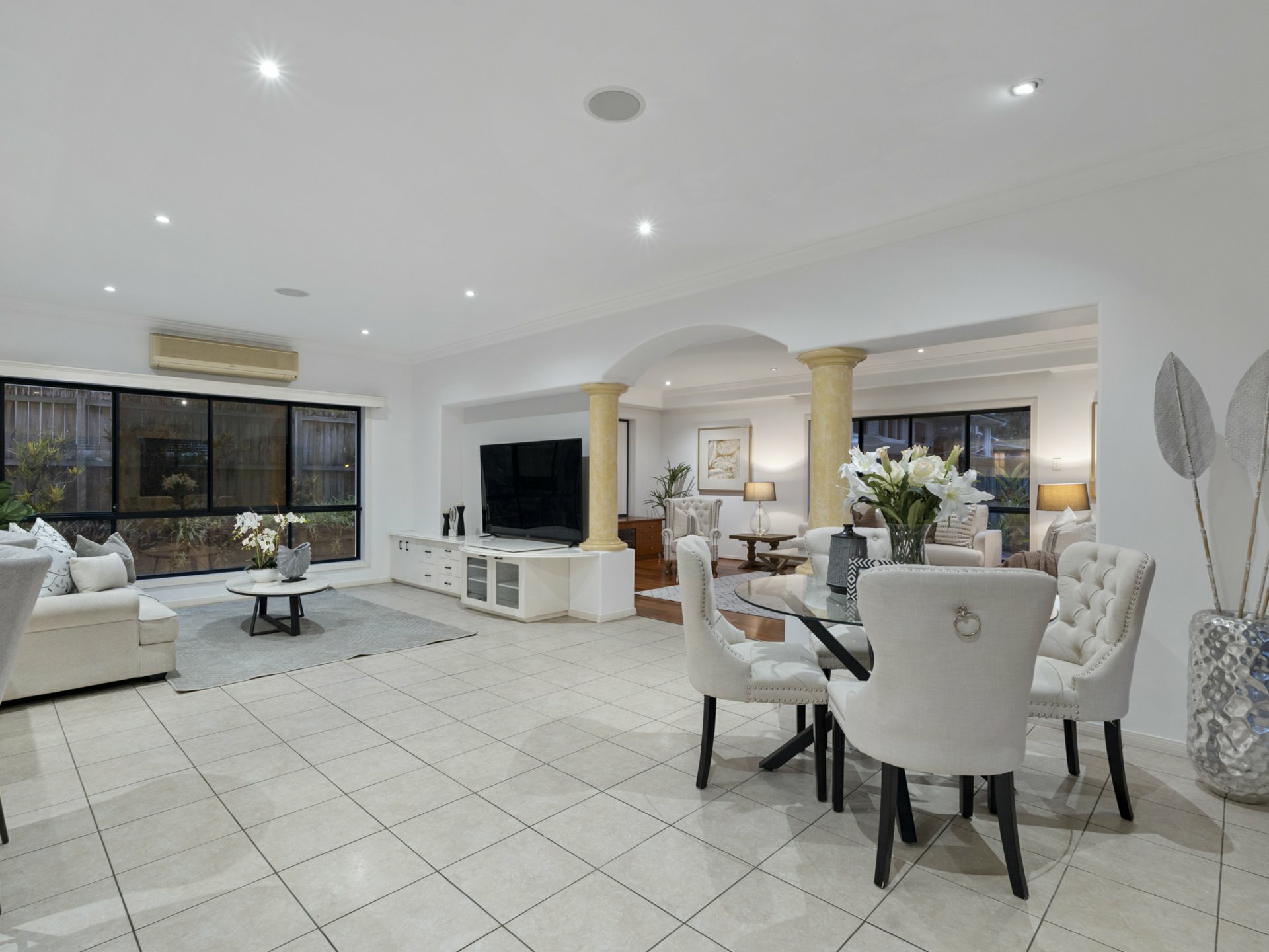 Multiple living areas provide flexibility for both everyday family life and entertaining. A sunken formal lounge offers a sophisticated retreat beneath the soaring ceiling, while the expansive family and dining zones connect seamlessly to the kitchen and outdoor entertaining area.