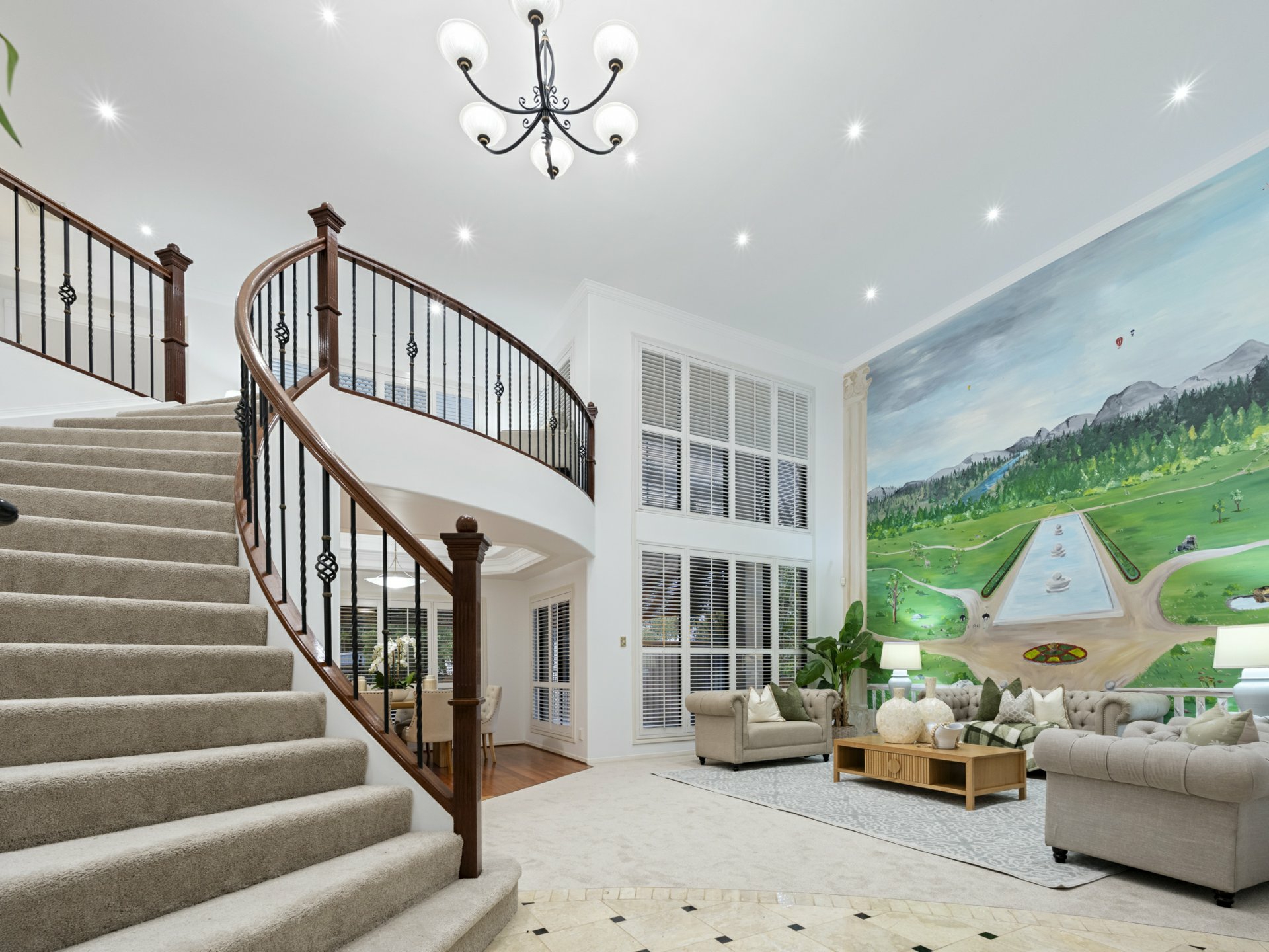 The elegant facade and columned entry create an immediate sense of grandeur, opening to a dramatic double-height void and sweeping curved staircase that forms the centrepiece of the home. Light pours through large windows fitted with plantation shutters, showing off the bright, refined interiors.