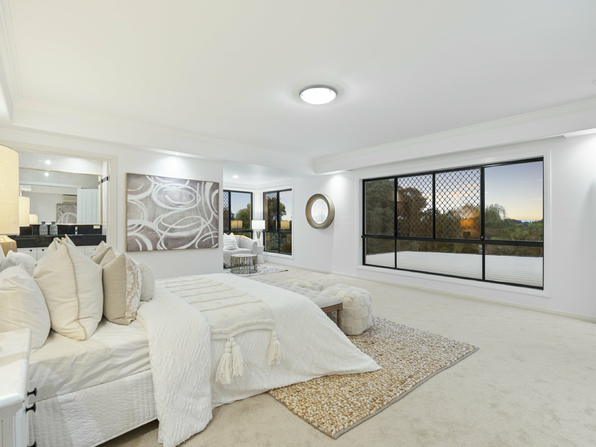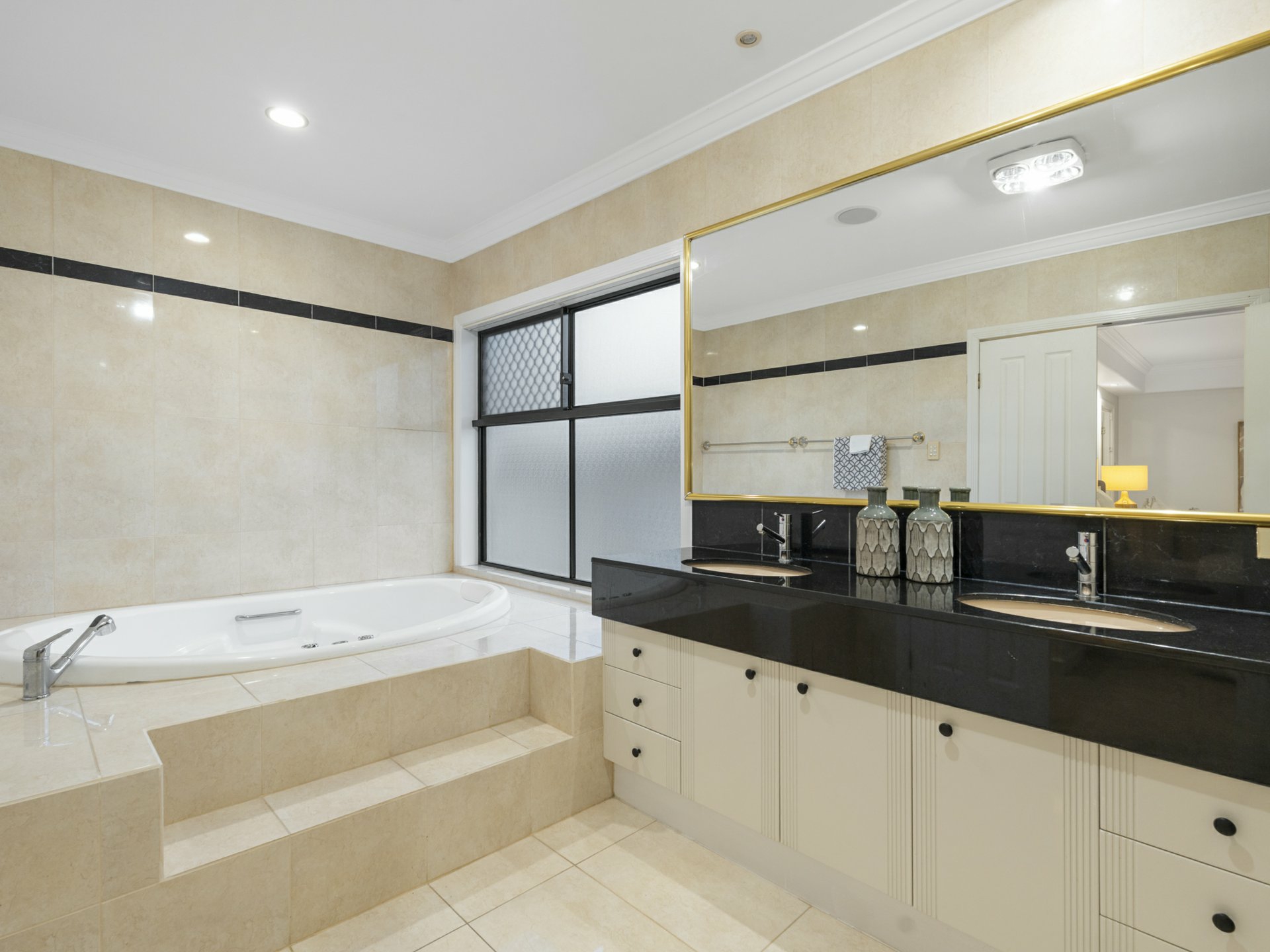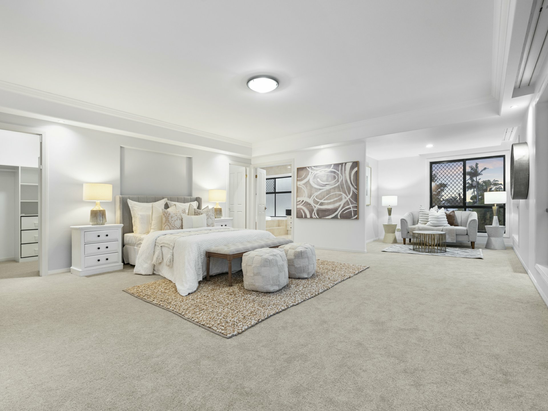 Upstairs, the accommodation continues the home's theme of plush comfort. Five well-sized bedrooms provide excellent flexibility, while a large retreat at the top of the stairs adds another living zone for reading or relaxing. The impressive master suite offers a true sanctuary with its enormous layout, sitting area, deluxe walk-in robe, and sparkling ensuite with quality tiling, dual vanity, spa bath, and separate shower.