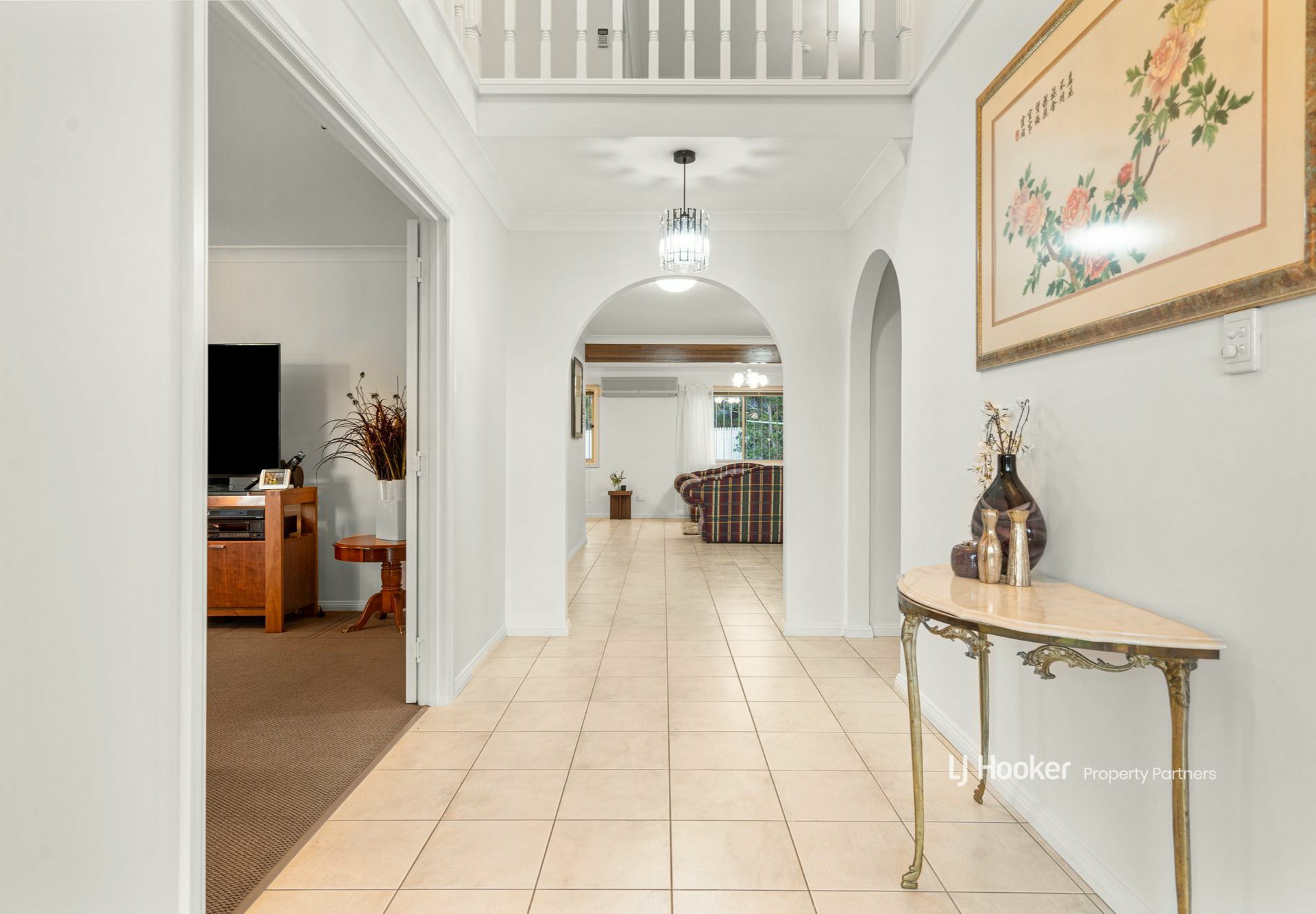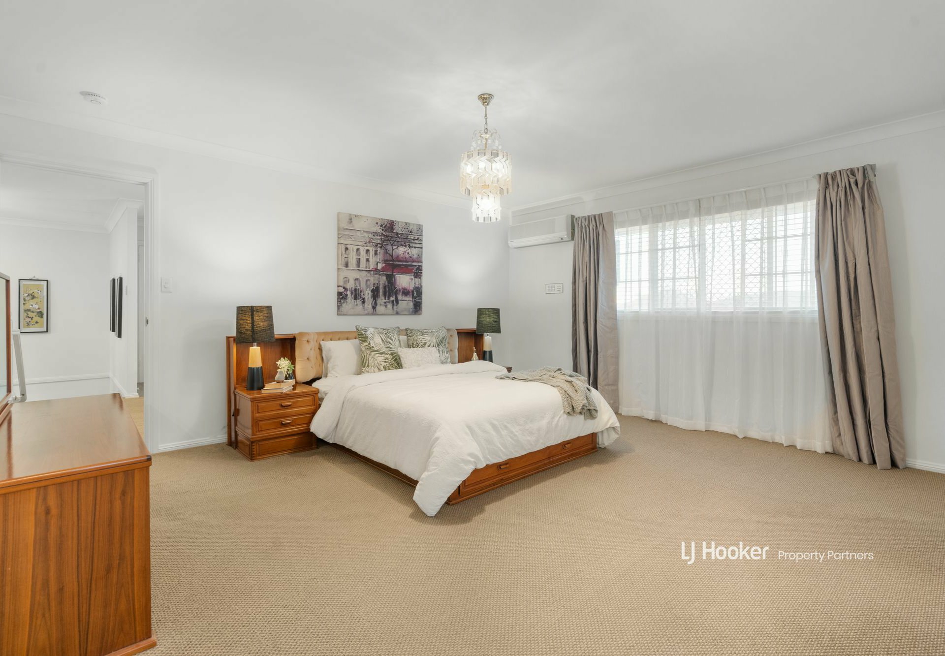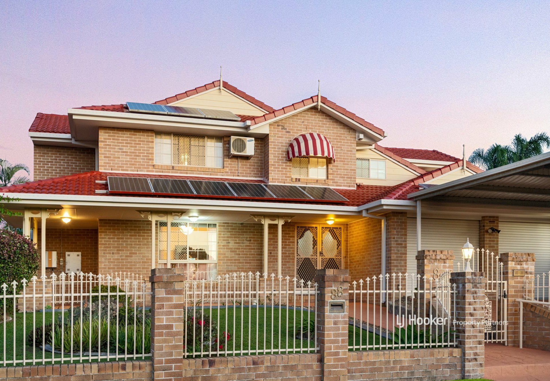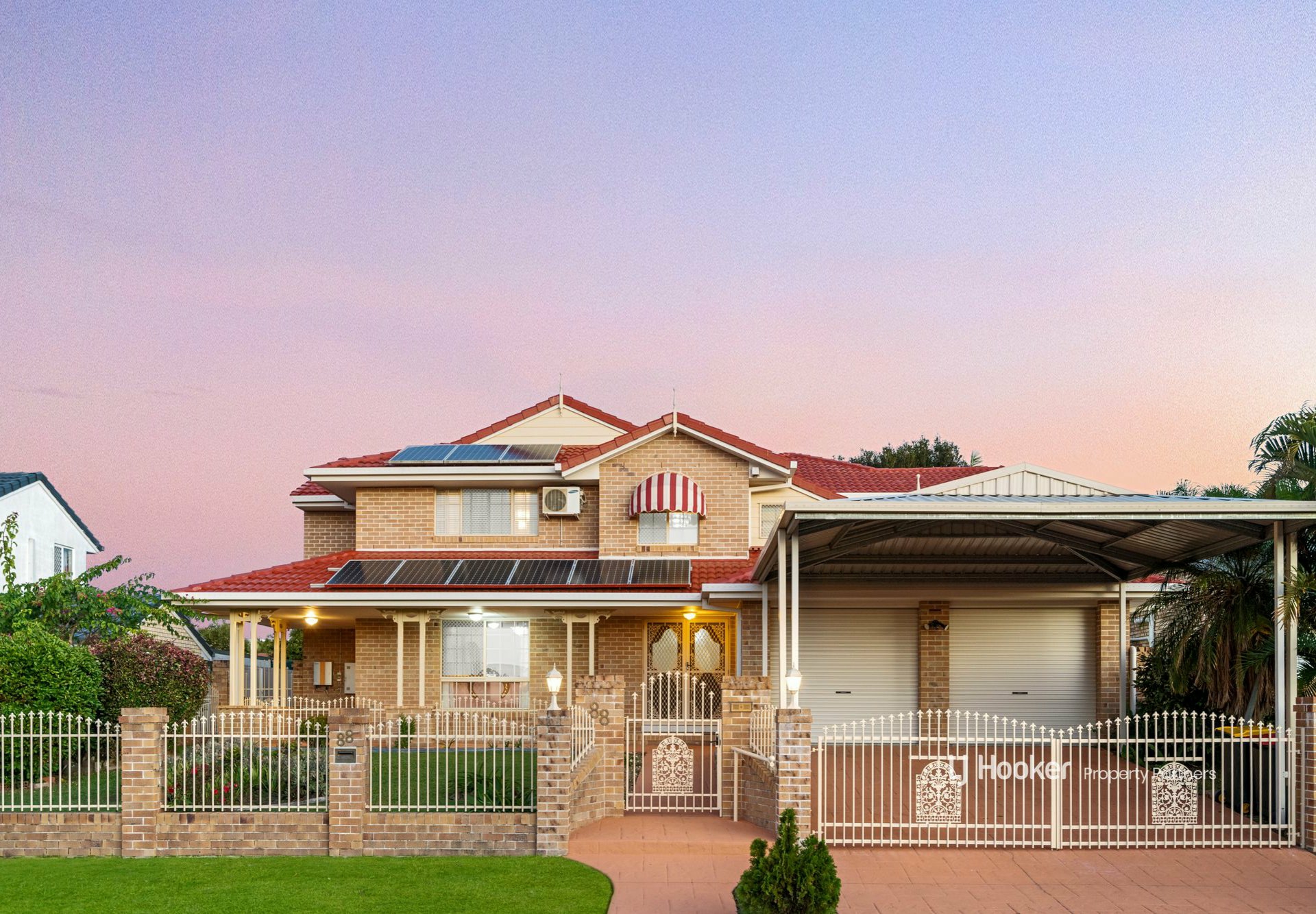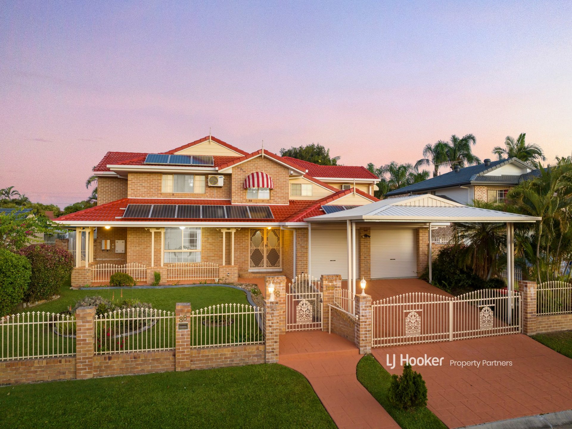 Out front, a paved driveway leads through ornate security gates to a double carport and then the remote-controlled double garage, providing loads of safe off-street parking. Next to this is a paved pedestrian path through a separate front gate up to the porch and main entry.