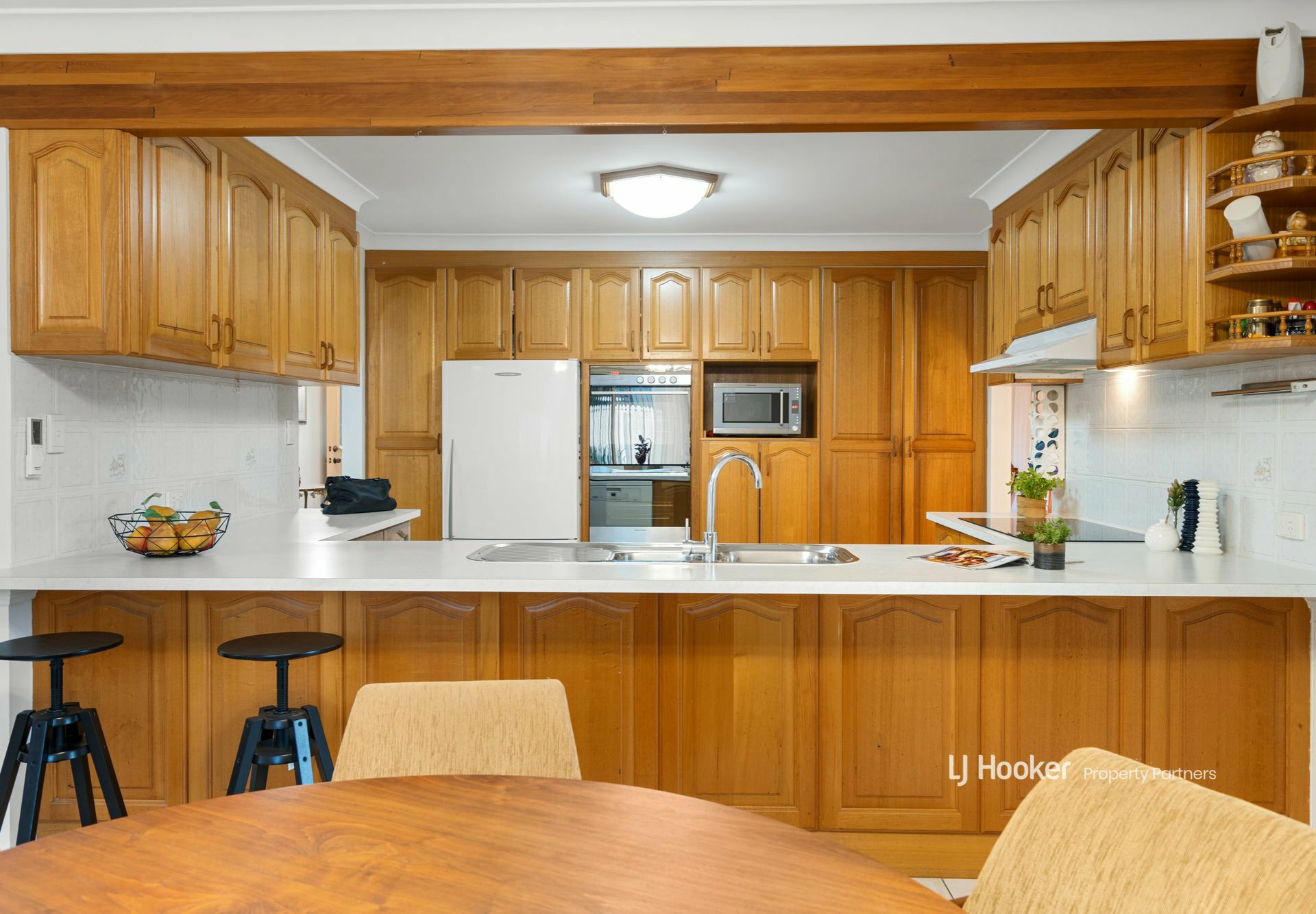 Downstairs is home to a massive central kitchen with a dishwasher, dual sink, wall-mounted oven, electric cooker, rangehood, and abundant moulded timber joinery. Surrounding this culinary creative space is a tiled casual family living and meals area, along with a tiled dining room and a more formal, carpeted lounge with an office nook. Elsewhere is the revamped laundry with a new double trough, a bedroom, and full bathroom with both a shower and tub.