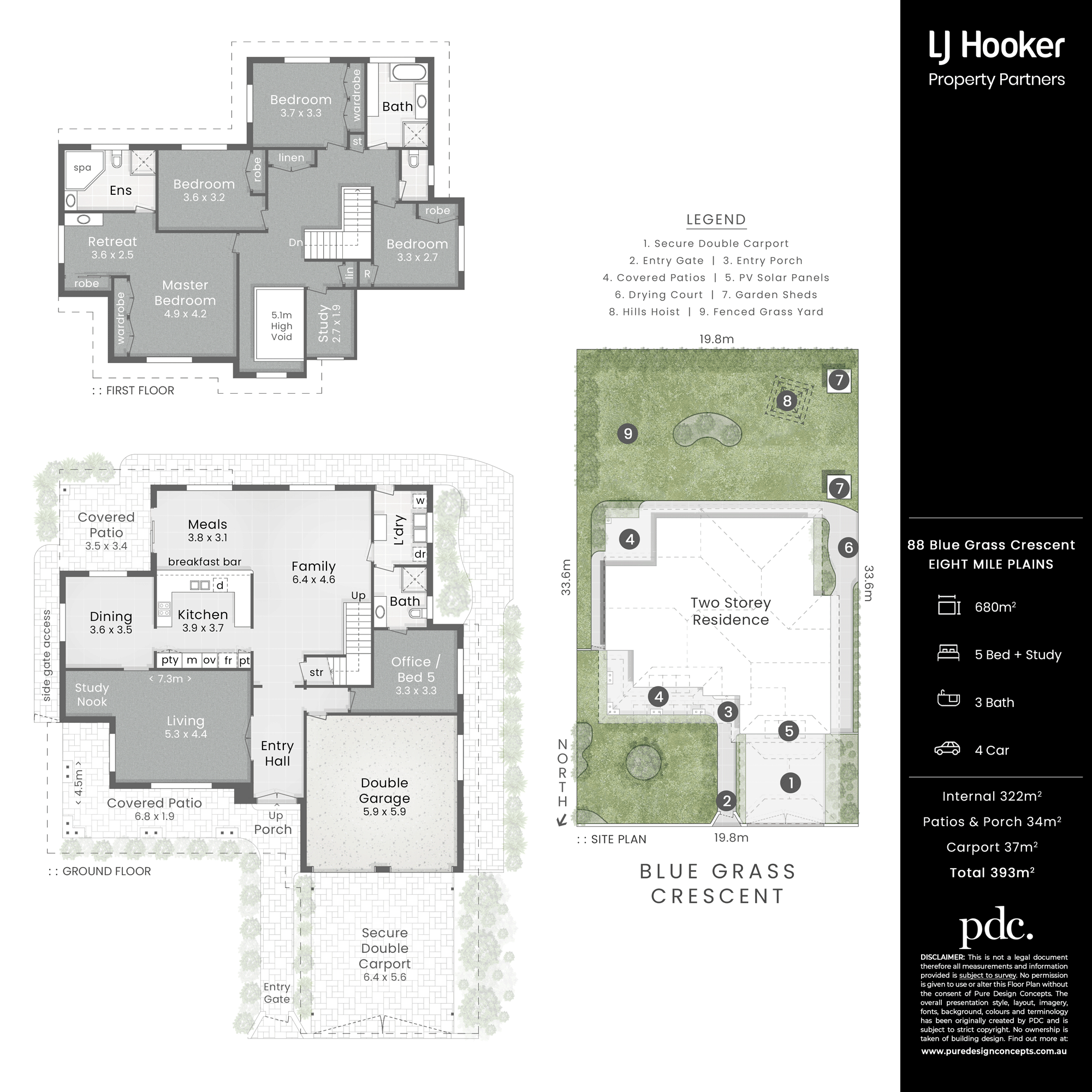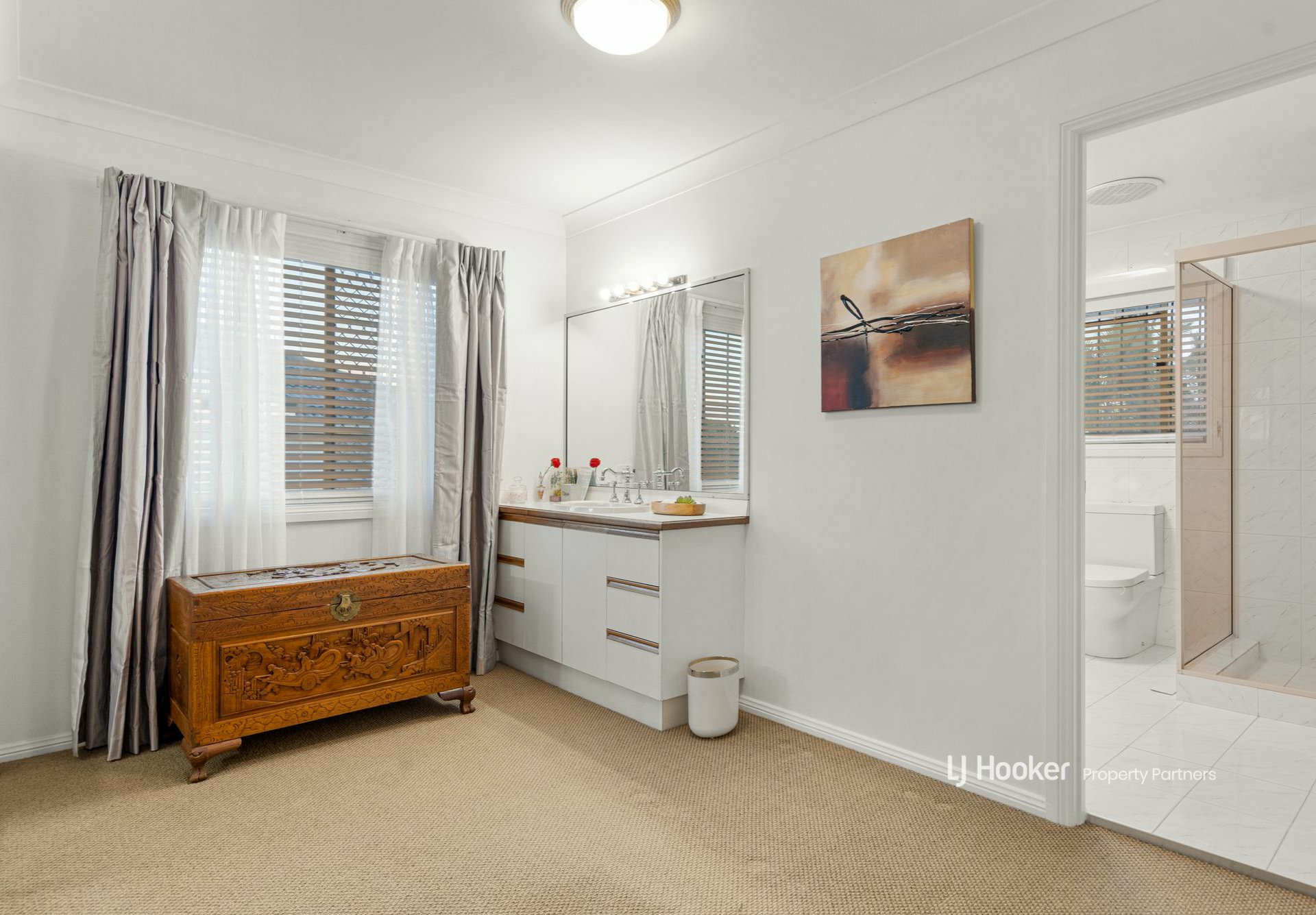 Upstairs, a small sitting room awaits on the landing branching into a designated study, four carpeted bedrooms with built-in robes, including the large master with its own ensuite, and a third bathroom with a super-soaking corner spa bath.