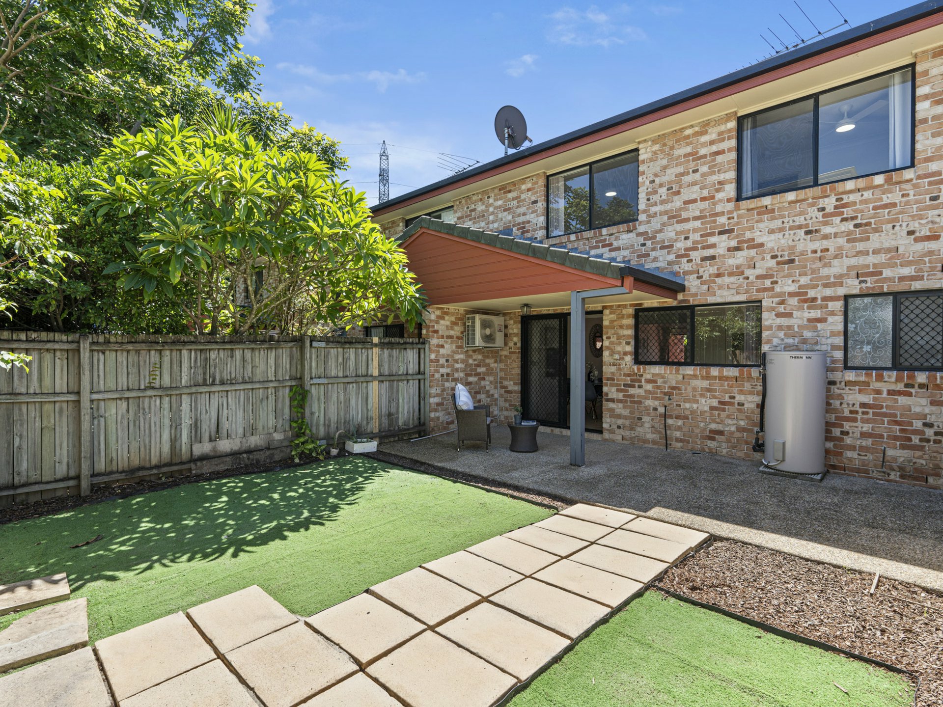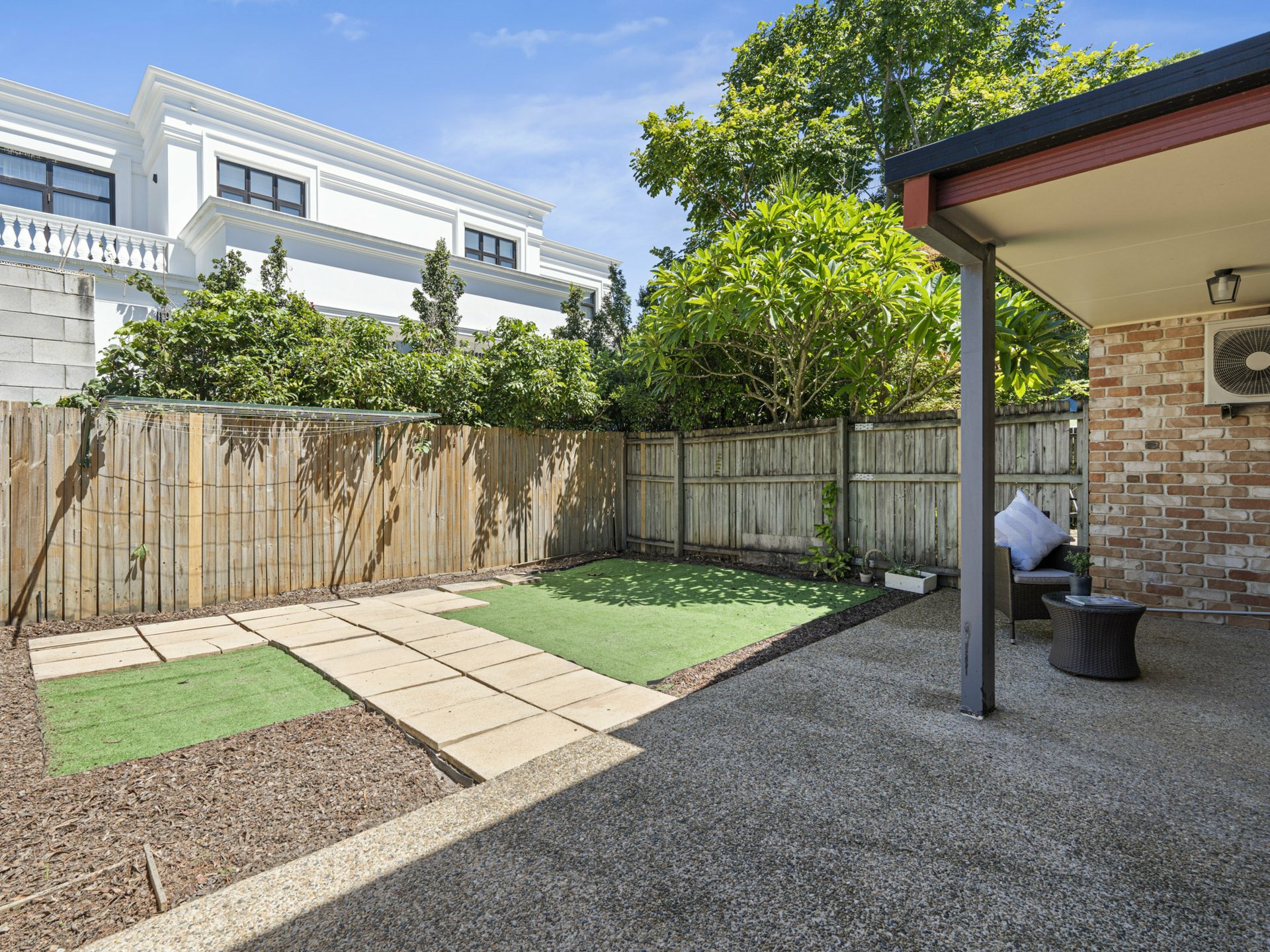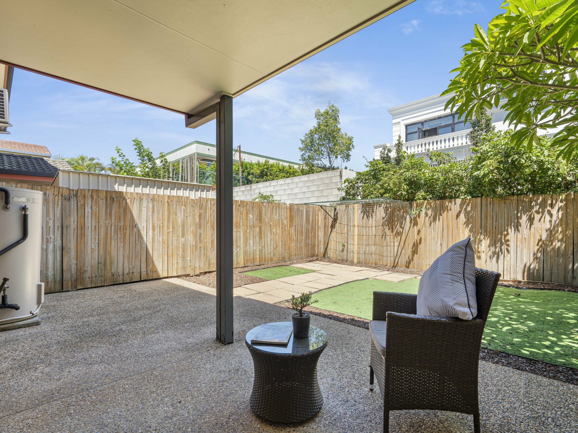 From the meal's hub, sliding doors open onto a covered alfresco patio overlooking a fenced courtyard with lawn and space for drying clothes under the Queensland sun. You could easily get creative out here if gardening is your thing or just spend your outdoor time in or beside the onsite community pool that's maintained for you by the management!