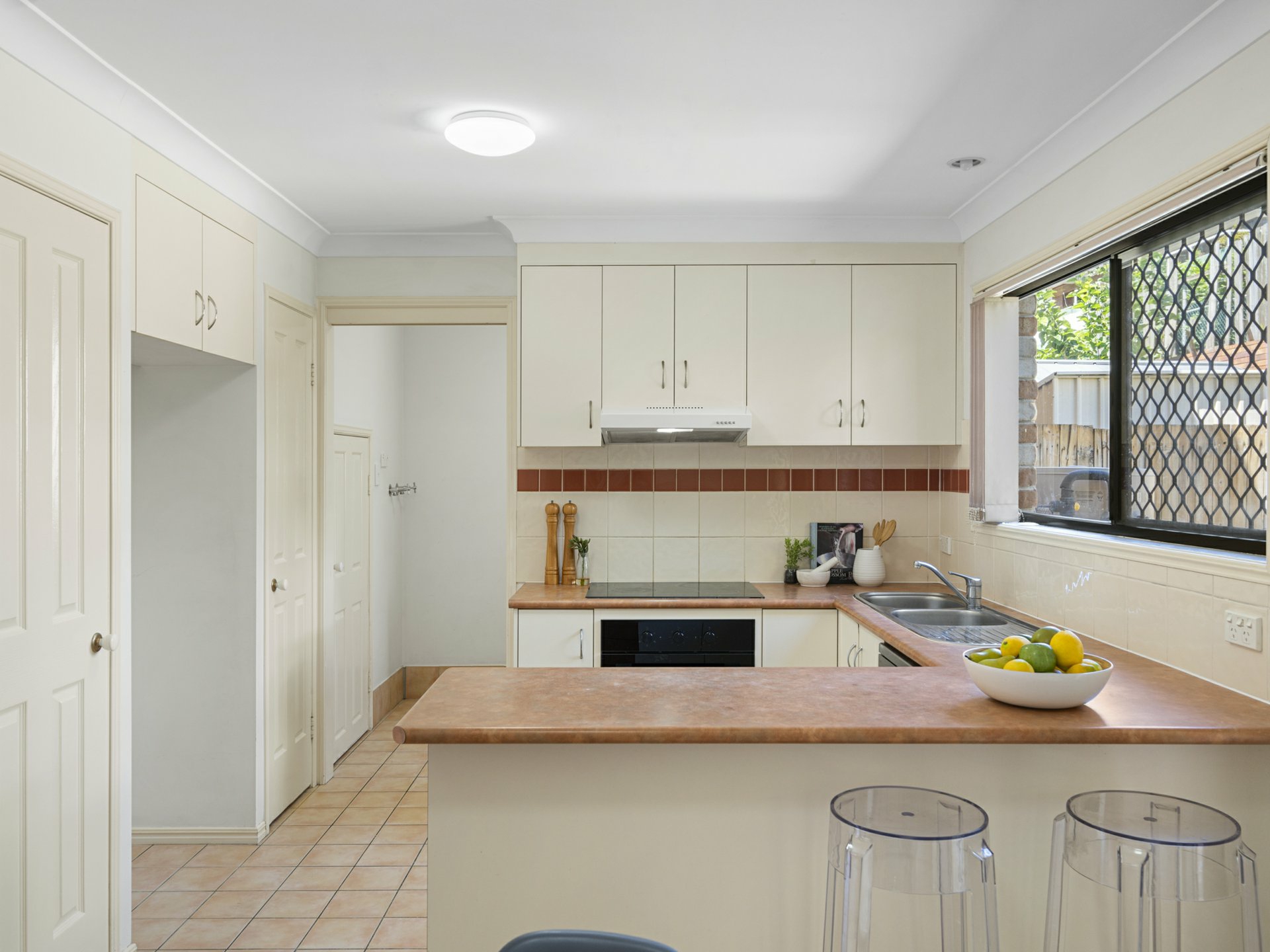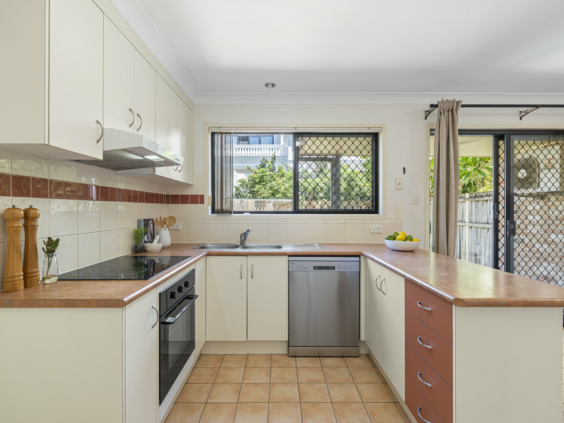 Back below, the kitchen is a light and bright, free-flowing space, well-appointed with a dishwasher, twin sink, electric cooker/oven and rangehood. Discreetly positioned behind is the laundry, with a powder room one end and a storage space opposite.