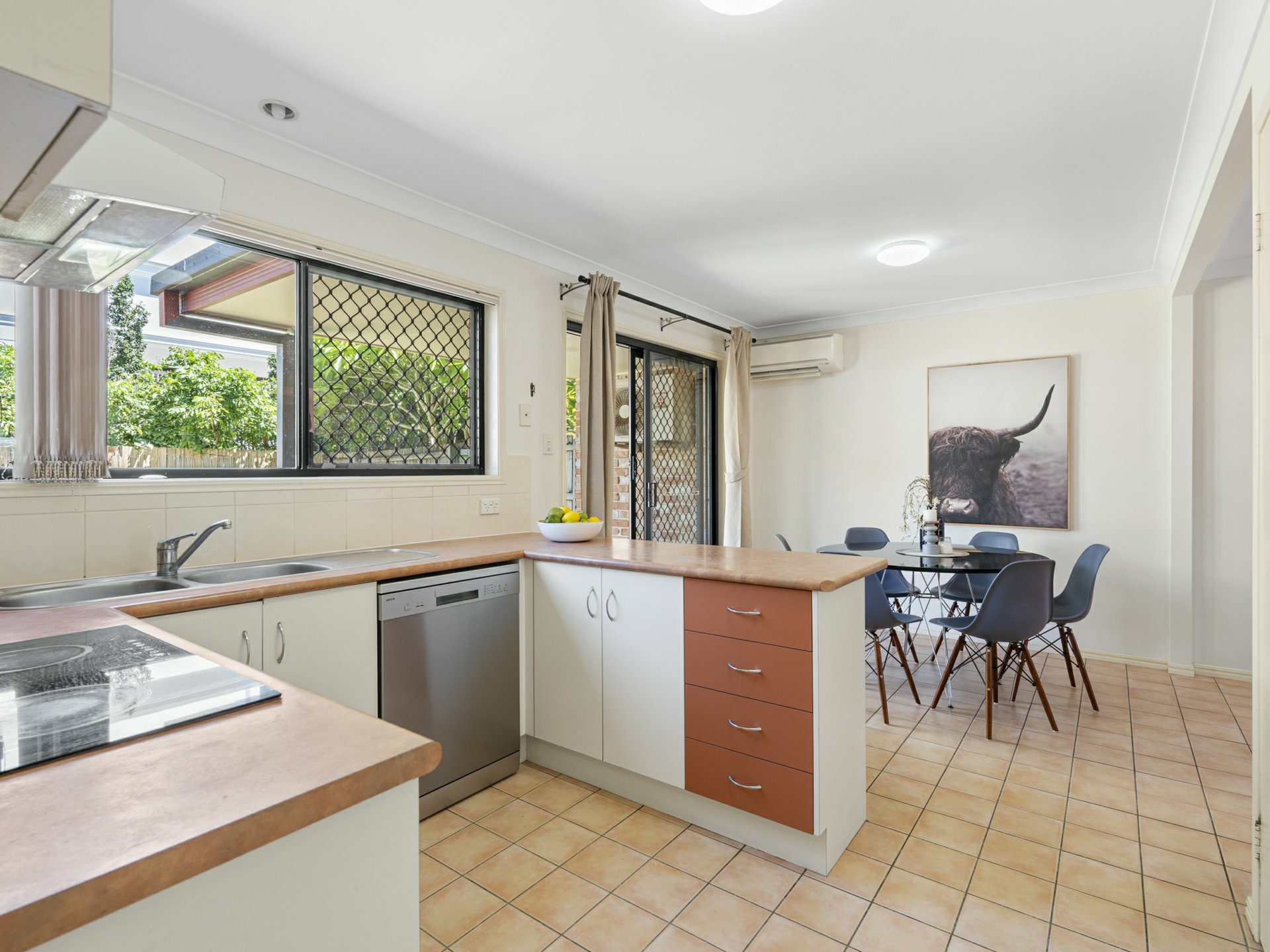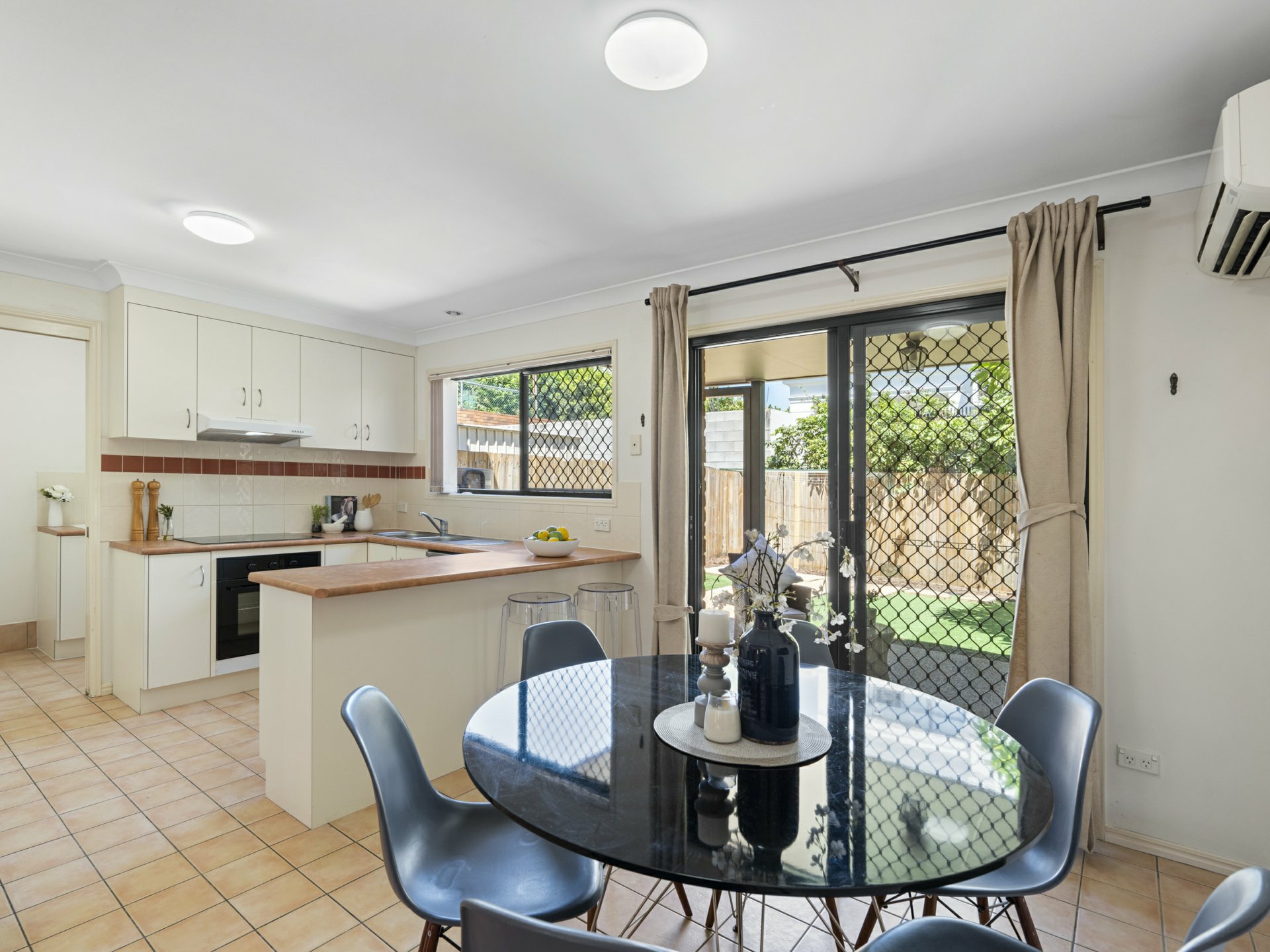 - Tiled kitchen/meals area with AC beside a timber-floored kitchen with ceiling fan