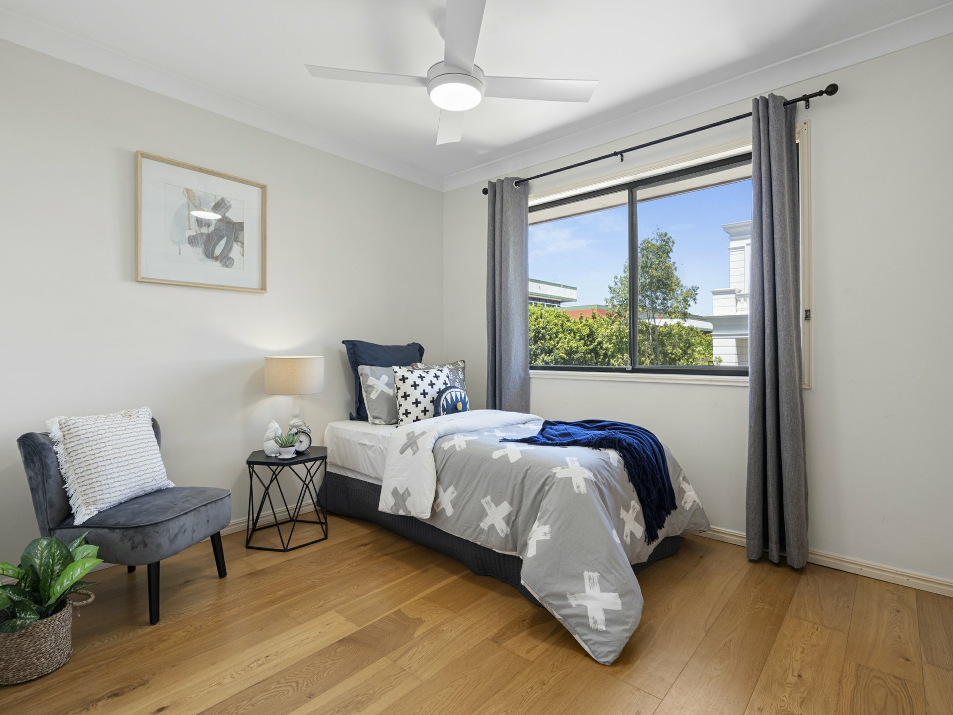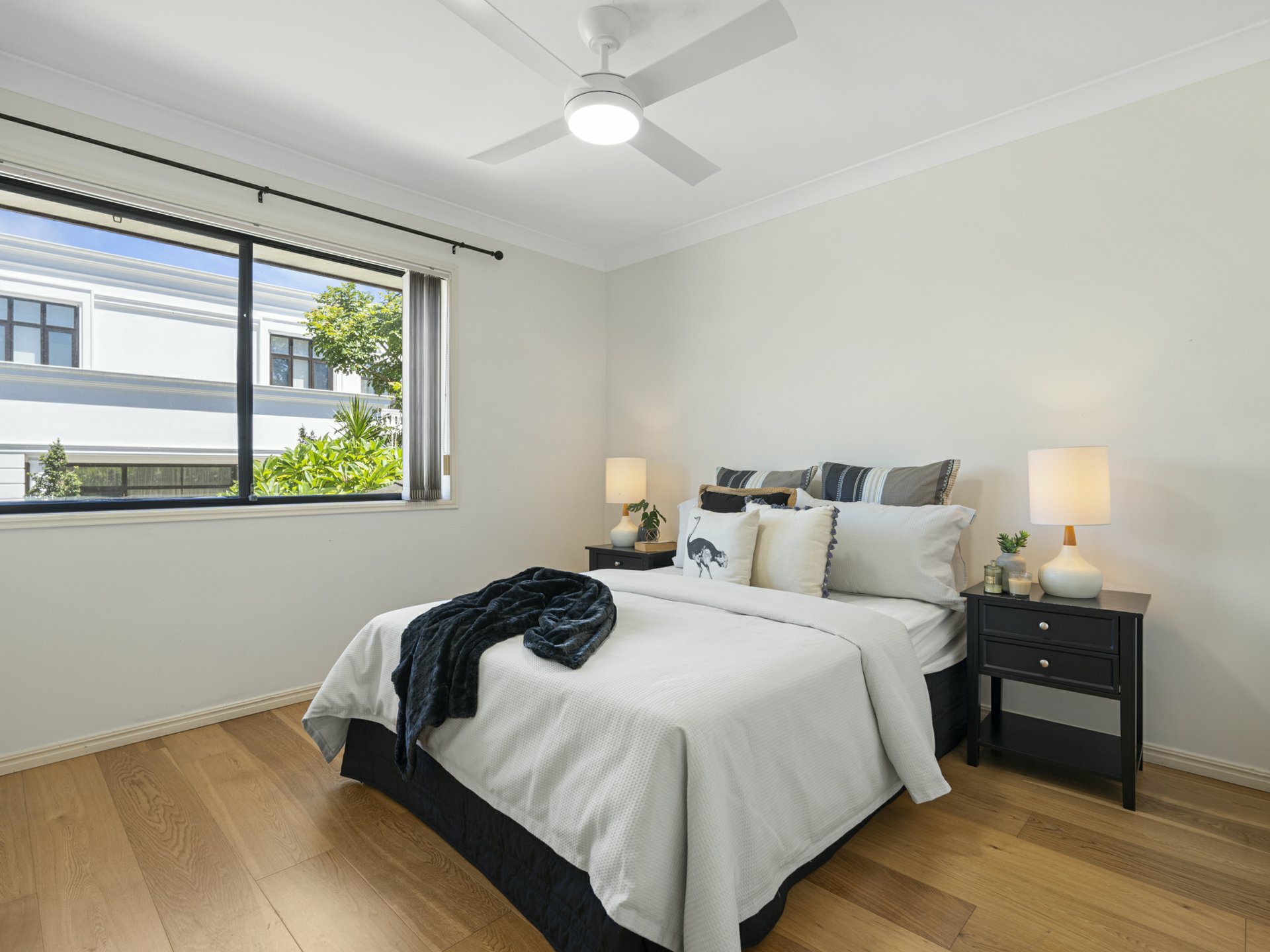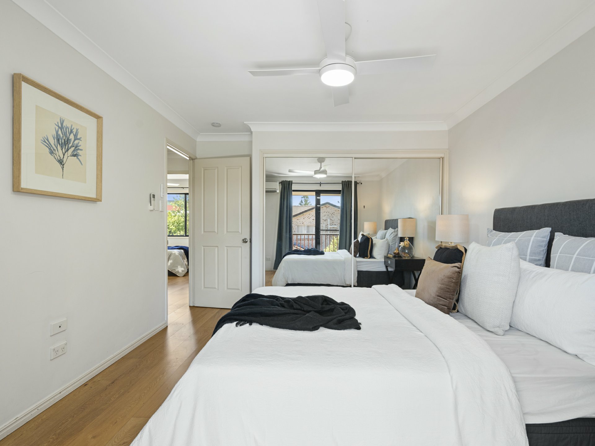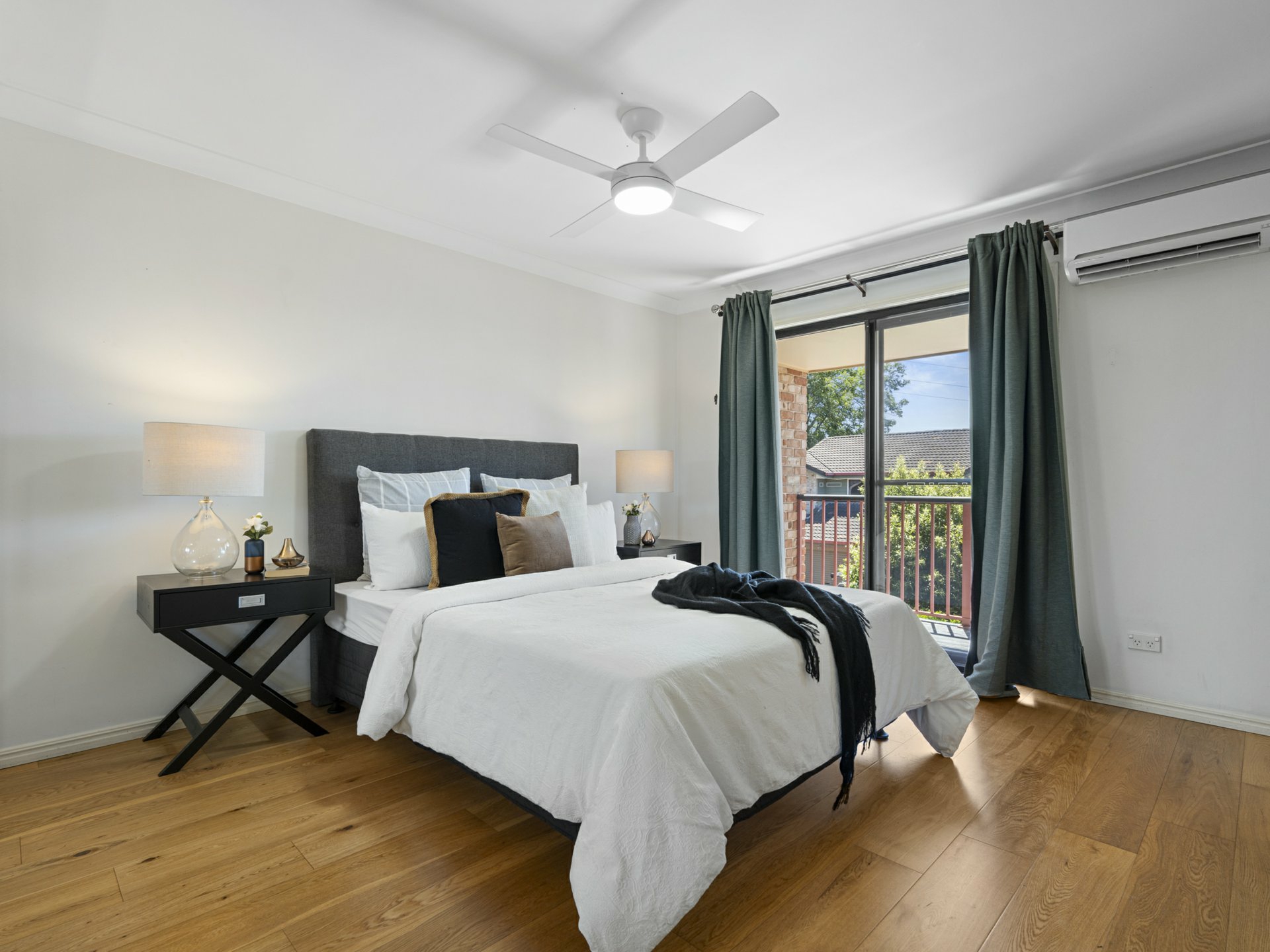 - 3 timber-floored beds with fans and BIRs; master also has AC, ensuite & private balcony