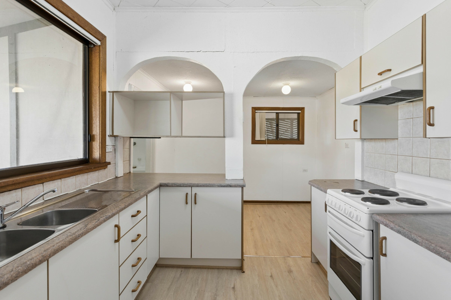 • Functional kitchen overlooking the spacious backyard with adjoining dining area