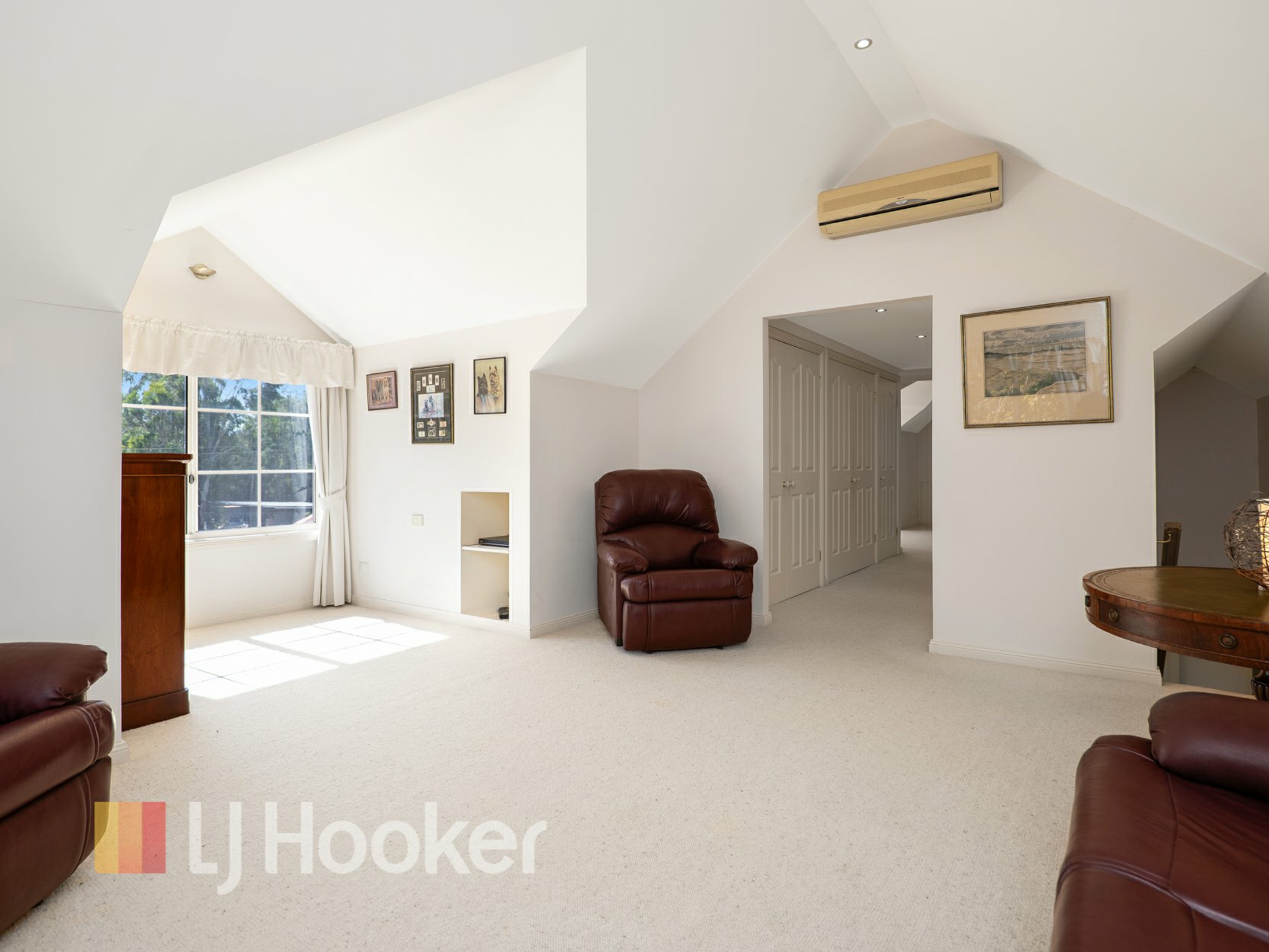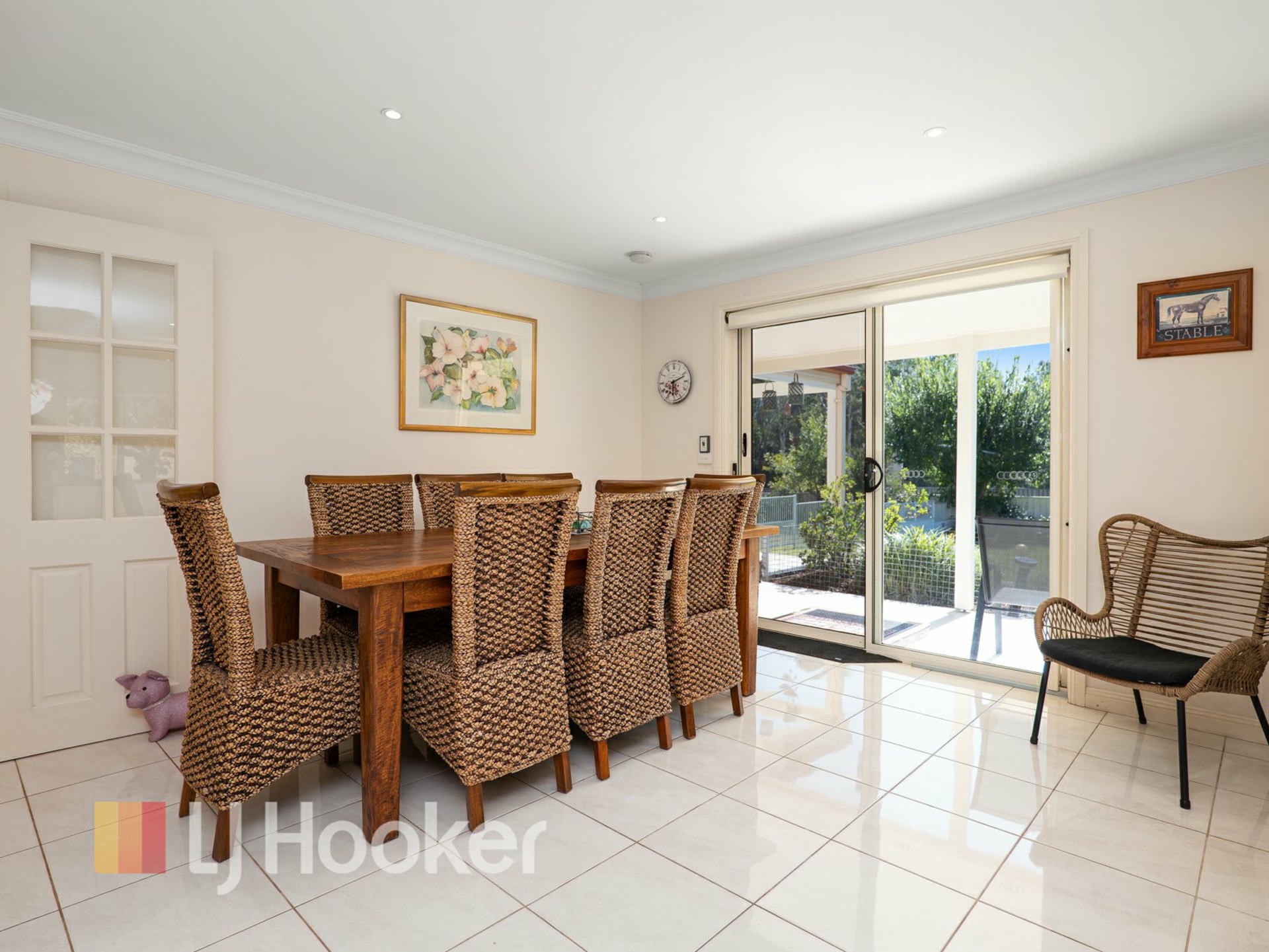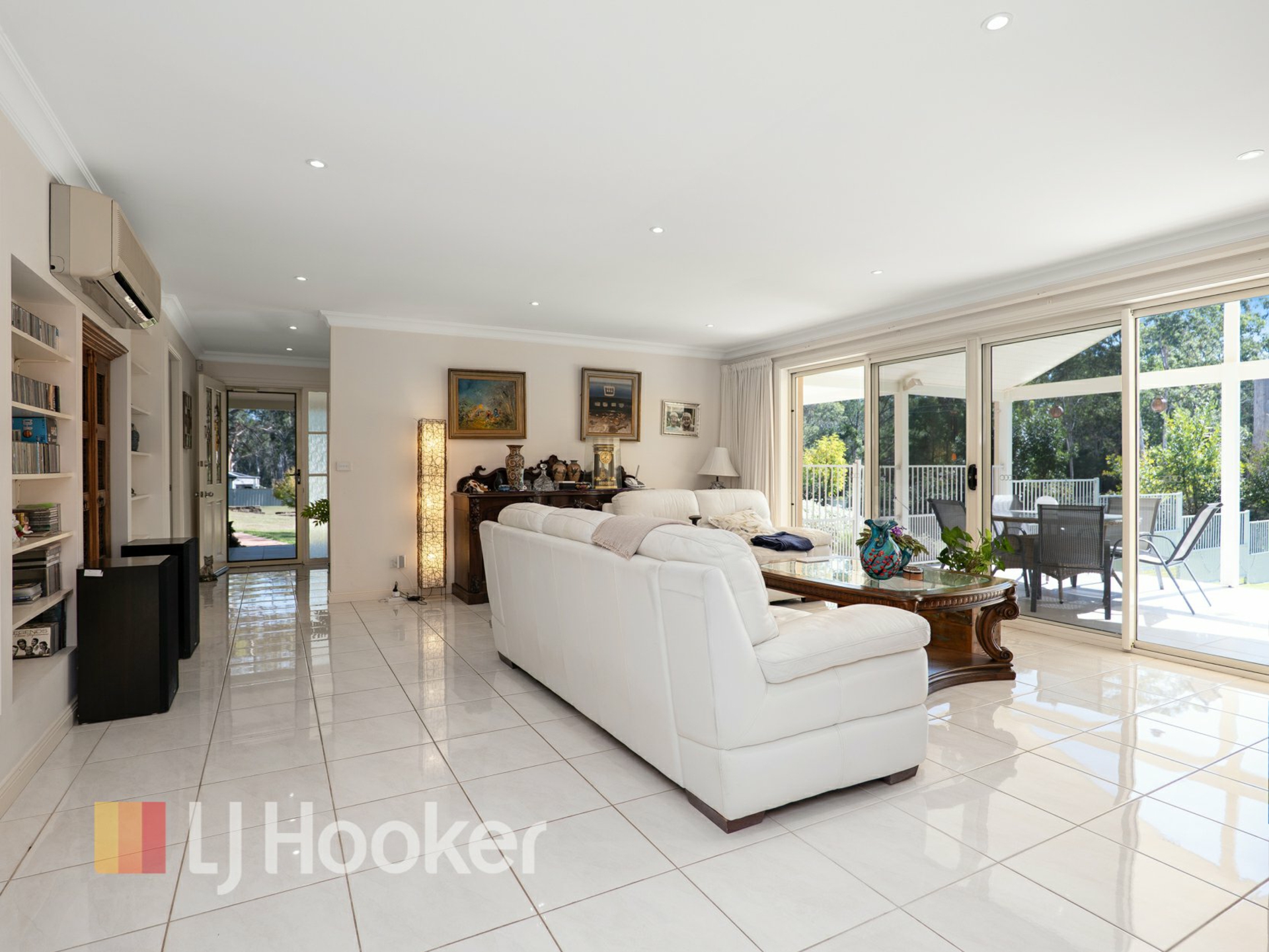 The generous living area offers flexibility for both relaxed nights and entertaining, with double sliding glass doors opening out to the expansive grounds, creating a seamless indoor-outdoor flow.