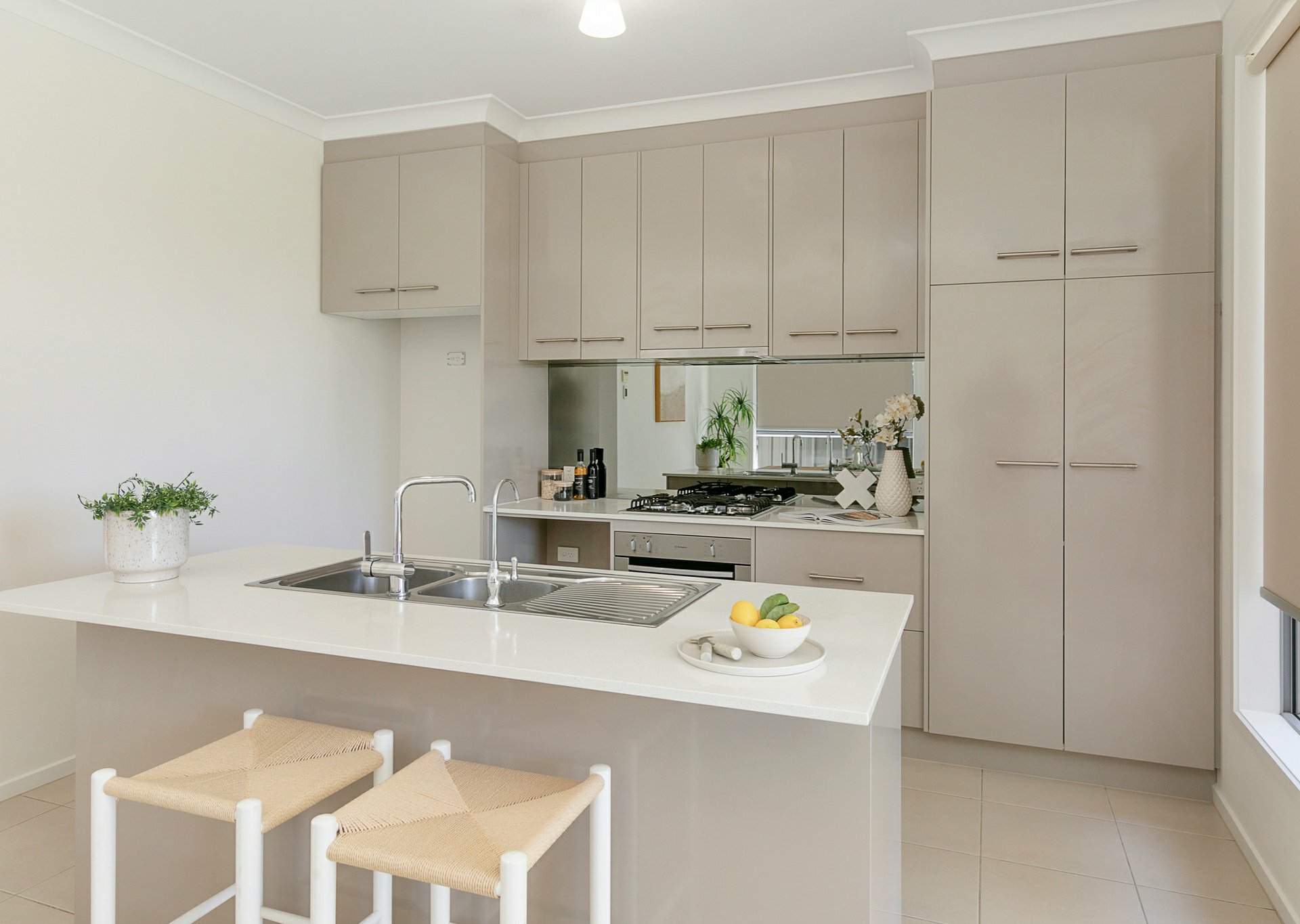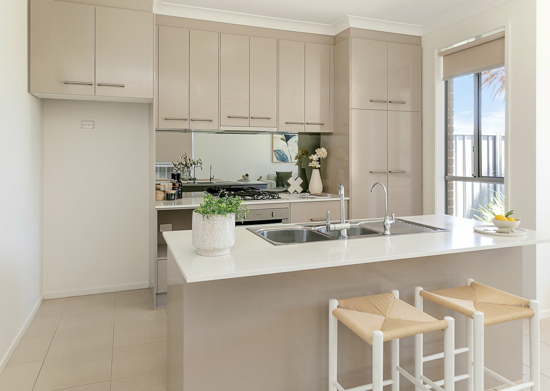 The well-appointed kitchen includes a breakfast bar, stainless steel appliances, dishwasher, filtered water, mirrored splashback and plenty of storage.