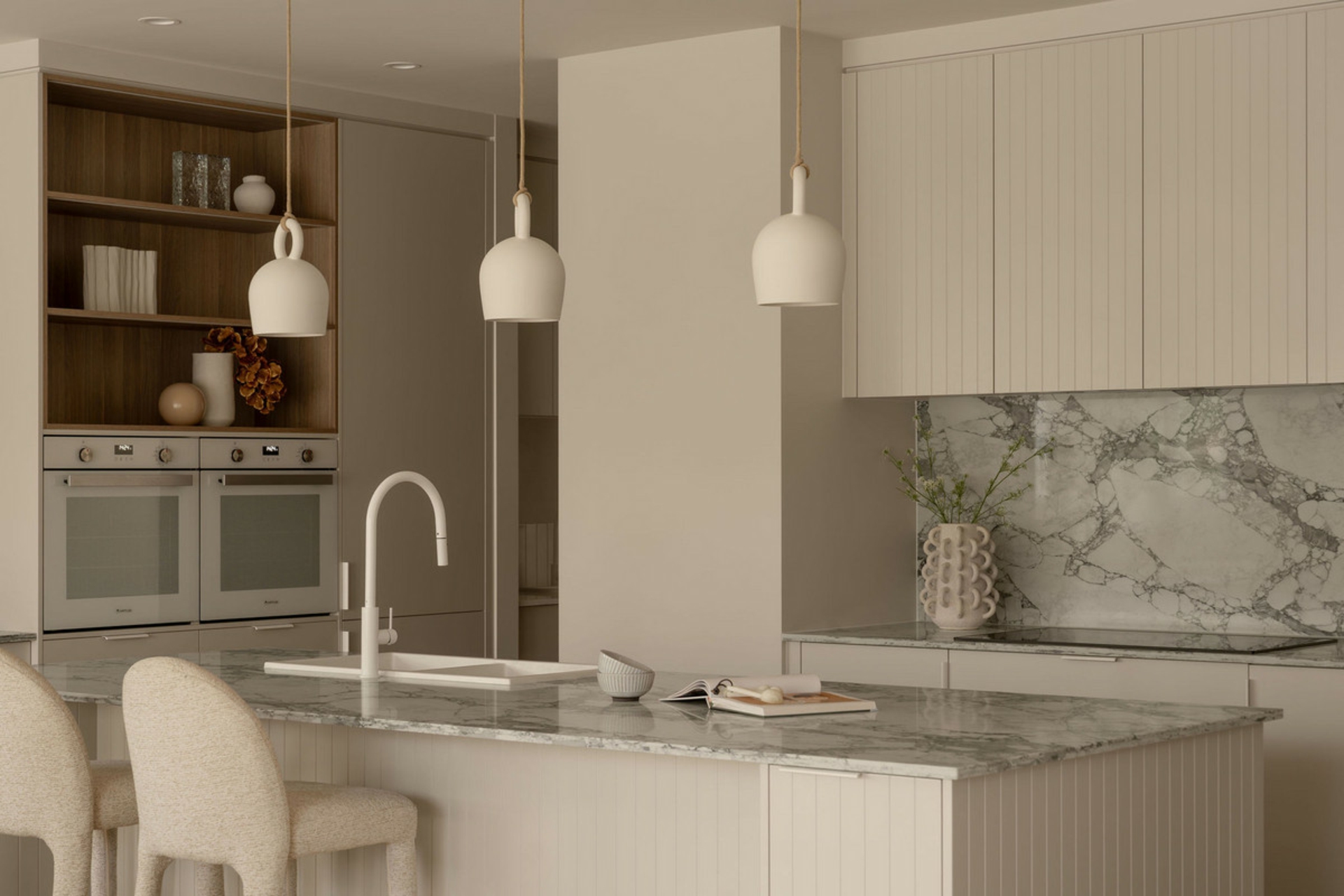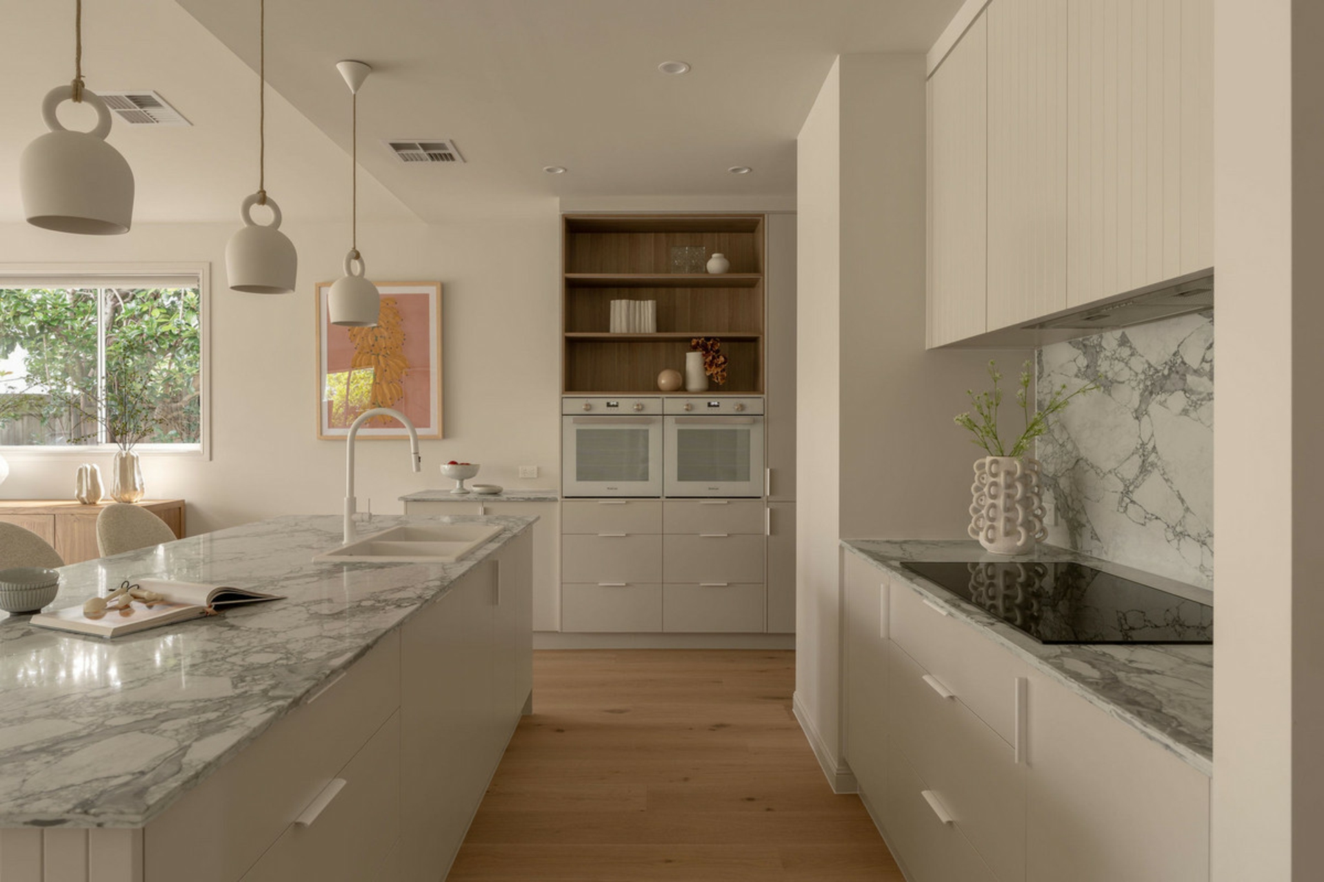 The island bench is finished with a bespoke stone top, continuing to the induction cooktop nook and splashback. VJ panelling and double-sided storage complete this aesthetic masterstroke. Bespoke pendant lighting over the kitchen complements this stunning space.