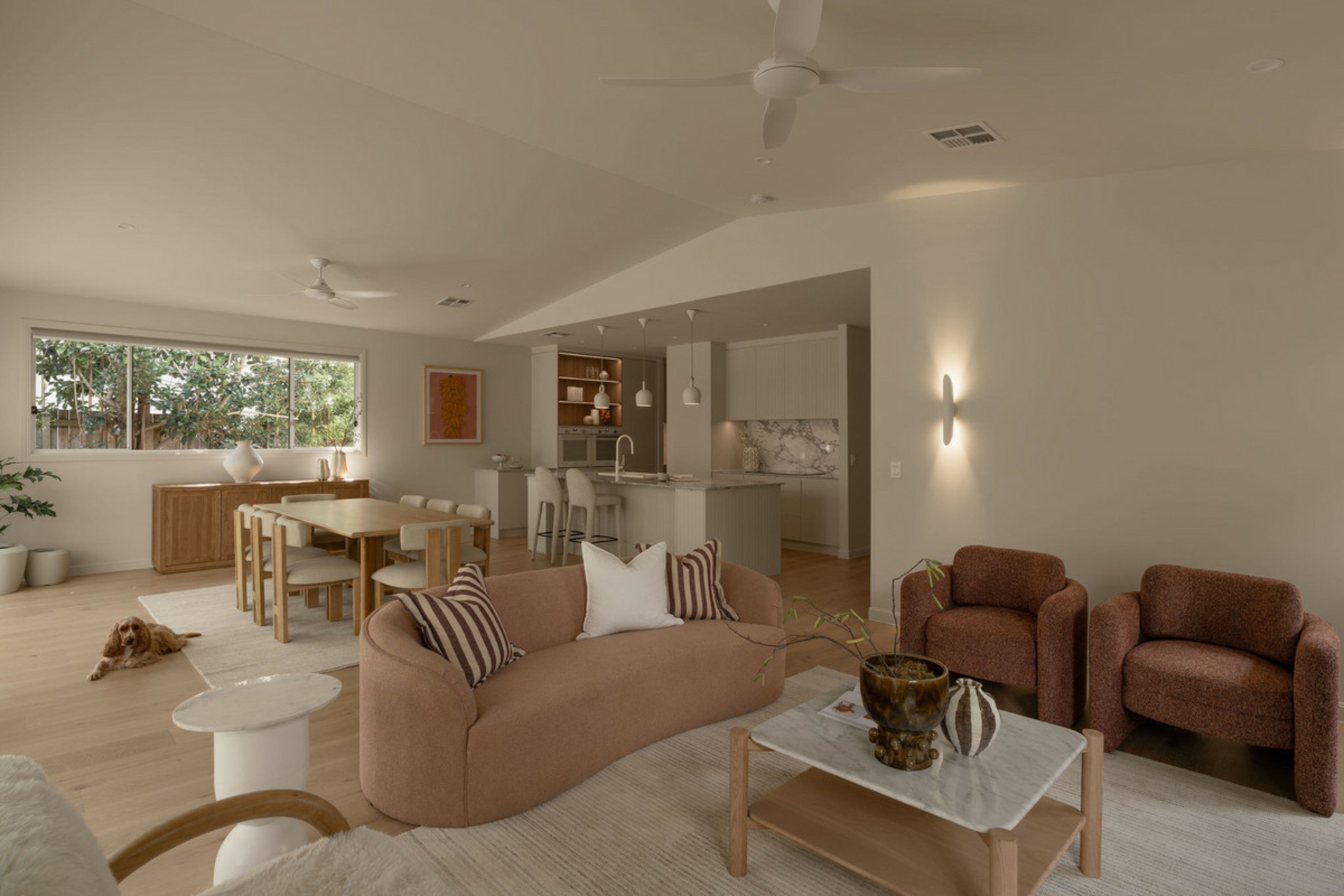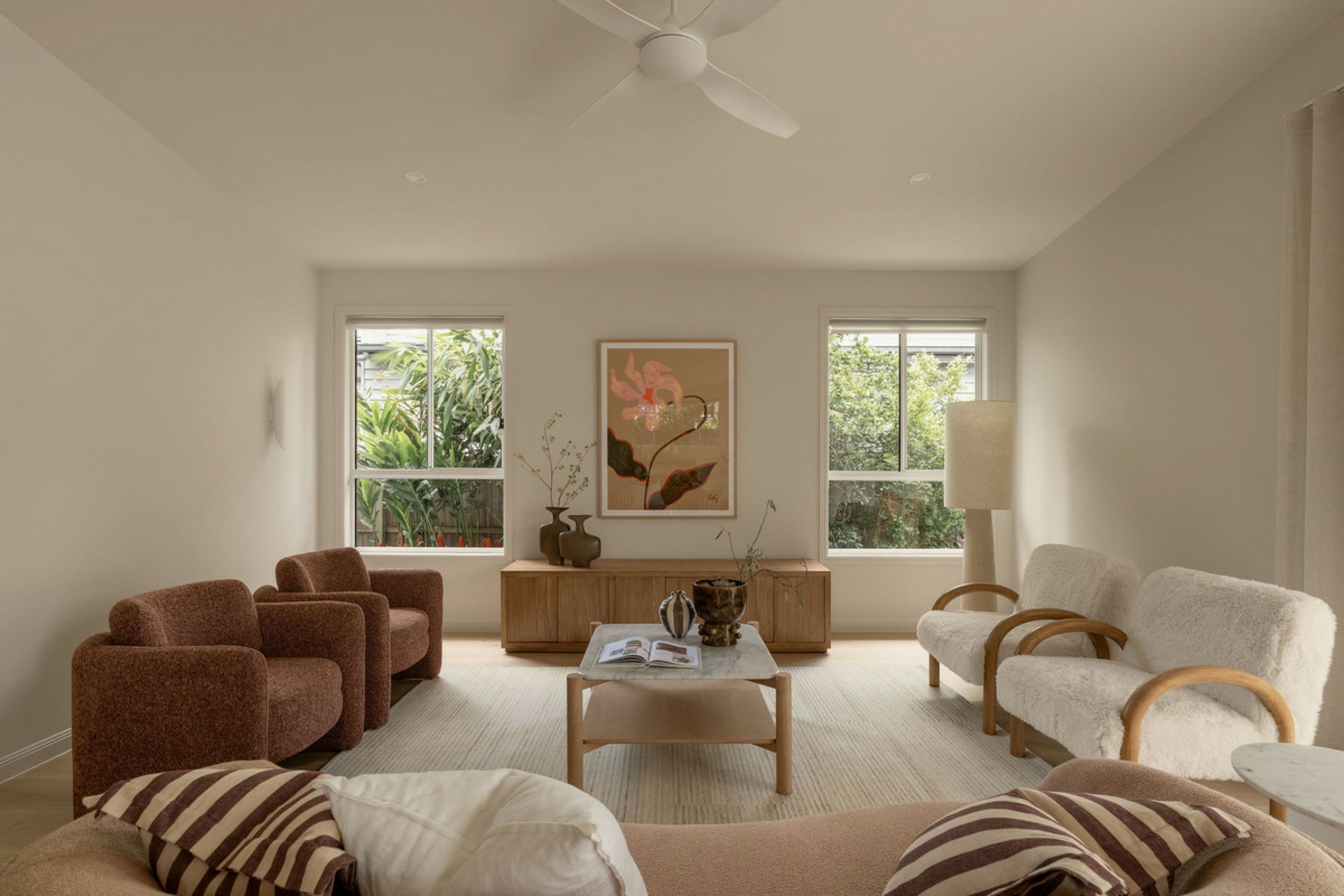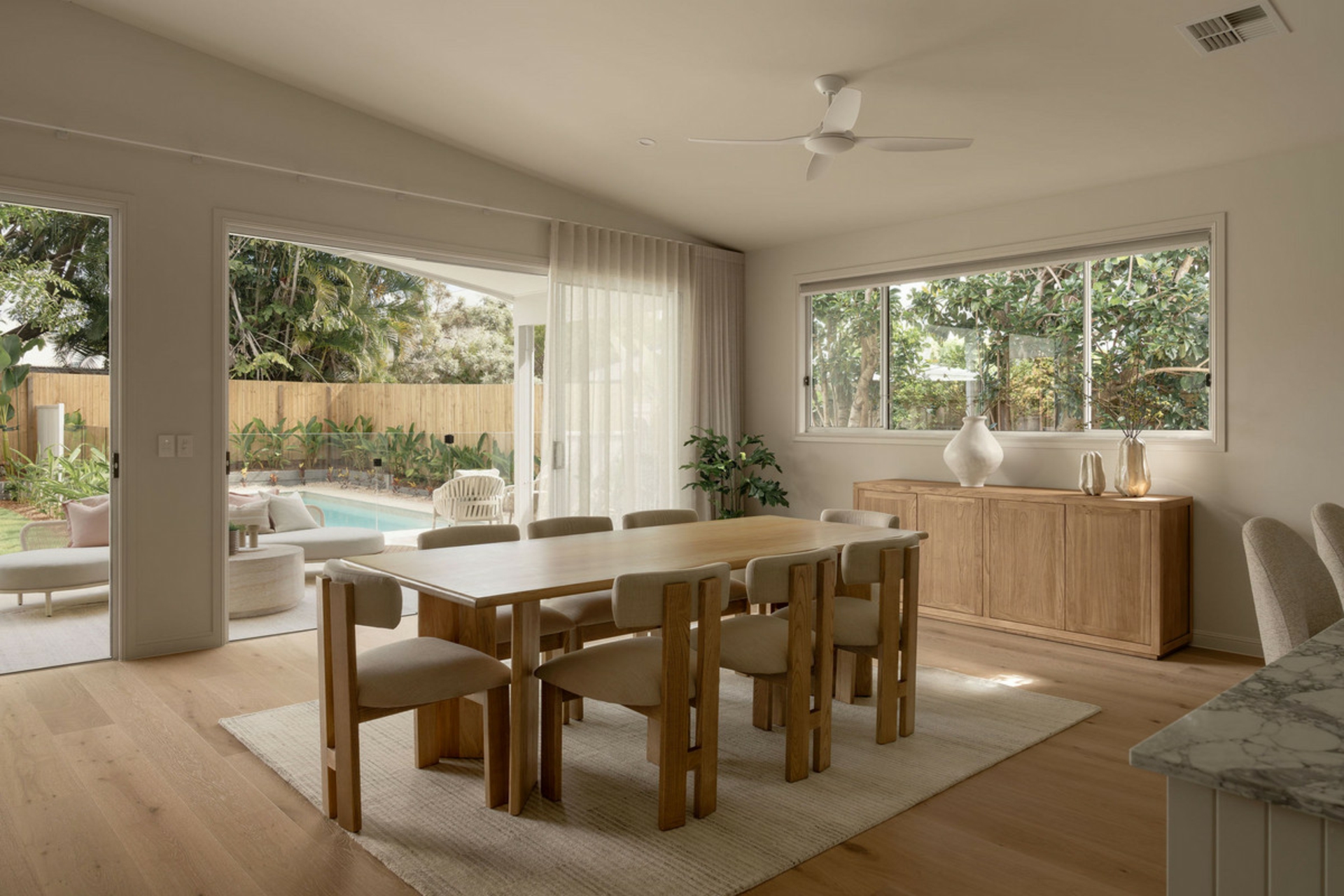 Gazing down this hallway you are immediately connected to yet more greenspace, as you overlook the lush gardens and backyard. It is this connectivity which immediately draws you to the heart of the home, with fixtures and finishes guiding you through as consistent touchpoints: the bespoke inspired pendant lighting, sheer curtains, and blonde-toned flooring visually illuminating the space.