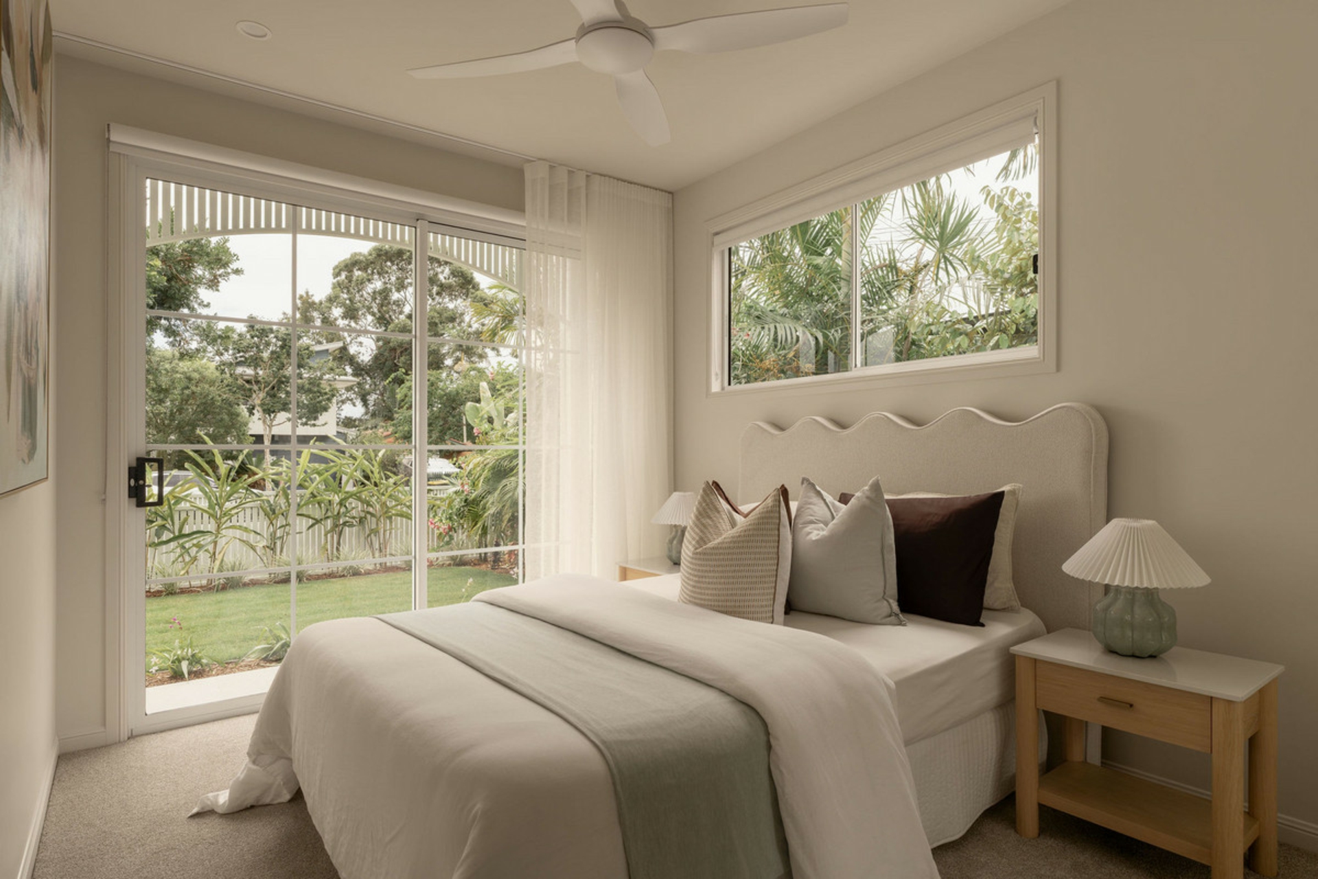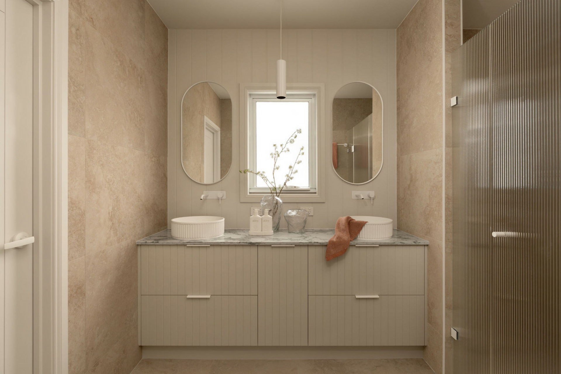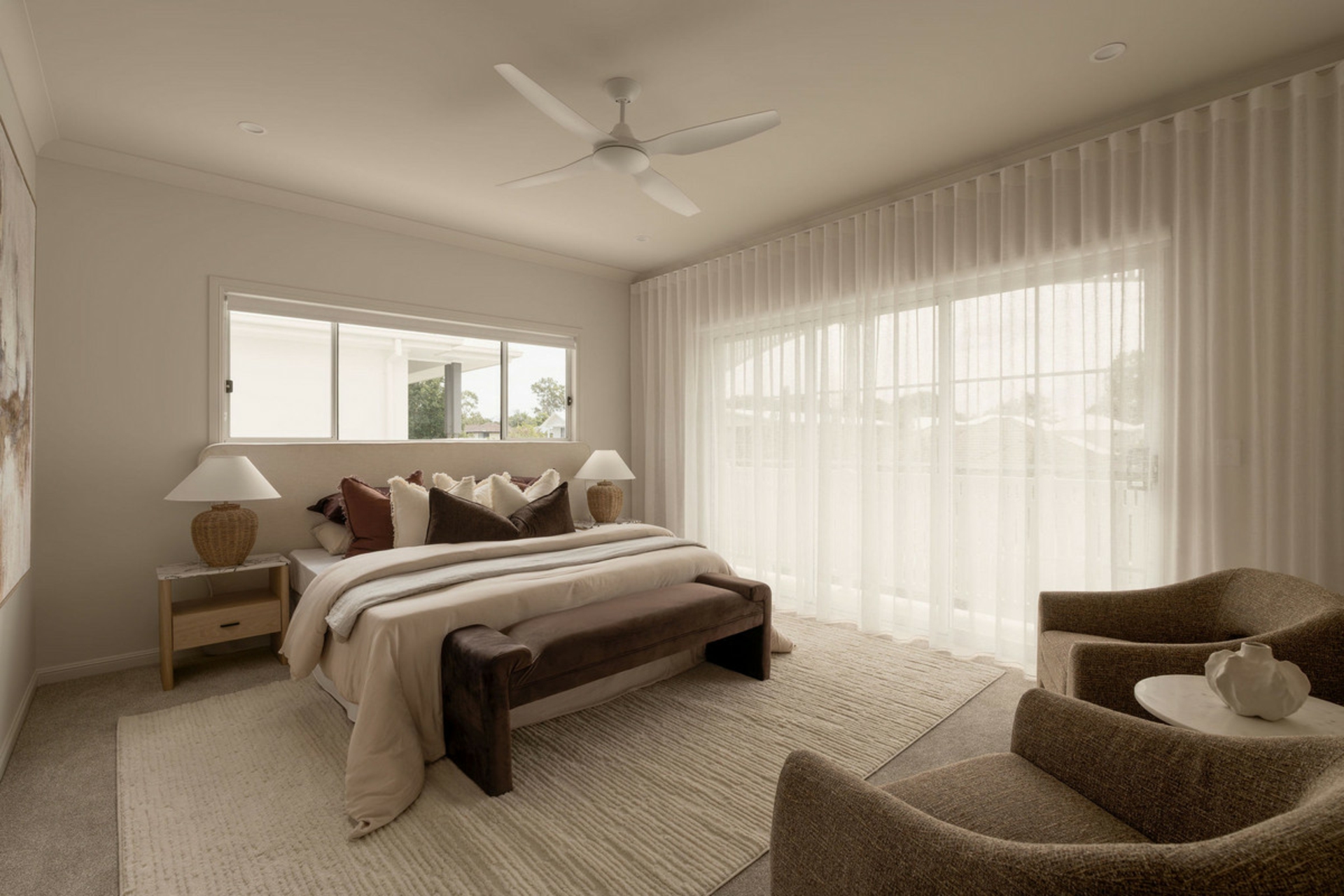 The main bedroom is the parents' escape. Sheer curtains, a lovely balcony which provides air flow, and large walk-in wardrobe create a lovely floorplan. In the ensuite fluted glass shower doors, a double shower, a stone vanity bench and shelf in the shower, VJ cabinetry, statement pendant lighting, and two curved mirrors create a stunning bathroom.