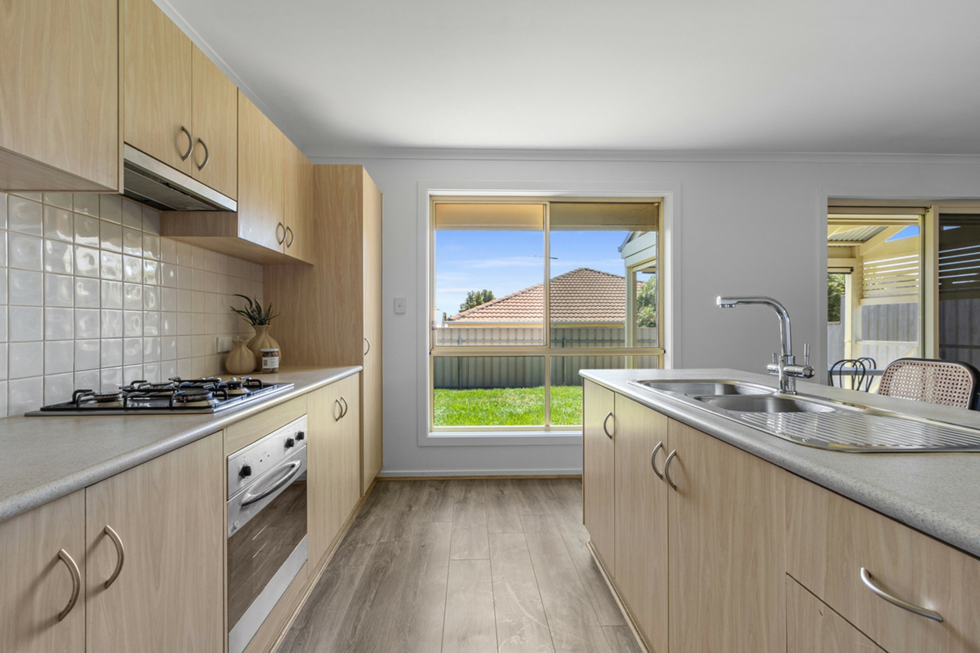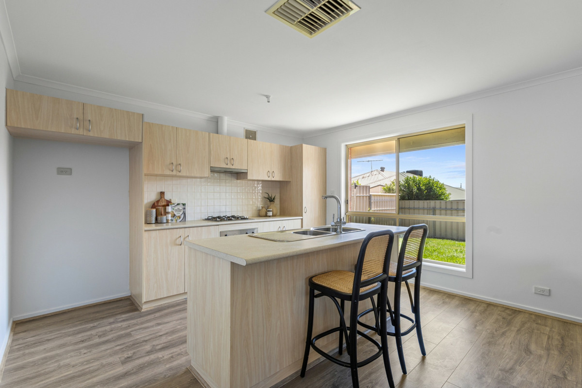 • Well-appointed kitchen featuring gas cooktop, island bench and ample cabinetry for storage.
