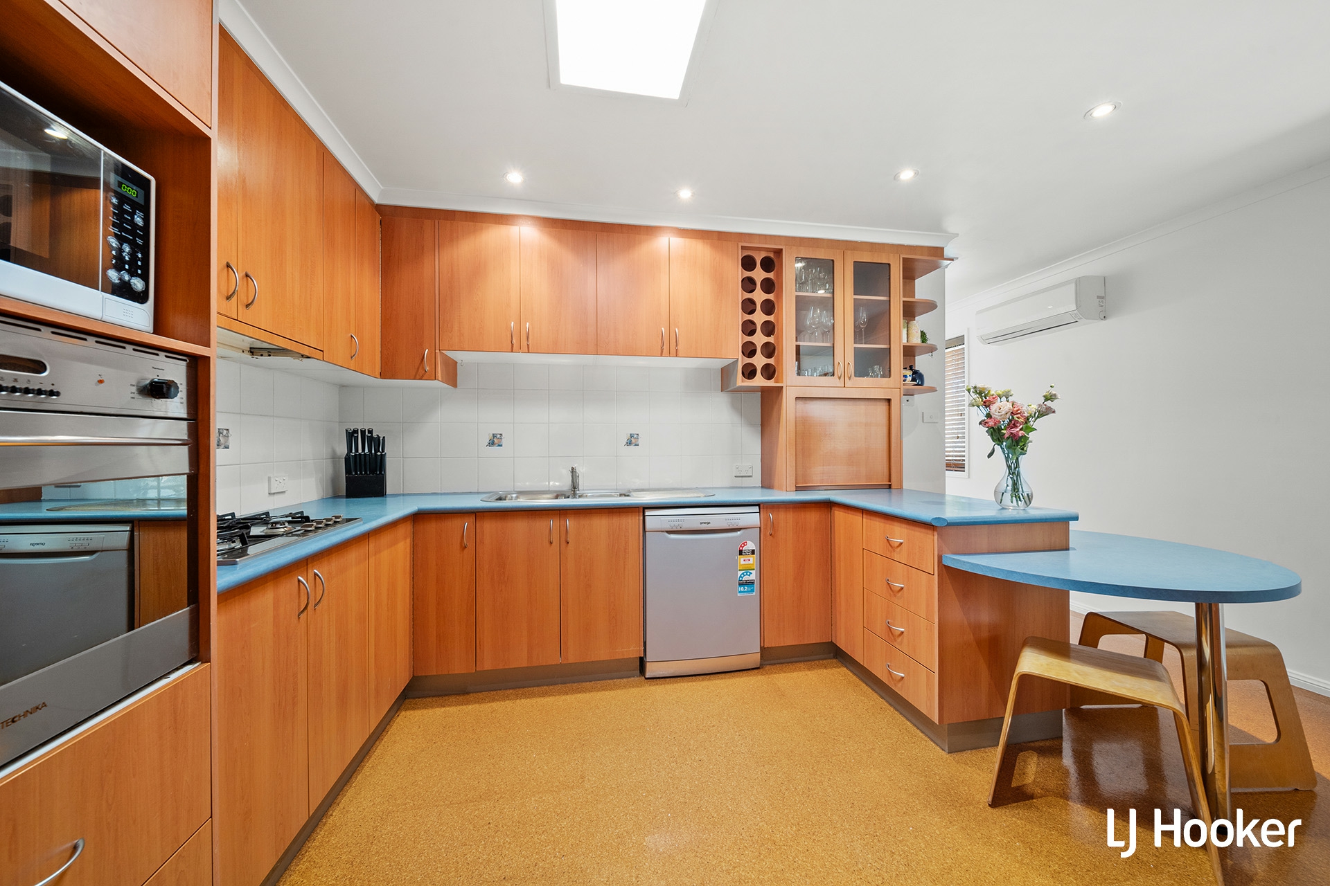 The well-appointed kitchen boasts ample storage and counter space, seamlessly connected to a practical laundry area for added convenience.