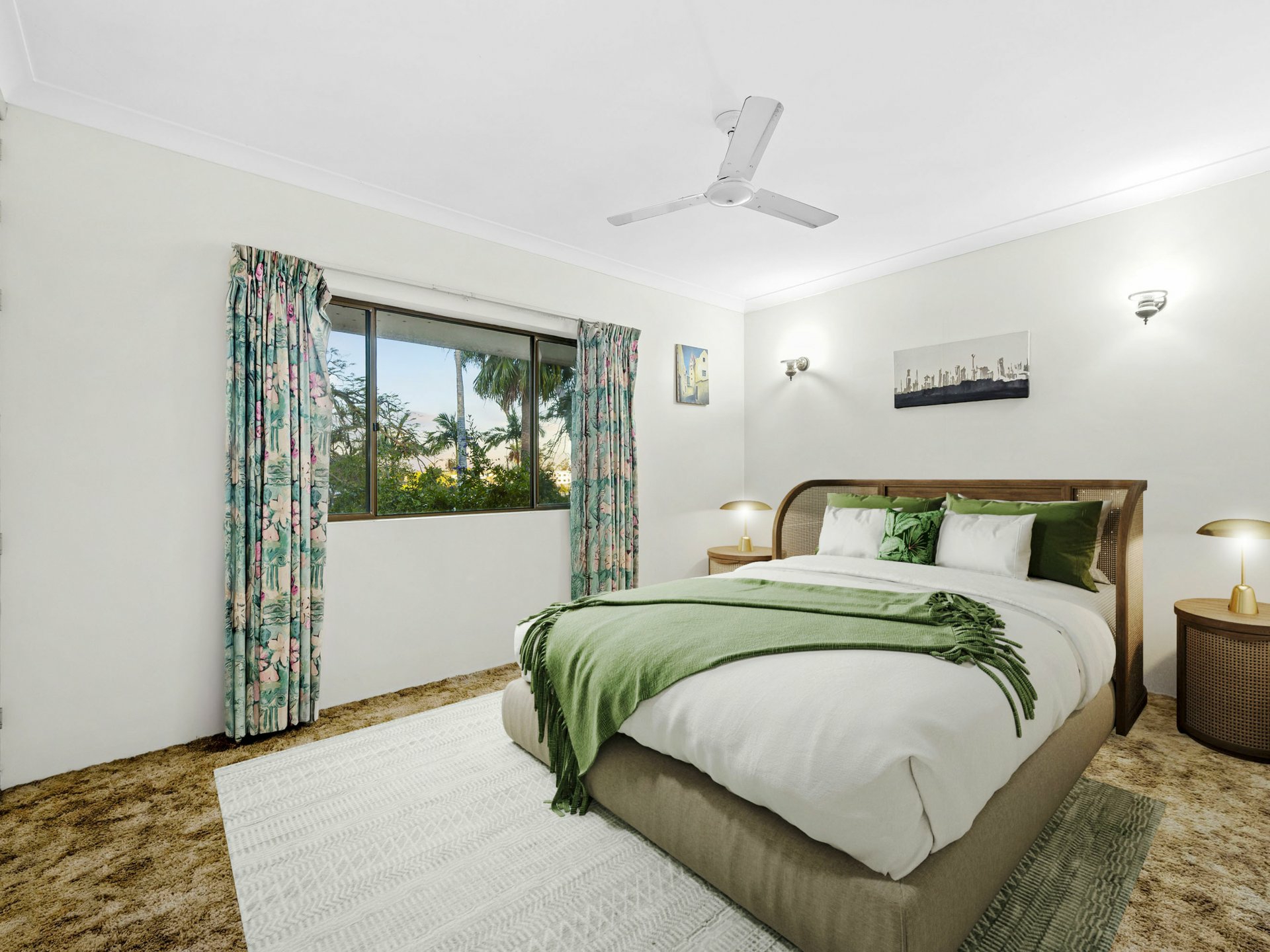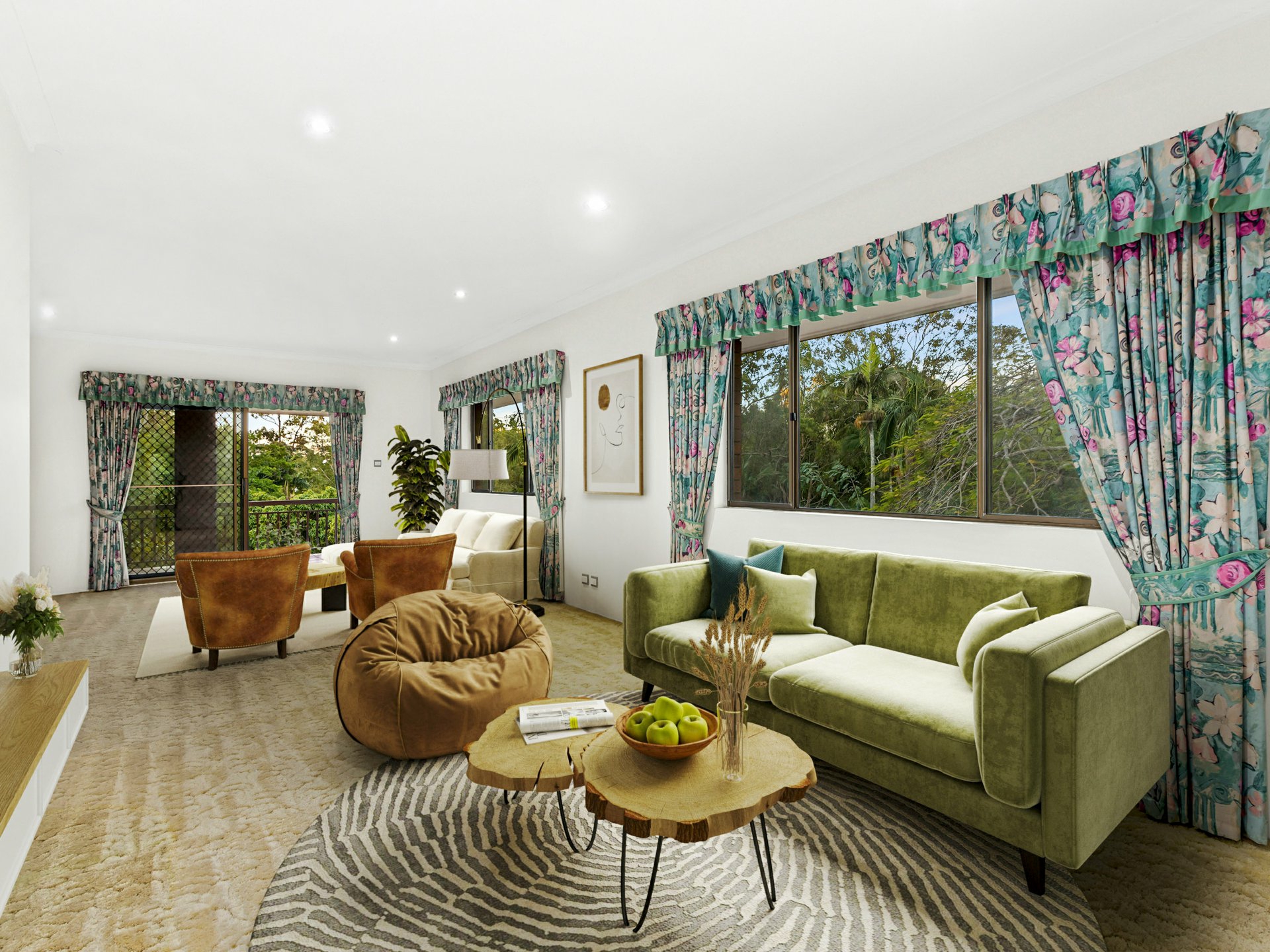 The bedrooms are quietly positioned upstairs and boast ample wardrobe space, leafy outlooks and a mix of private balcony access and ceiling fans. The bathrooms are all in excellent condition, including an oversized spa bath in the main bathroom and dual vanities. Classic charm remains throughout with vintage carpets, curved archways and solid timber accents ready for a modern polish if desired.