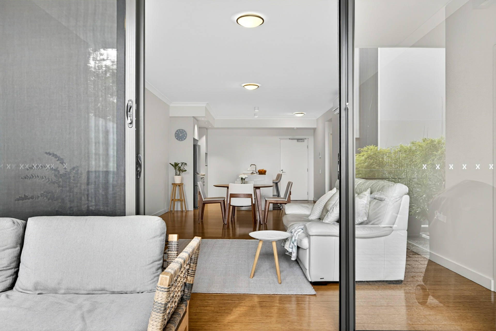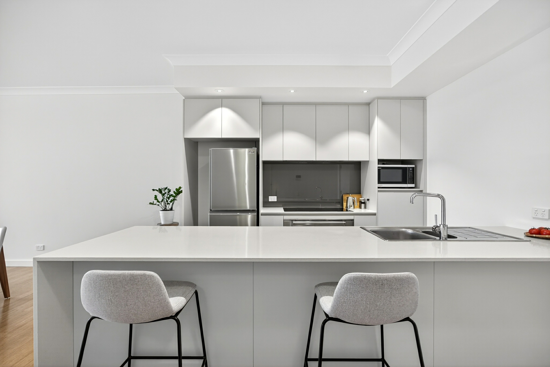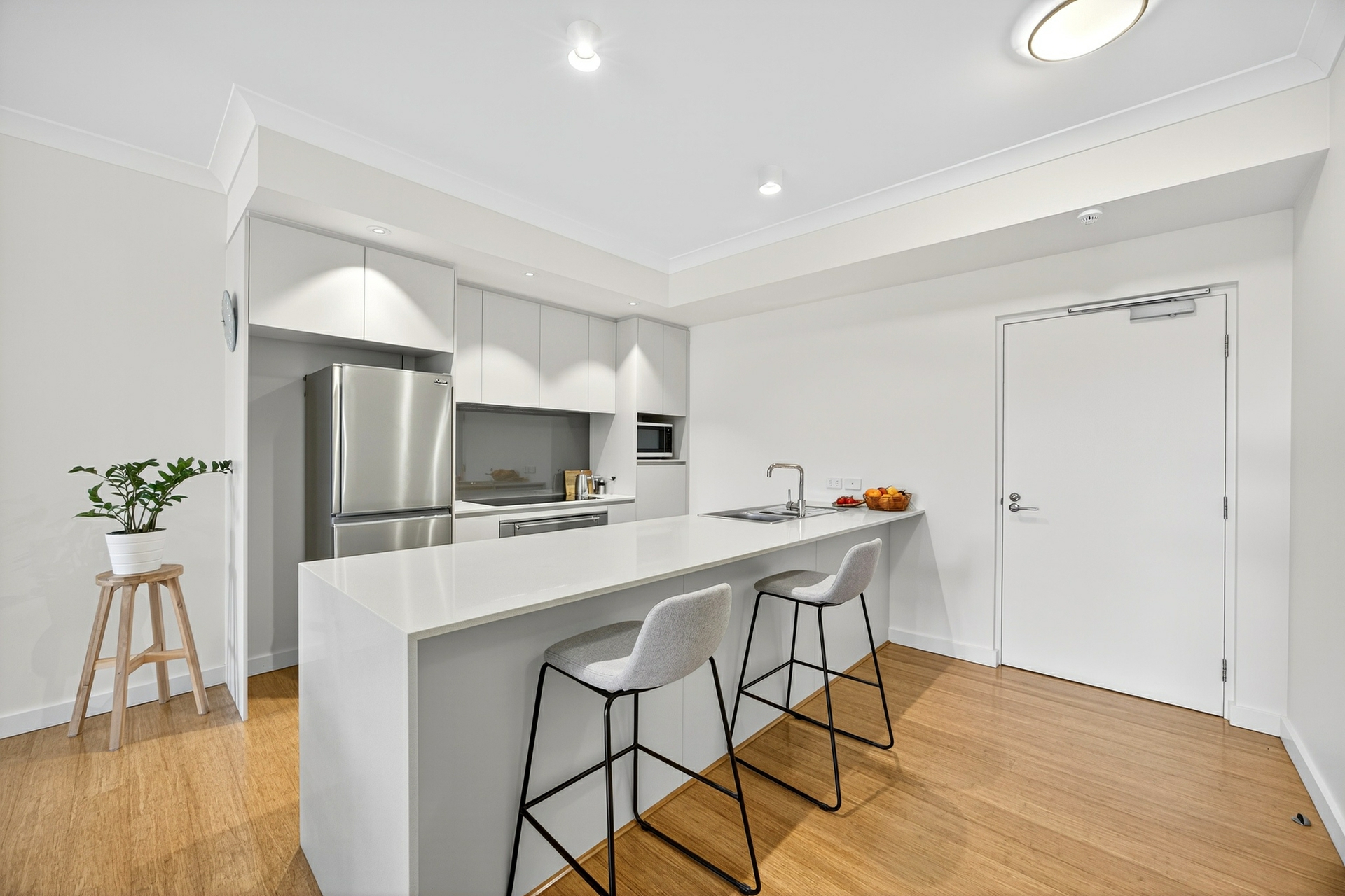 Inside, gleaming bamboo wooden floorboards warm a light open-plan living, dining area, and stylish kitchen. The kitchen with sparkling stone benchtops, glass splashbacks, integrated electric appliances, double sinks, and a microwave nook are perfect to accomodate the lovely alfresco-style entertaining terrace.