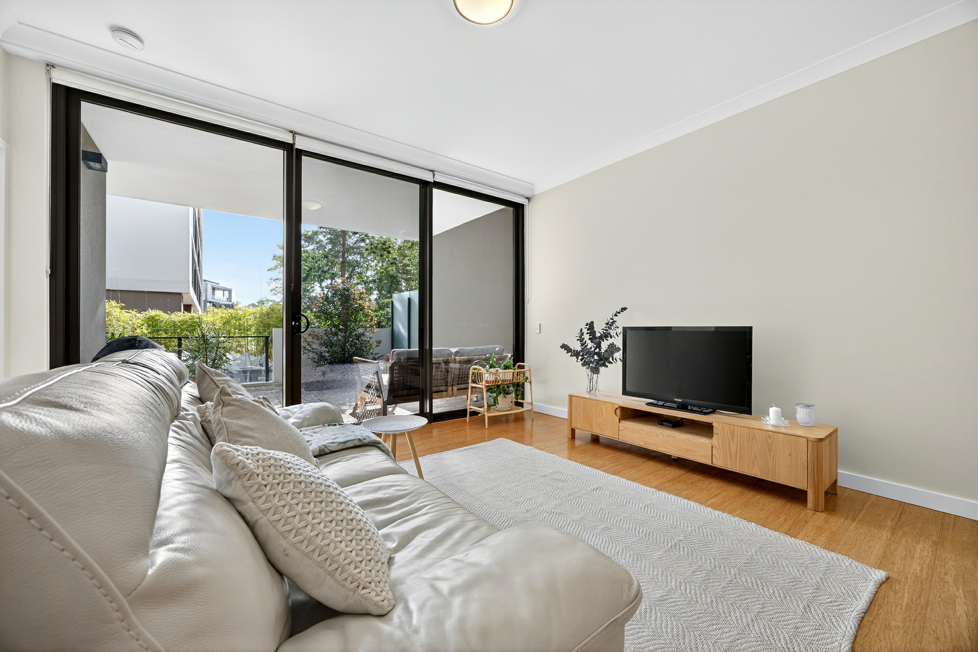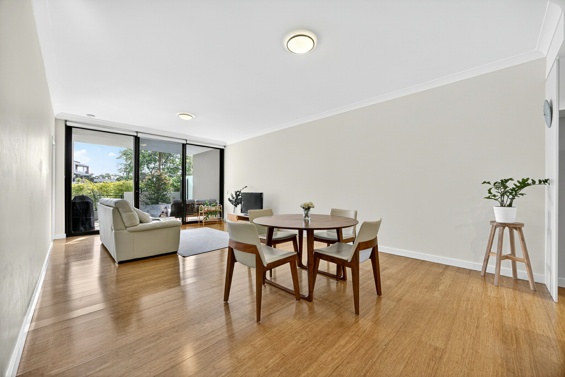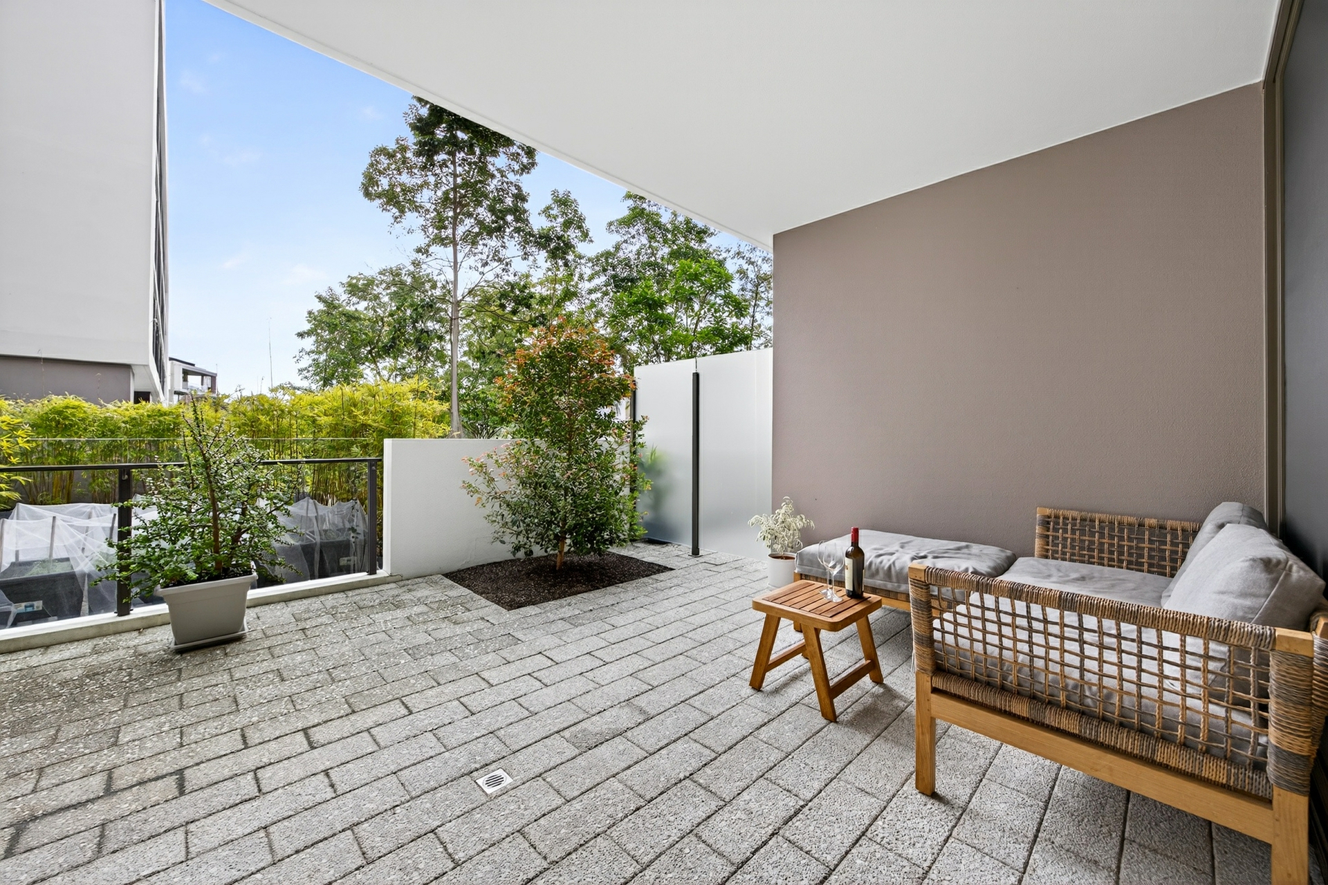 Inside, gleaming bamboo wooden floorboards warm a light open-plan living, dining area, and stylish kitchen. The kitchen with sparkling stone benchtops, glass splashbacks, integrated electric appliances, double sinks, and a microwave nook are perfect to accomodate the lovely alfresco-style entertaining terrace.
