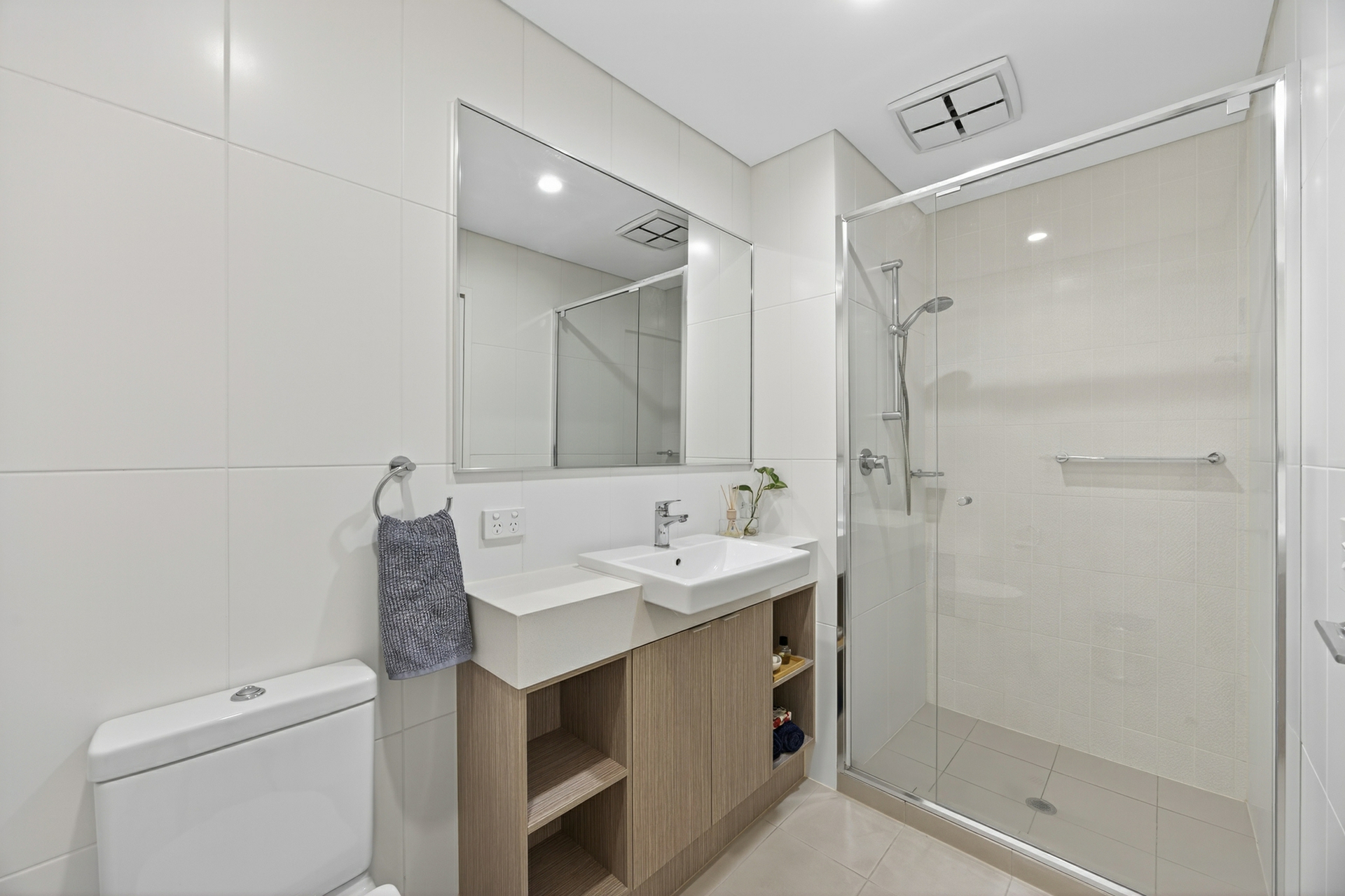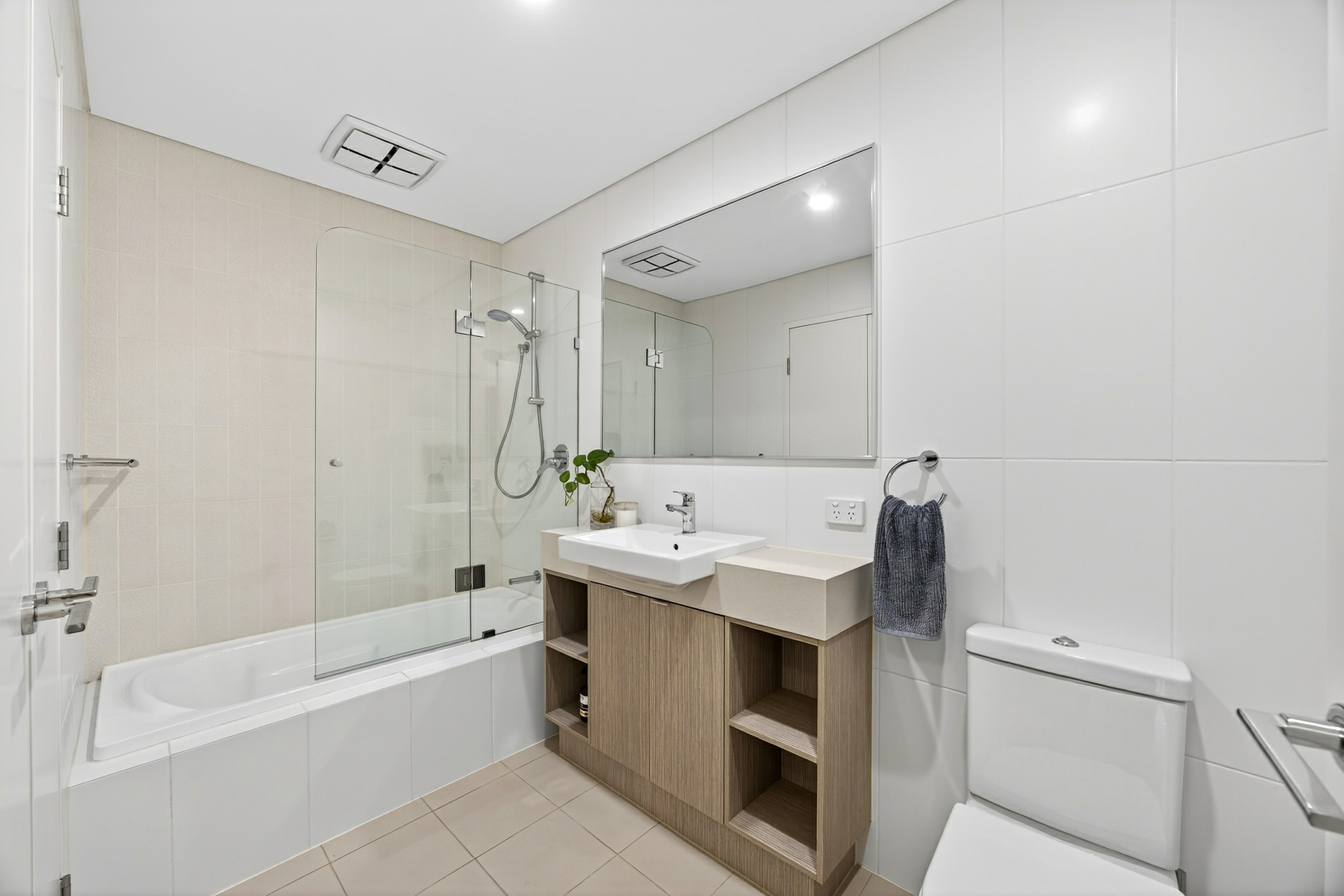 Both bedrooms are carpeted for comfort, with the master suite enjoying its own private ensuite and balcony access. The ensuite has floor-to-ceiling tiling and a walk-in shower, while the second bathroom features the same tiling plus a bathtub with showerhead.