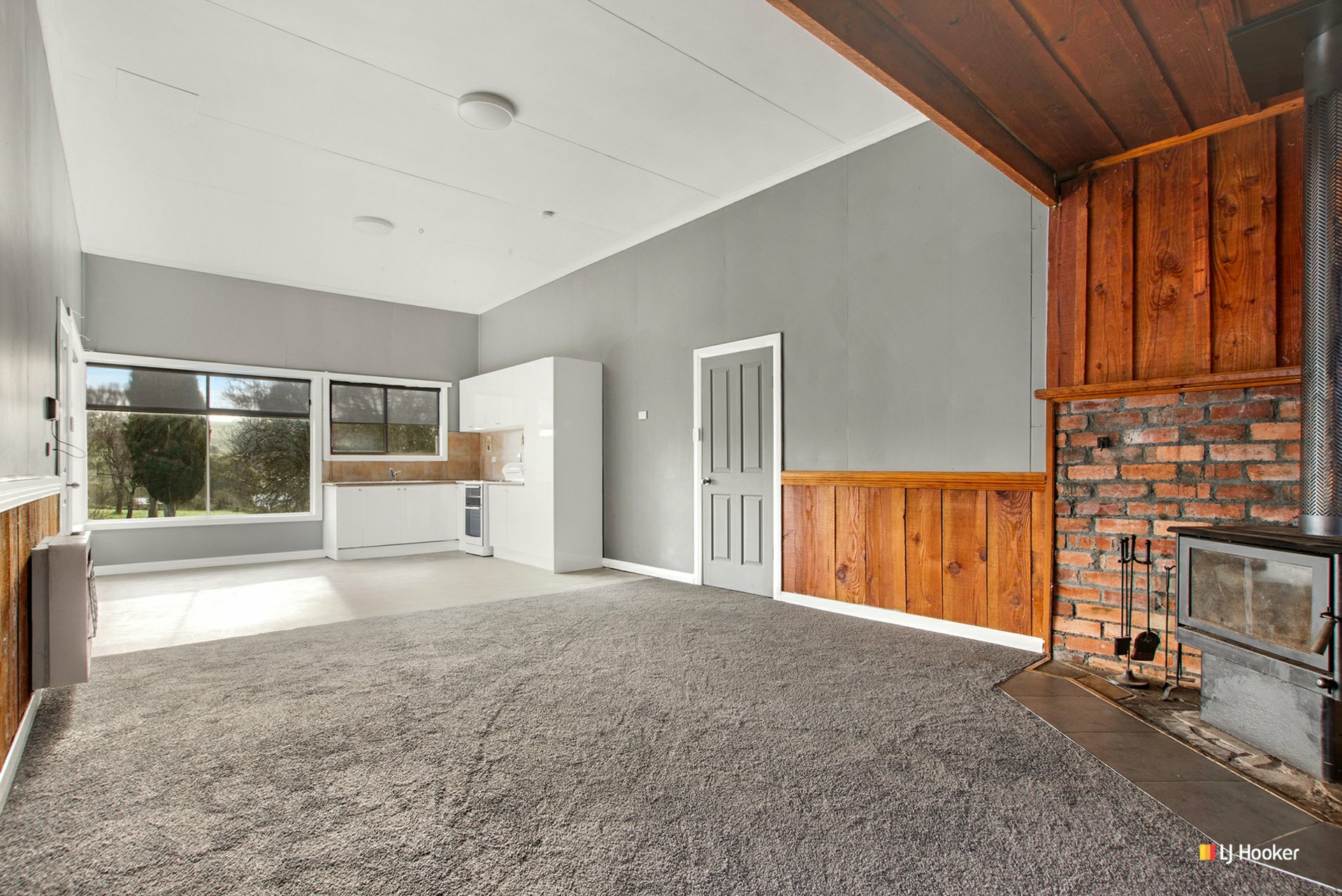 The open-plan kitchen and living area is sunfilled with a lovely outlook over the property. Throughout the cooler months the home is kept warm by wood heating.