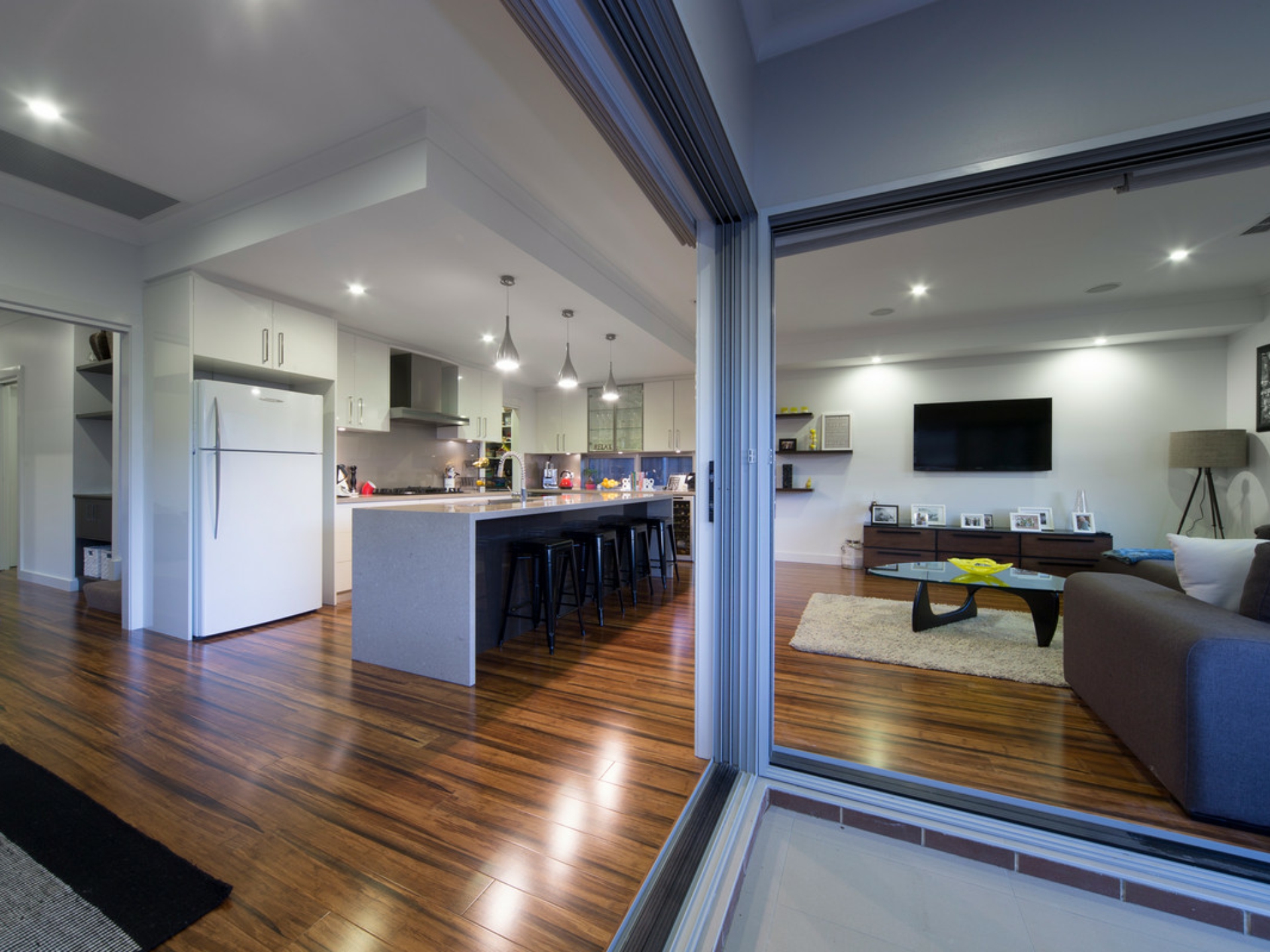 The versatile layout and sense of depth to all the spaces is a testament to thoughtful planning. A formal living room and a rumpus room are both perfect for parents' and kids' quiet time, while a ground-floor bedroom takes care of overnight guests. The three remaining bedrooms are located upstairs, serviced by a pair of luxe bathrooms.
