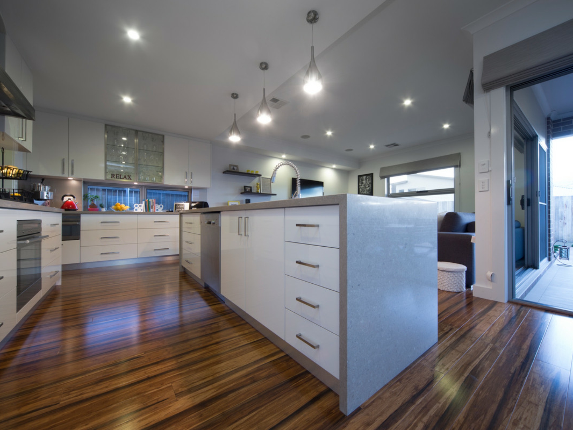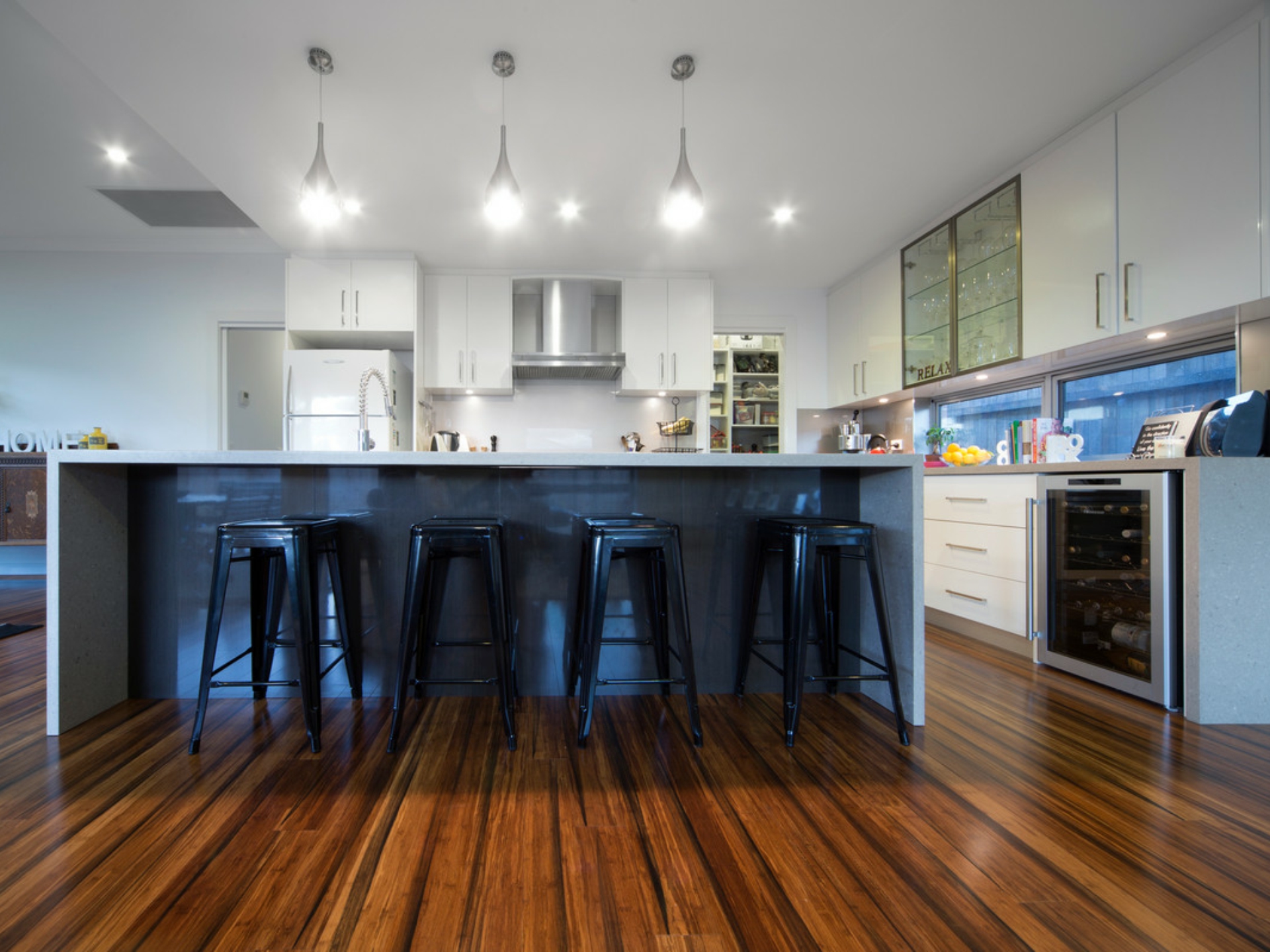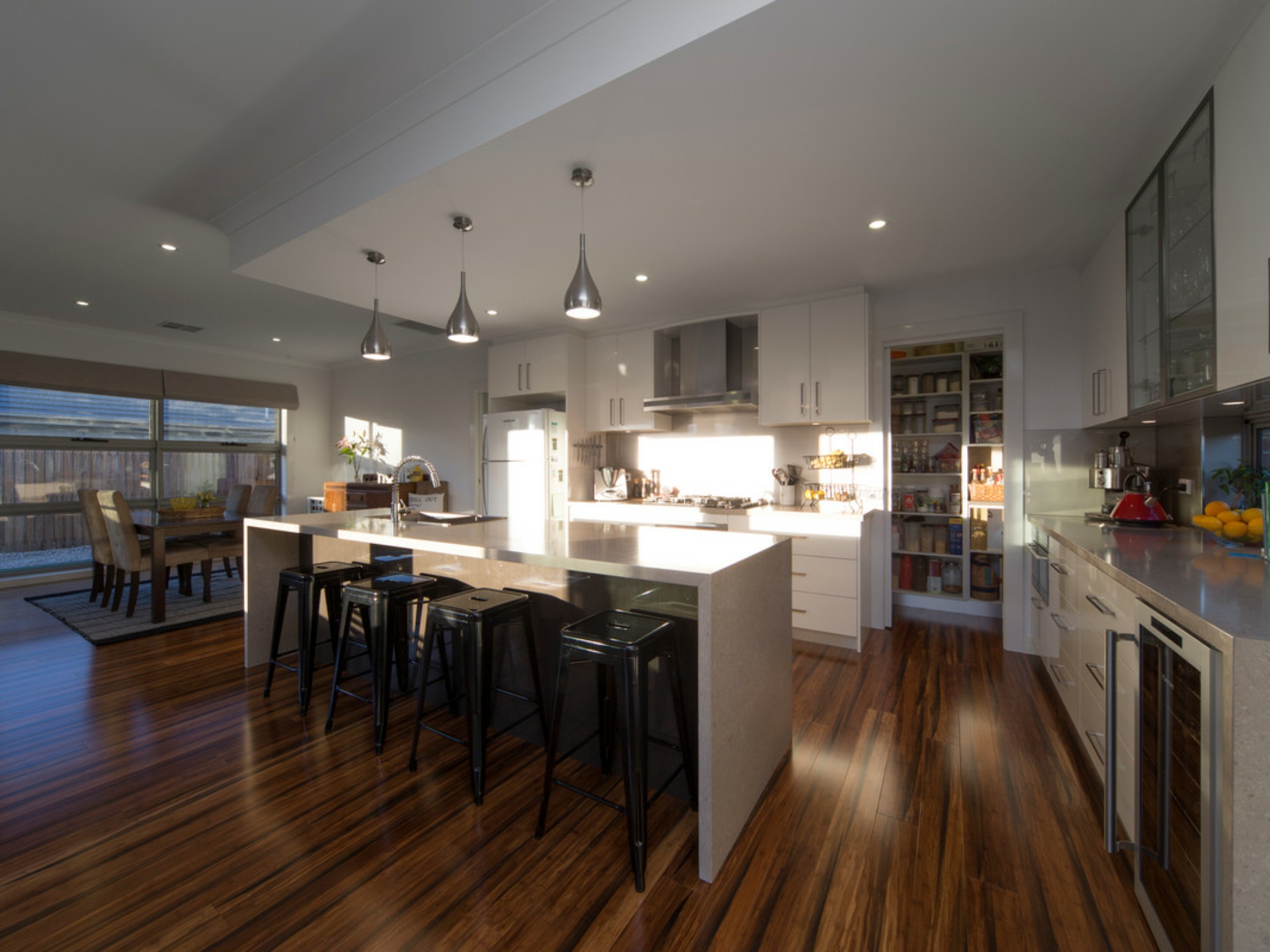Designer kitchen featuring stone waterfall benchtops, stainless-steel appliances, wine fridge and walk-in pantry