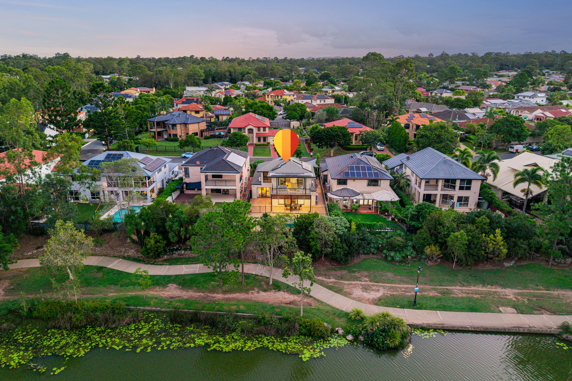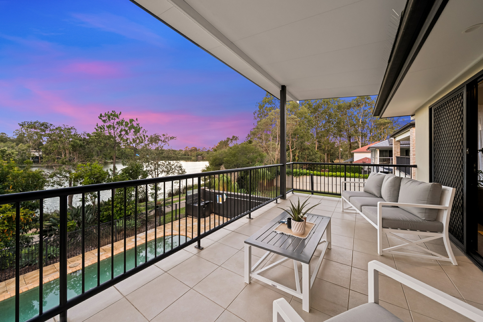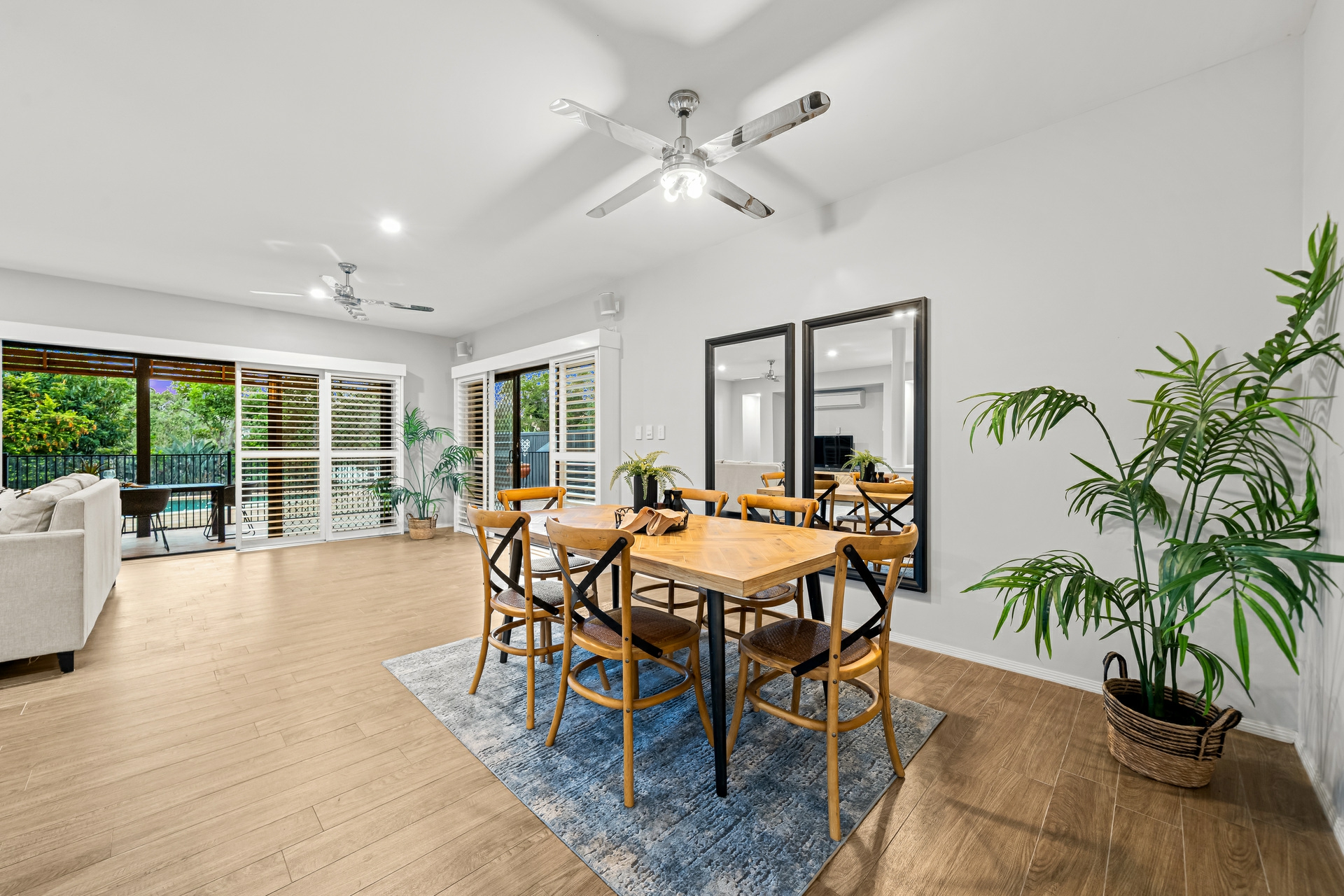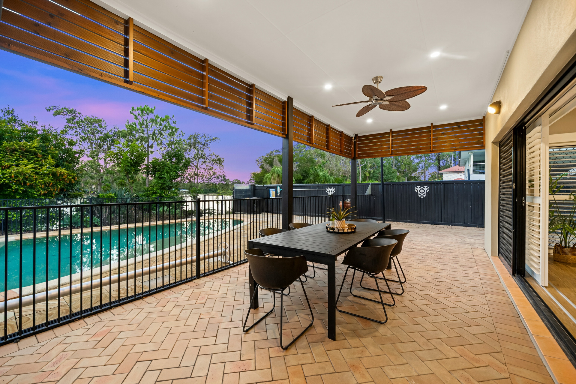 The heart of the home is the expansive open plan living zone with high ceilings, seamlessly integrating the kitchen, dining, and family areas. This space flows effortlessly to the covered rear patio, overlooking the inground pool and capturing tranquil lake views.