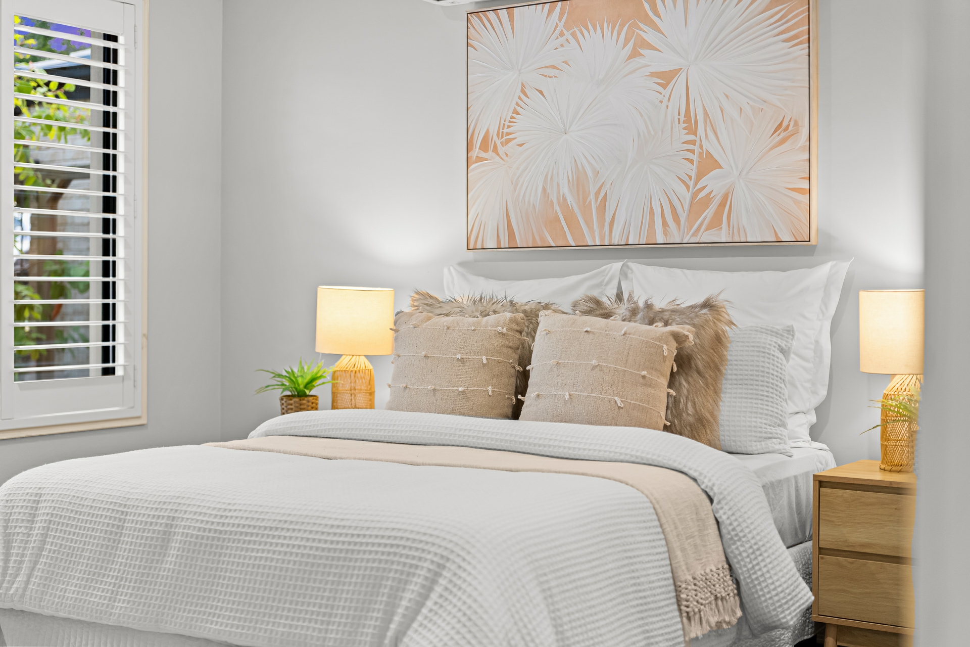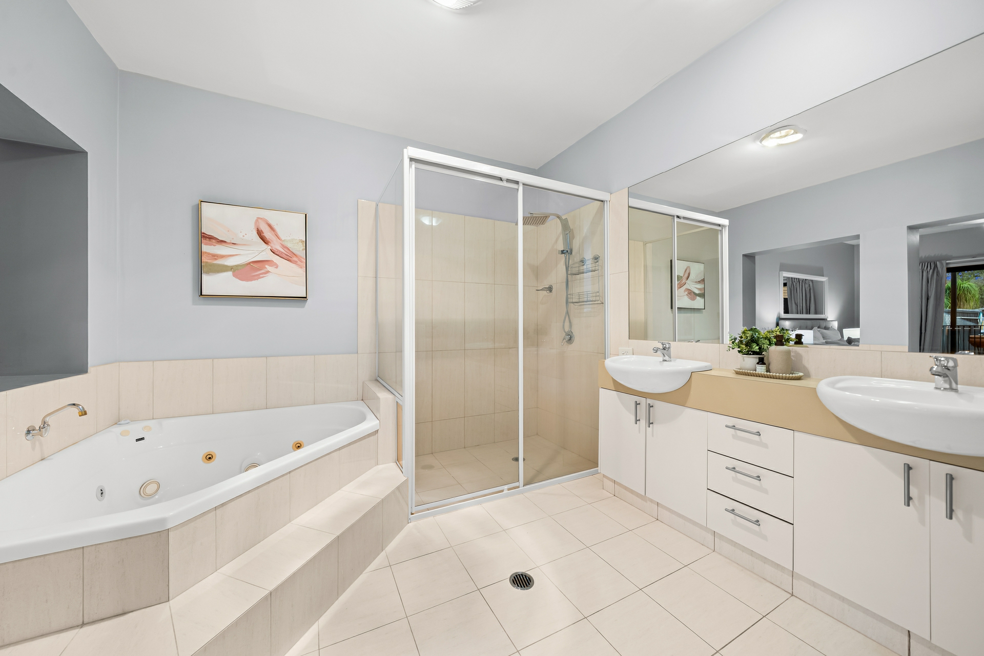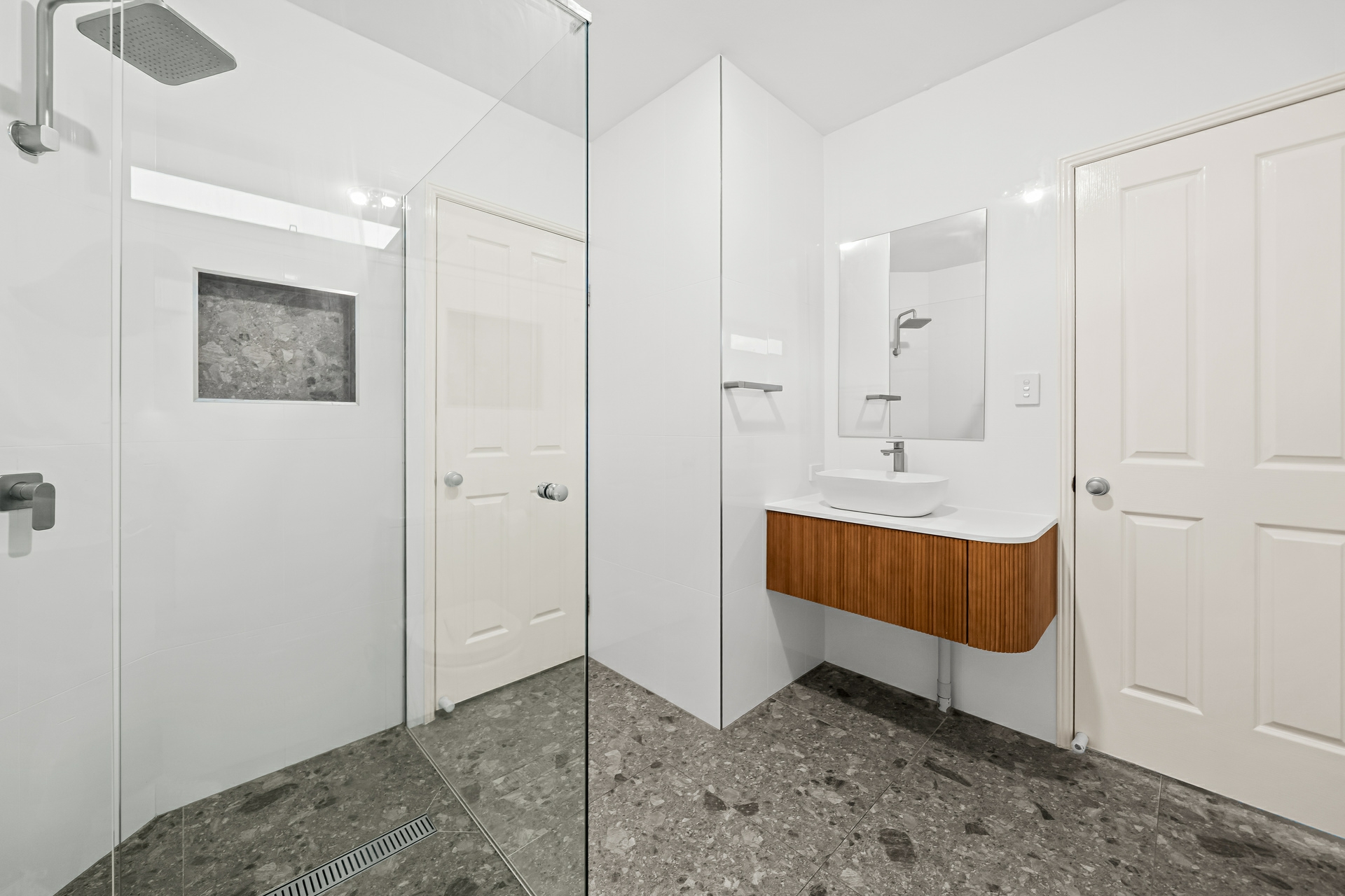 Downstairs features a highly functional layout, including two bedrooms, one being the primary bedroom offering his and hers robes and a well-appointed ensuite with a separate bath and shower.