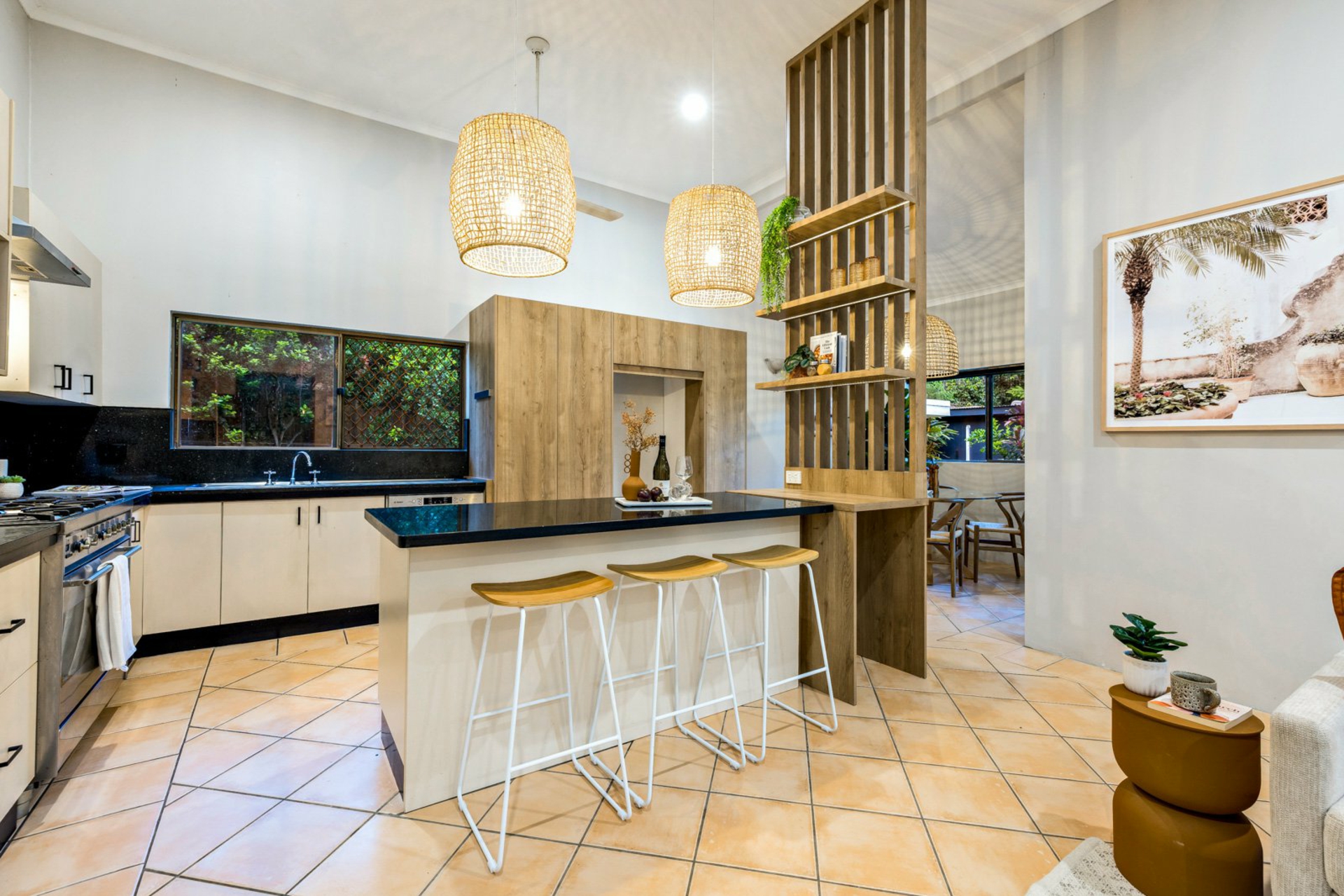 At the heart of the home is the modernised kitchen, complete with island bench, ample storage, stainless steel appliances, stone benchtops, integrated space for a bar fridge and a bird's eye view of the pool.