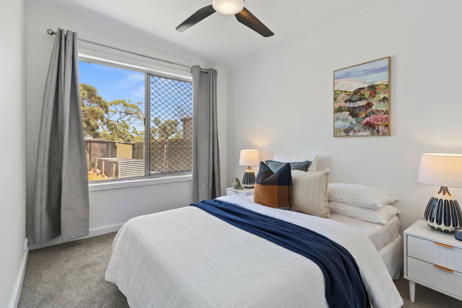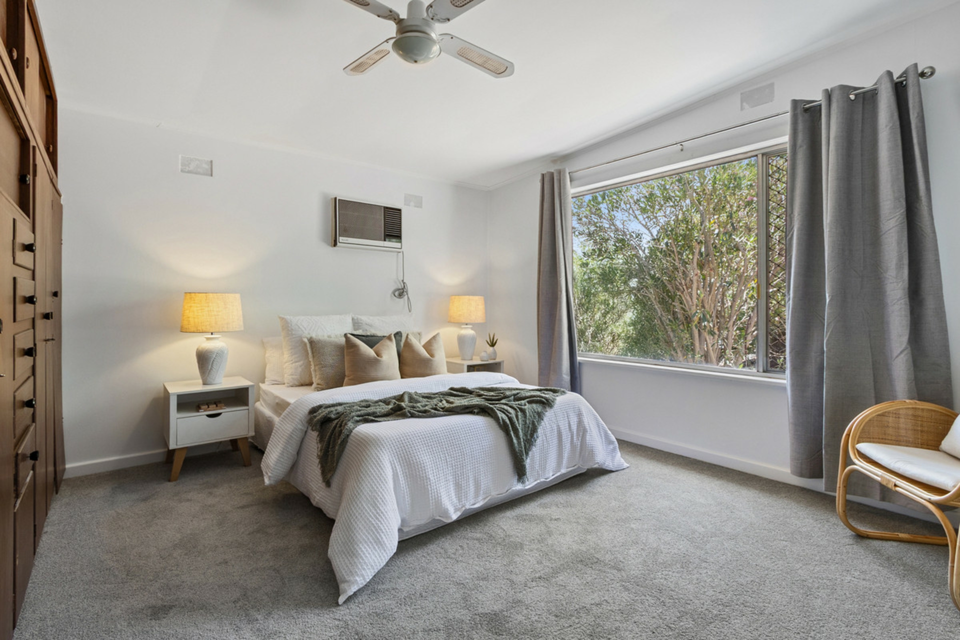 • Main bedroom with ceiling fan, wall unit air conditioner and built-in robe.