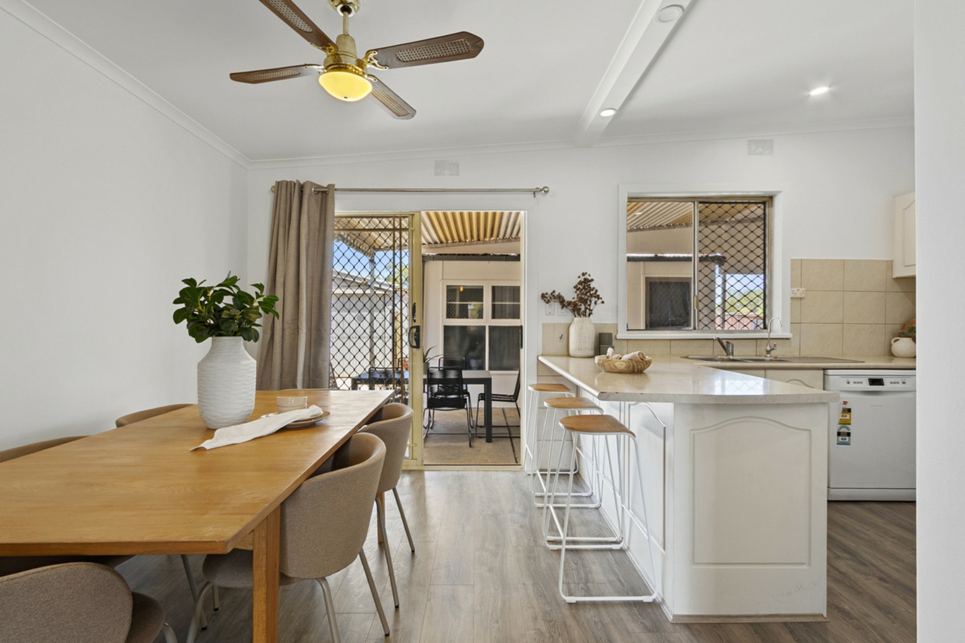 • Kitchen complete with ample cabinetry, breakfast bar and ceiling fan.