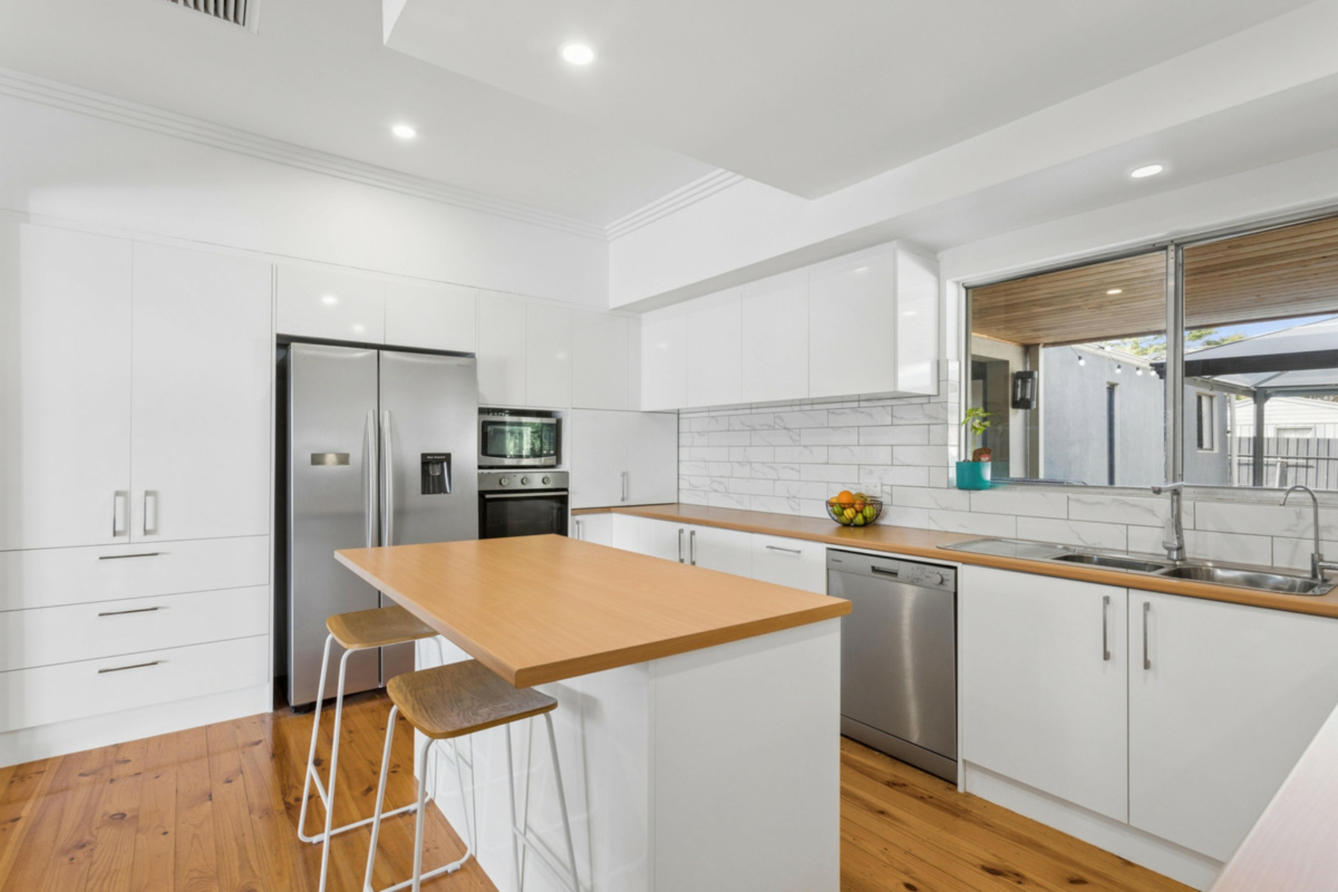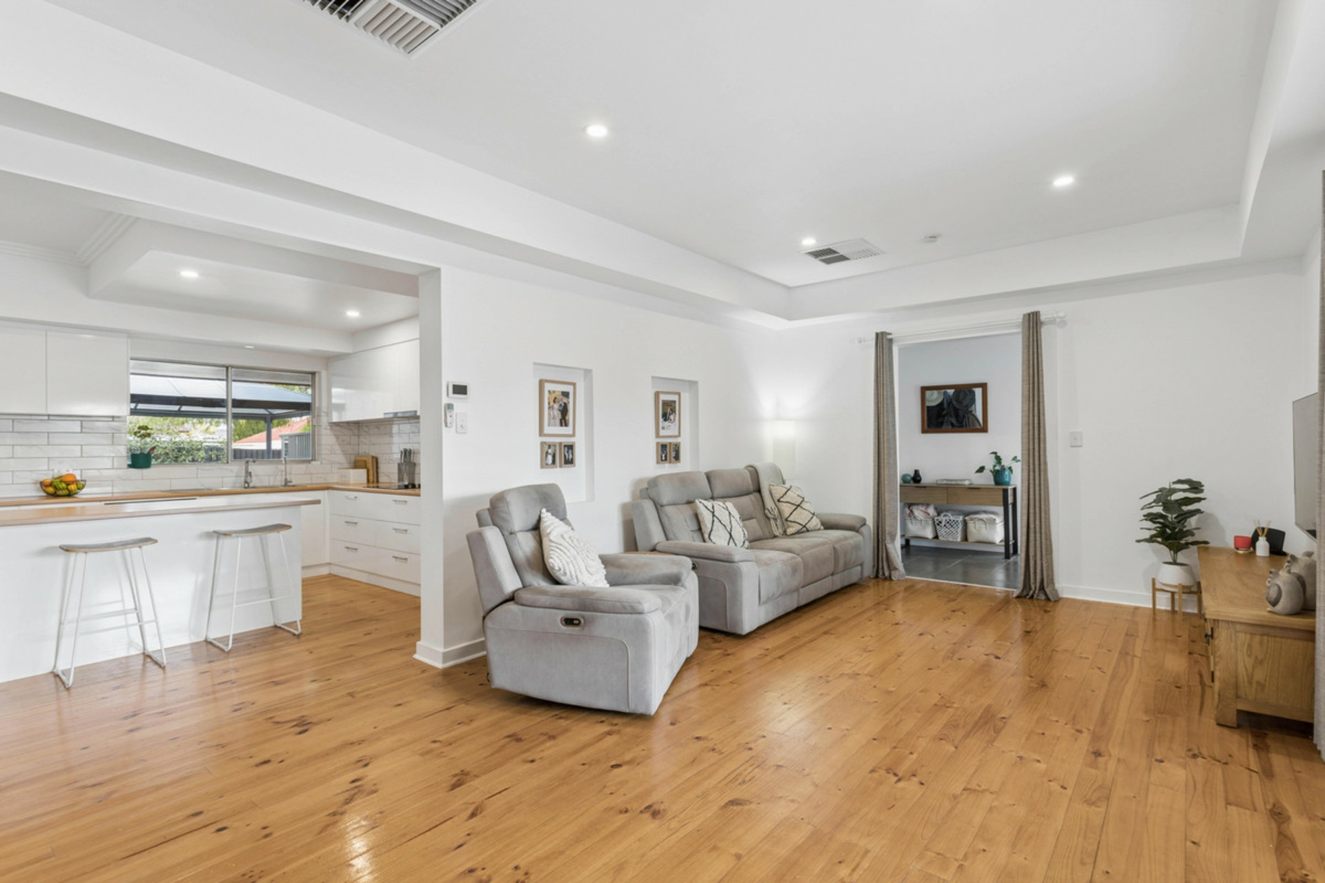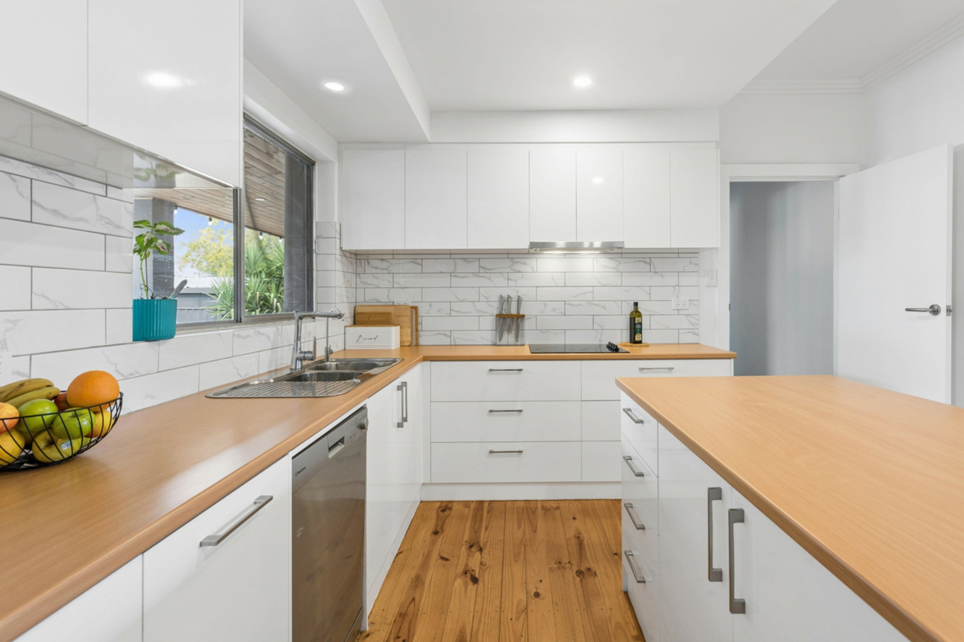 • Central updated kitchen with feature tiled splash back, ample storage, large breakfast bar and electric cooktop
