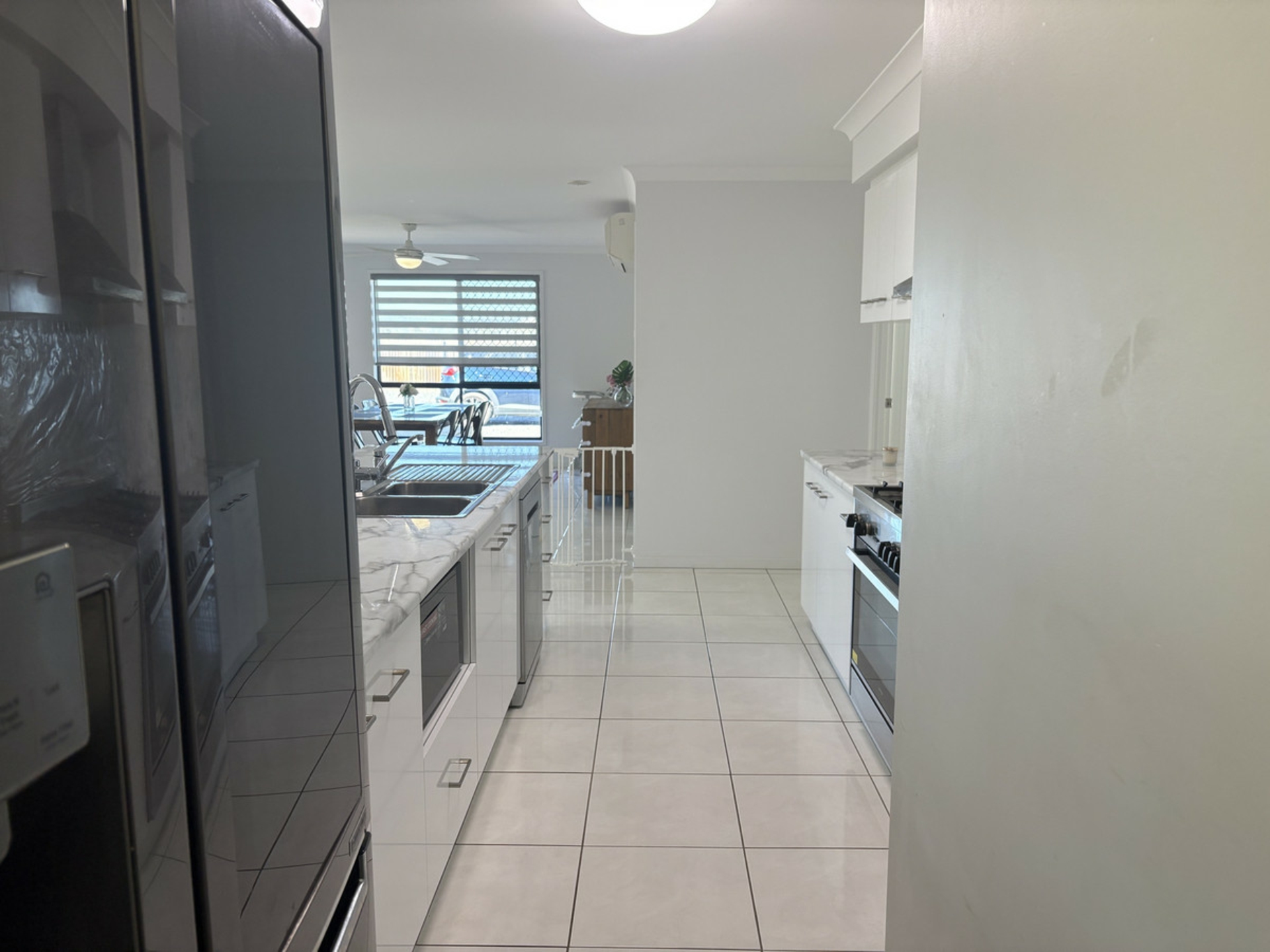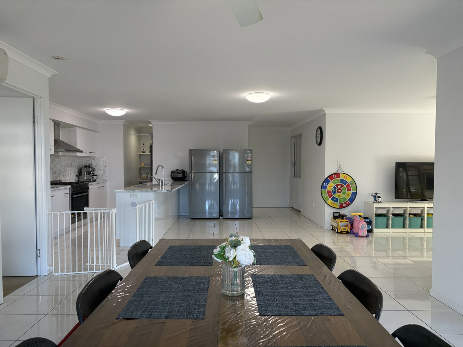 - Expansive open-plan living areas with white tile flooring and natural light